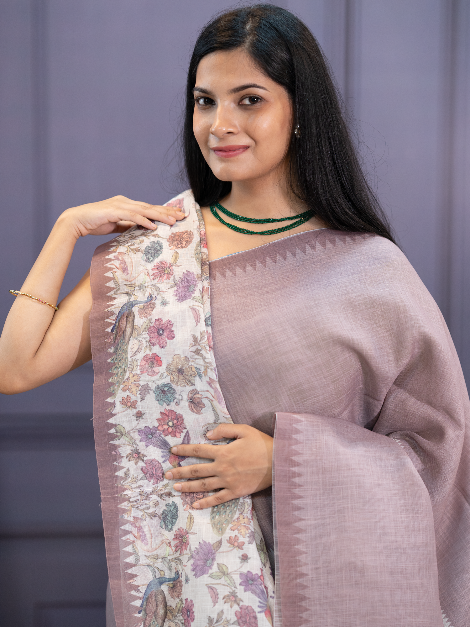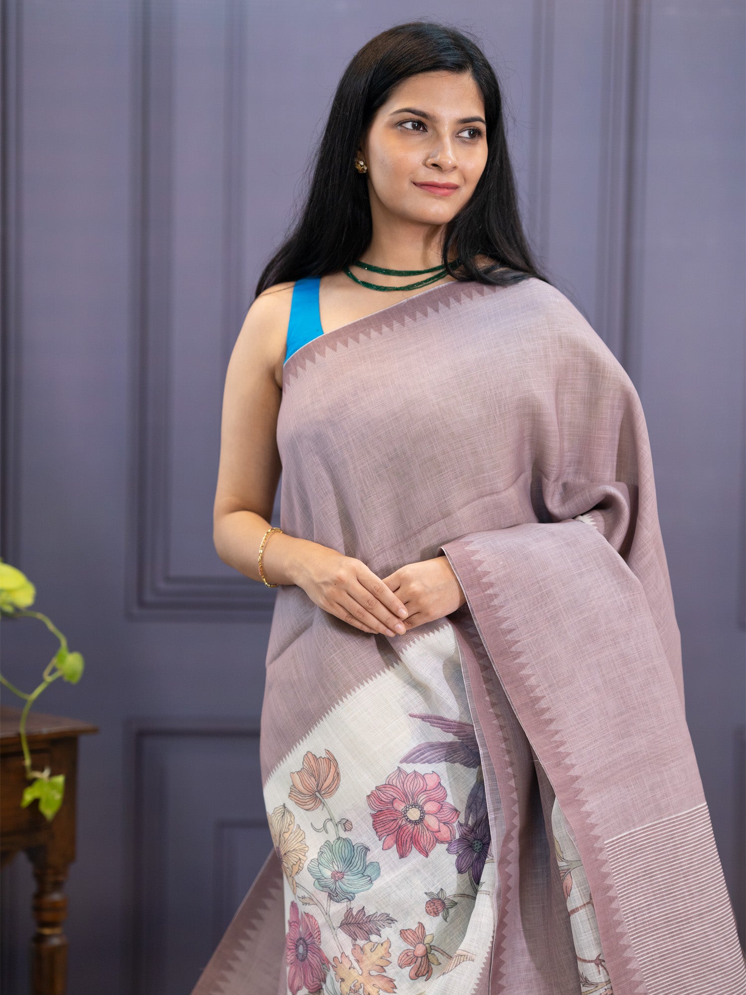 Crafted from a durable blend of jute and linen, this fabric features a sophisticated digital print in rich brown hues....