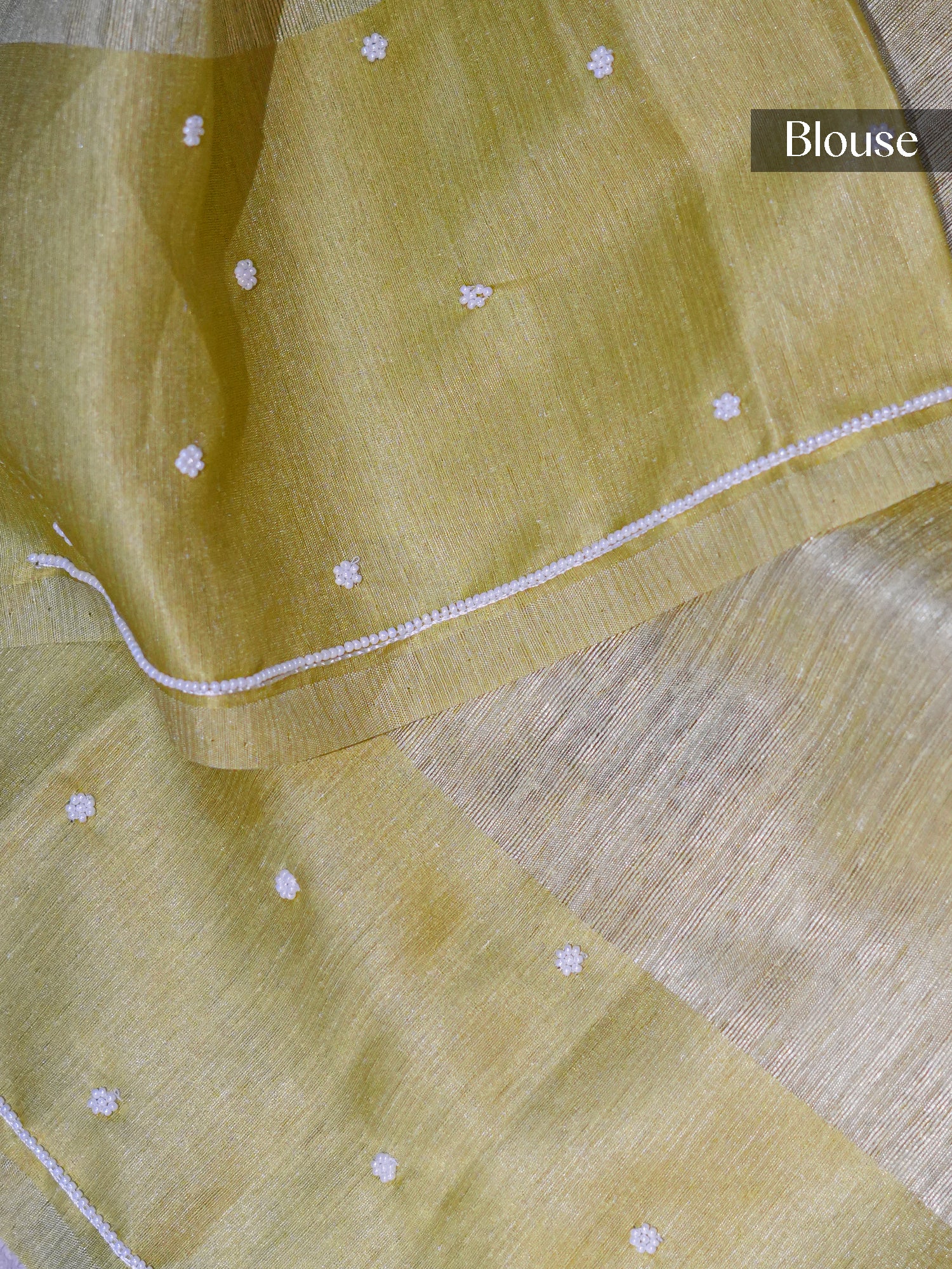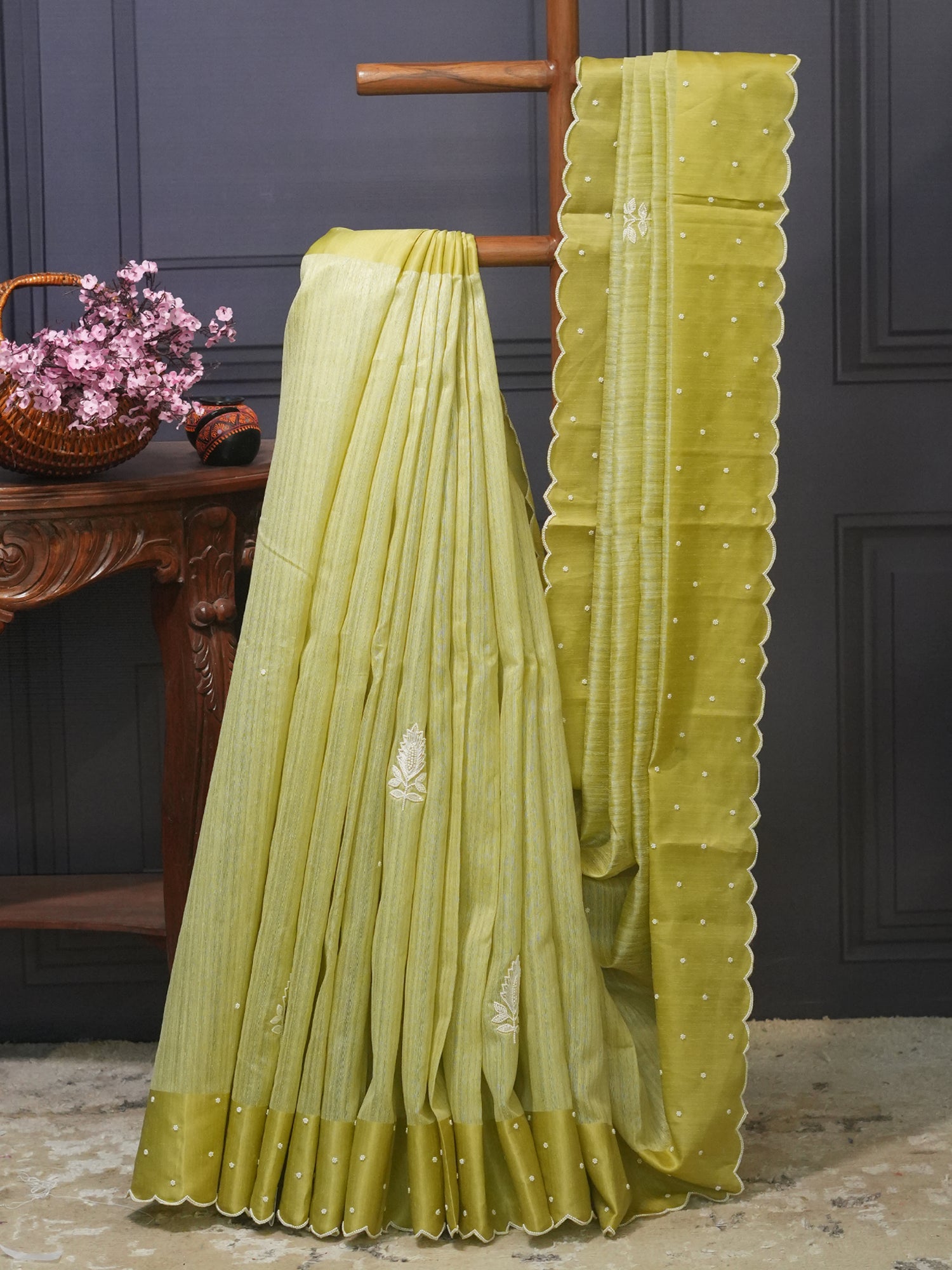 Jute Tusser Silk Saree with Satin Border and Pearl work Butties - Sea Green