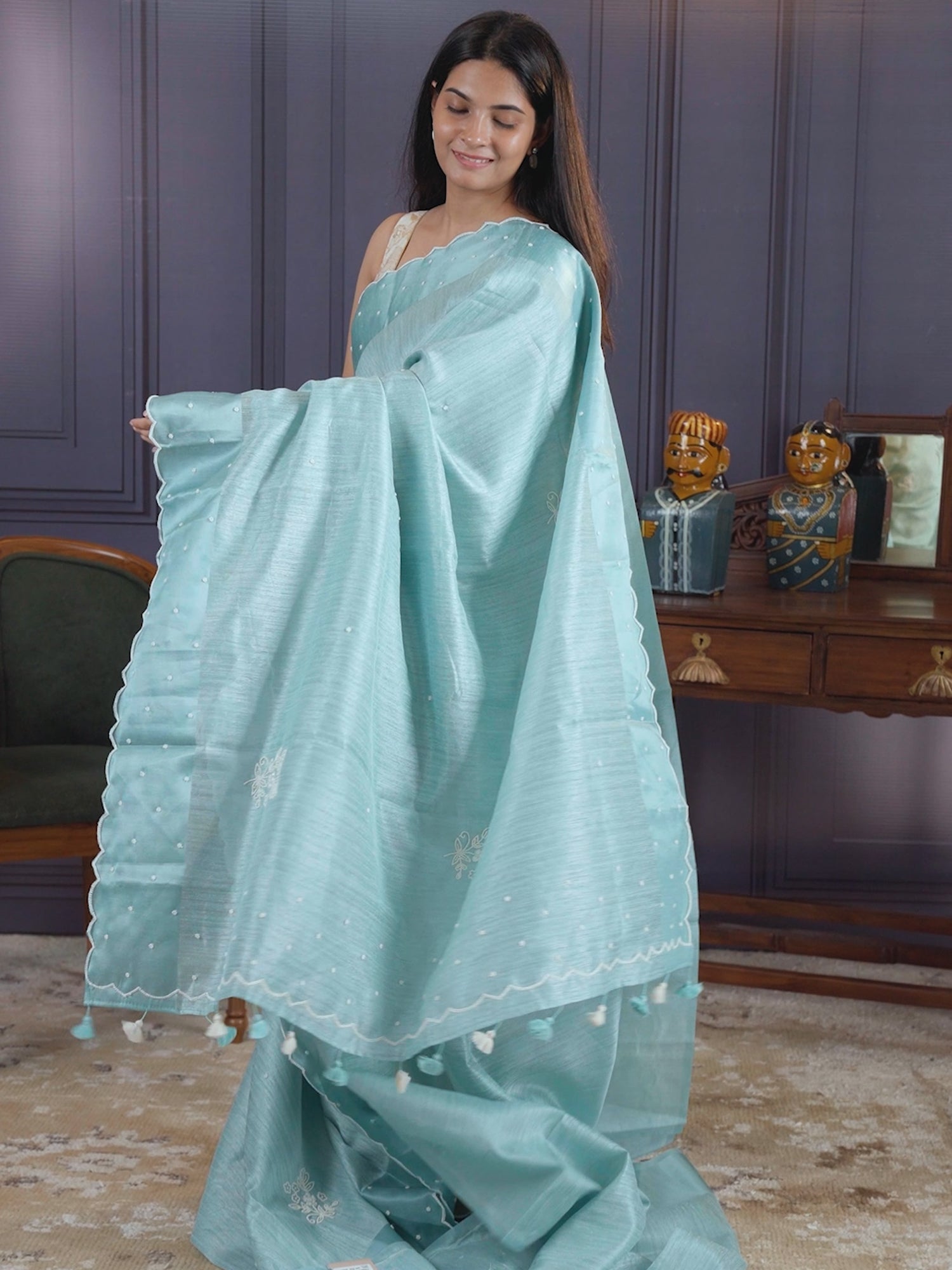 Jute Tusser Silk Saree with Satin Border and Pearl work Butties - Mint Blue