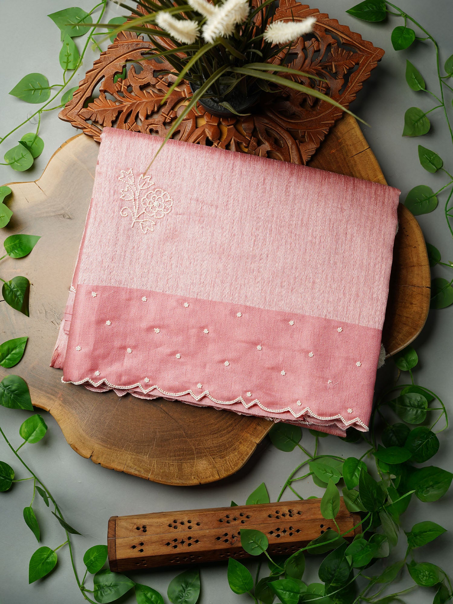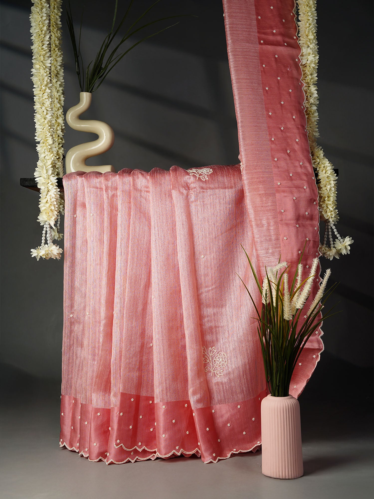 Jute Tusser Silk Saree with Satin Border and Pearl Work Butties- Pink