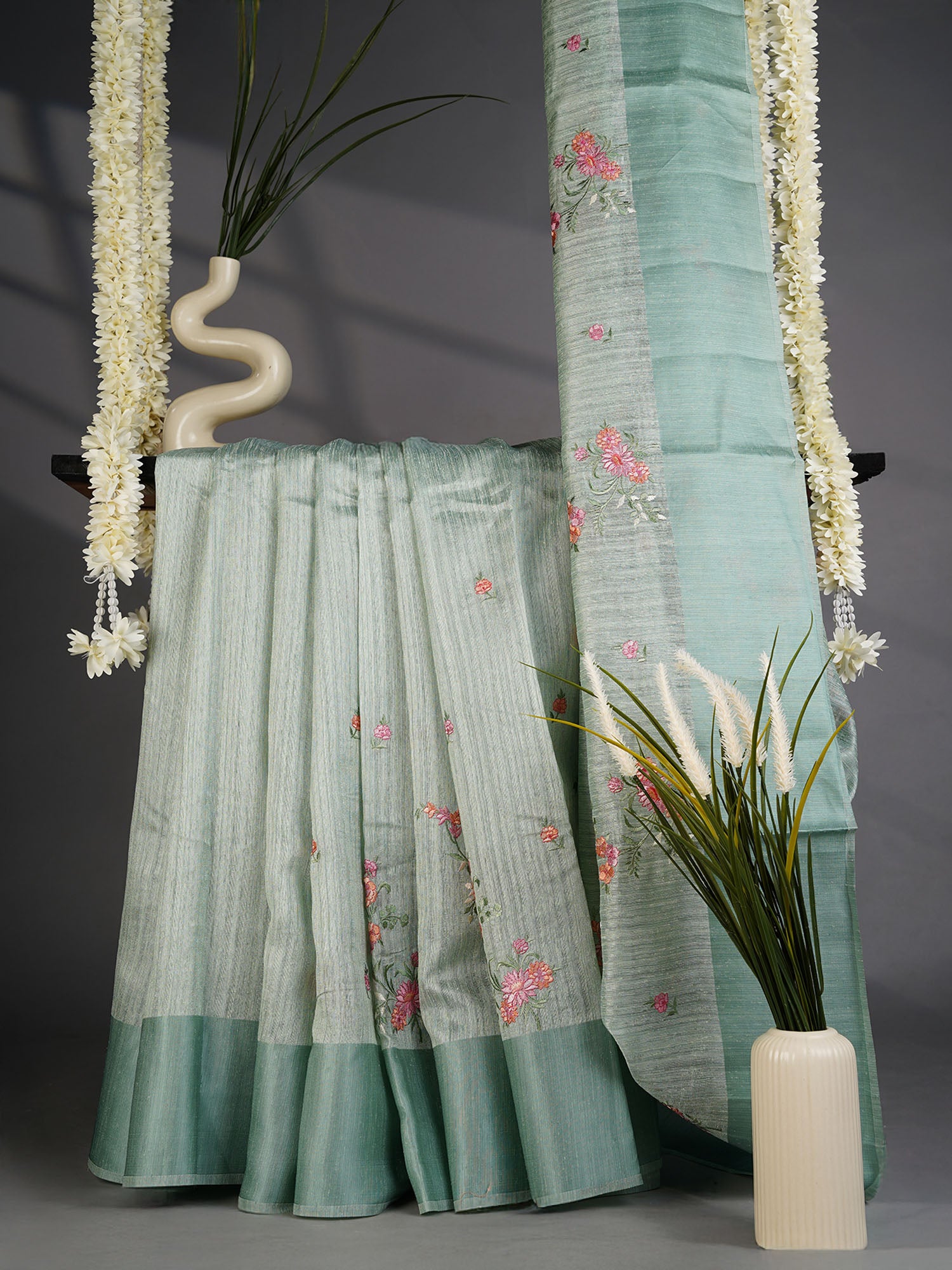 Elevate your ethnic wardrobe with this stunning sage green saree that's equal parts sophisticated and fun! Crafted from a luxurious blend of jute and tusser silk, this piece brings natural texture and breathable comfort to your collection. The intricate thread embroidery work adds artisanal charm, while the satin border frames the drape beautifully. Perfect for festive occasions, celebrations, or when you want to make a graceful statement without taking yourself too seriously. A versatile treasure that transitions seamlessly from traditional gatherings to modern styling experiments.