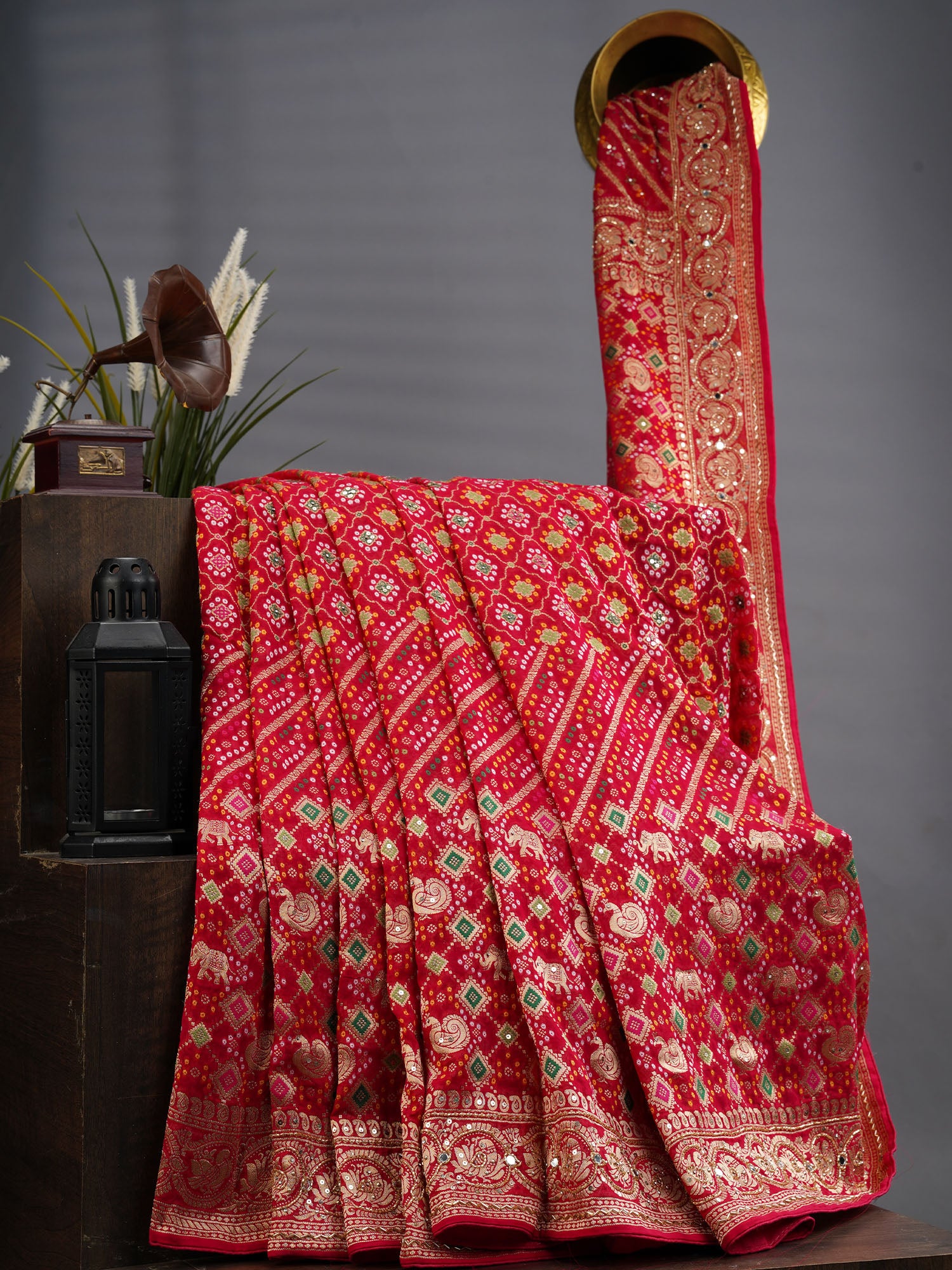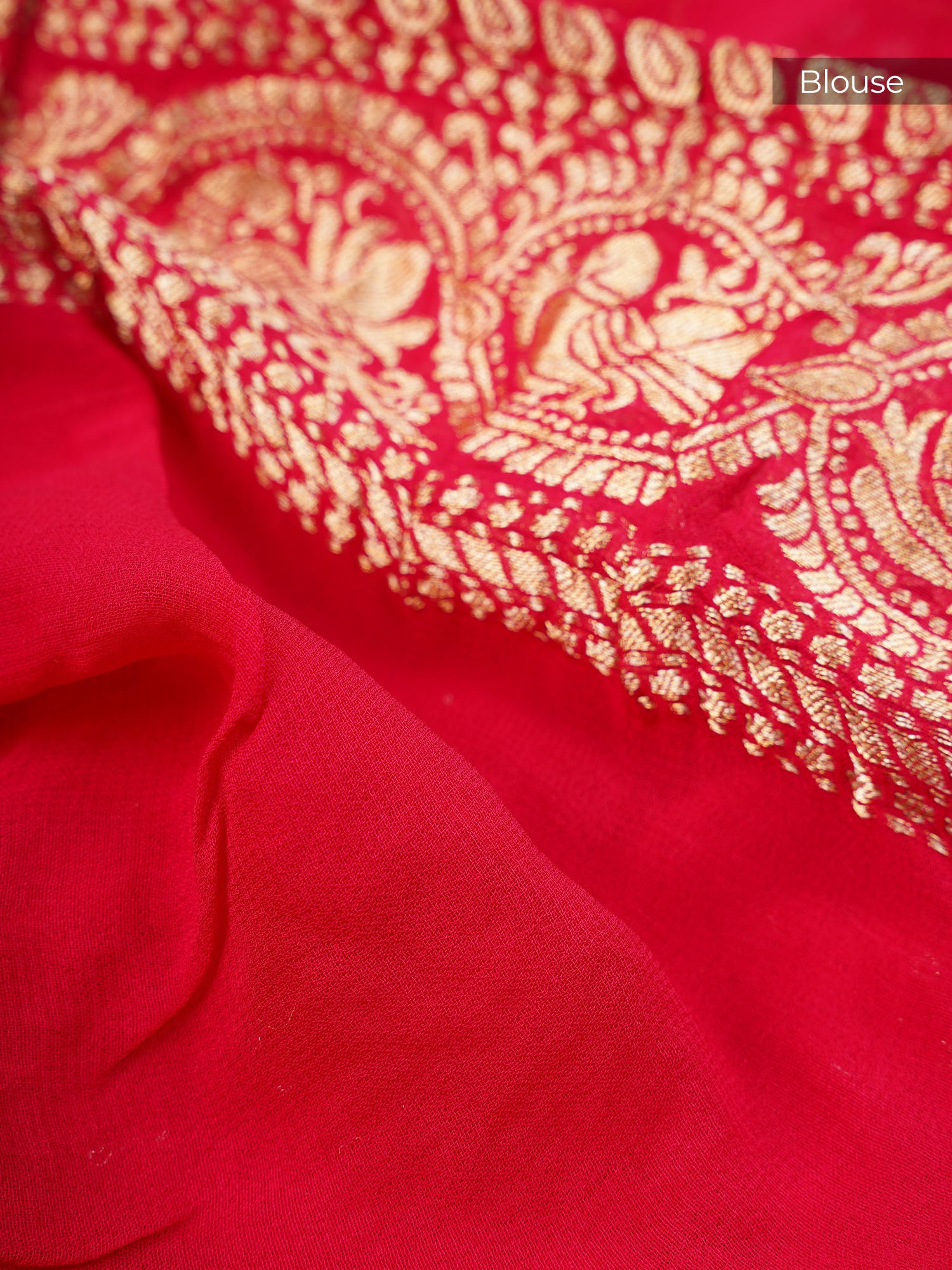 Drape yourself in timeless elegance with this stunning pink Kaddi Georgette saree! Featuring an exquisite Banaras border that whispers luxury...