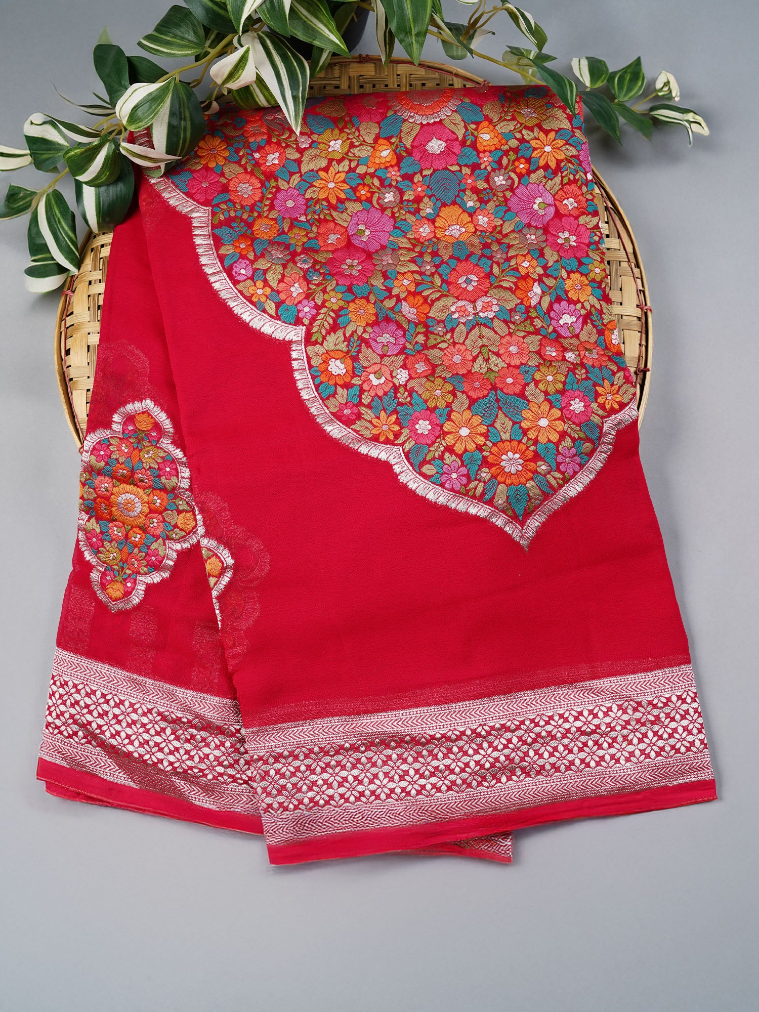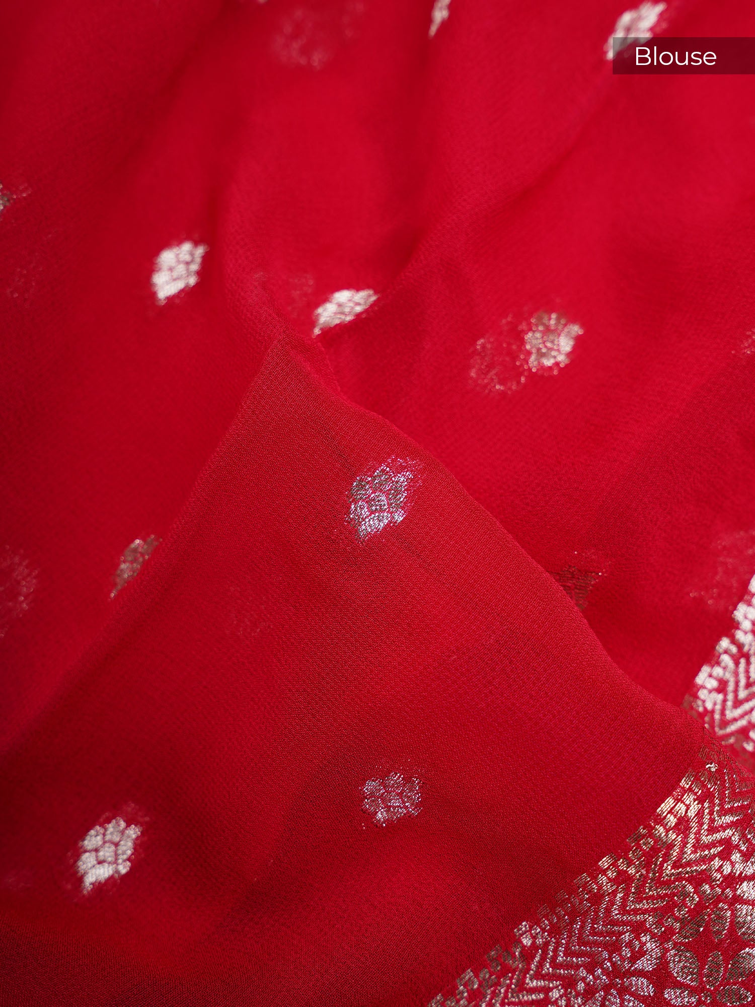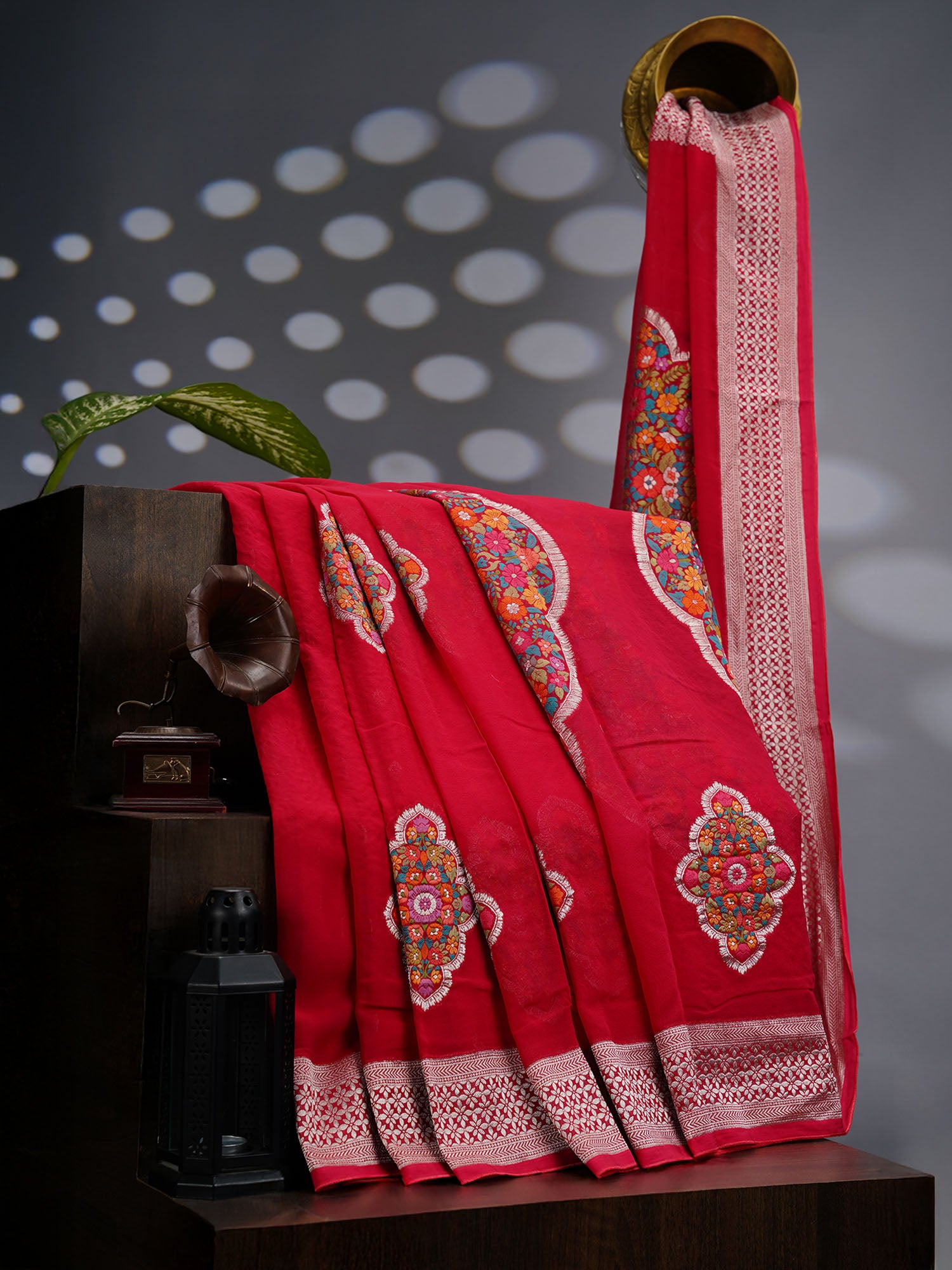 Drape yourself in timeless elegance with this stunning Kadi Georgette saree, where traditional craftsmanship meets vibrant style. The luxurious georgette fabric flows effortlessly, creating graceful silhouettes with every movement. Adorned with intricate meenakari butties—hand-painted enamel embellishments—this red beauty showcases exquisite artisanal detail that catches light and admiration alike. Perfect for celebrations, festivals, or whenever you want to turn heads with authentic Indian heritage. A wardrobe essential that blends comfort with showstopping charm.
