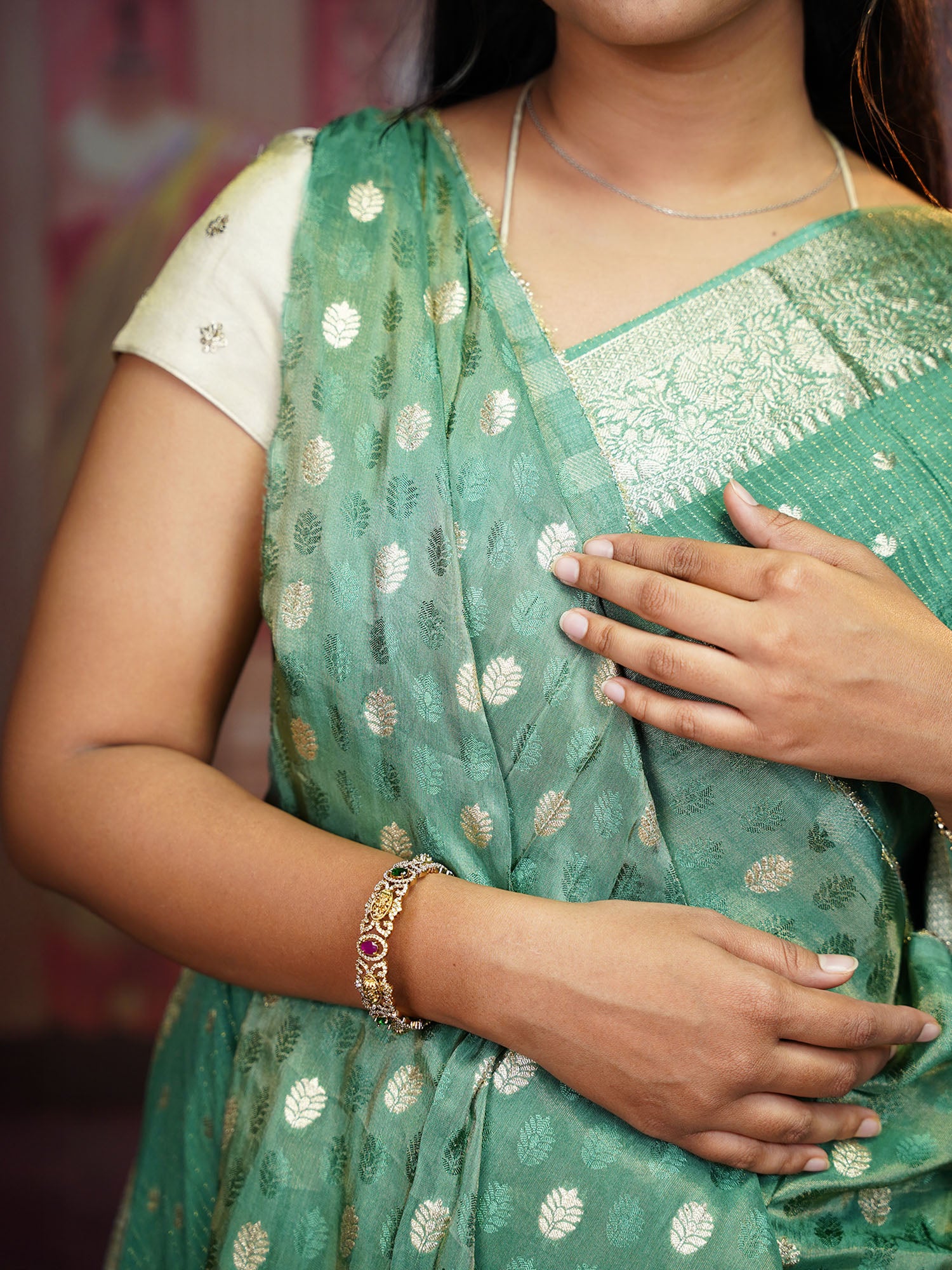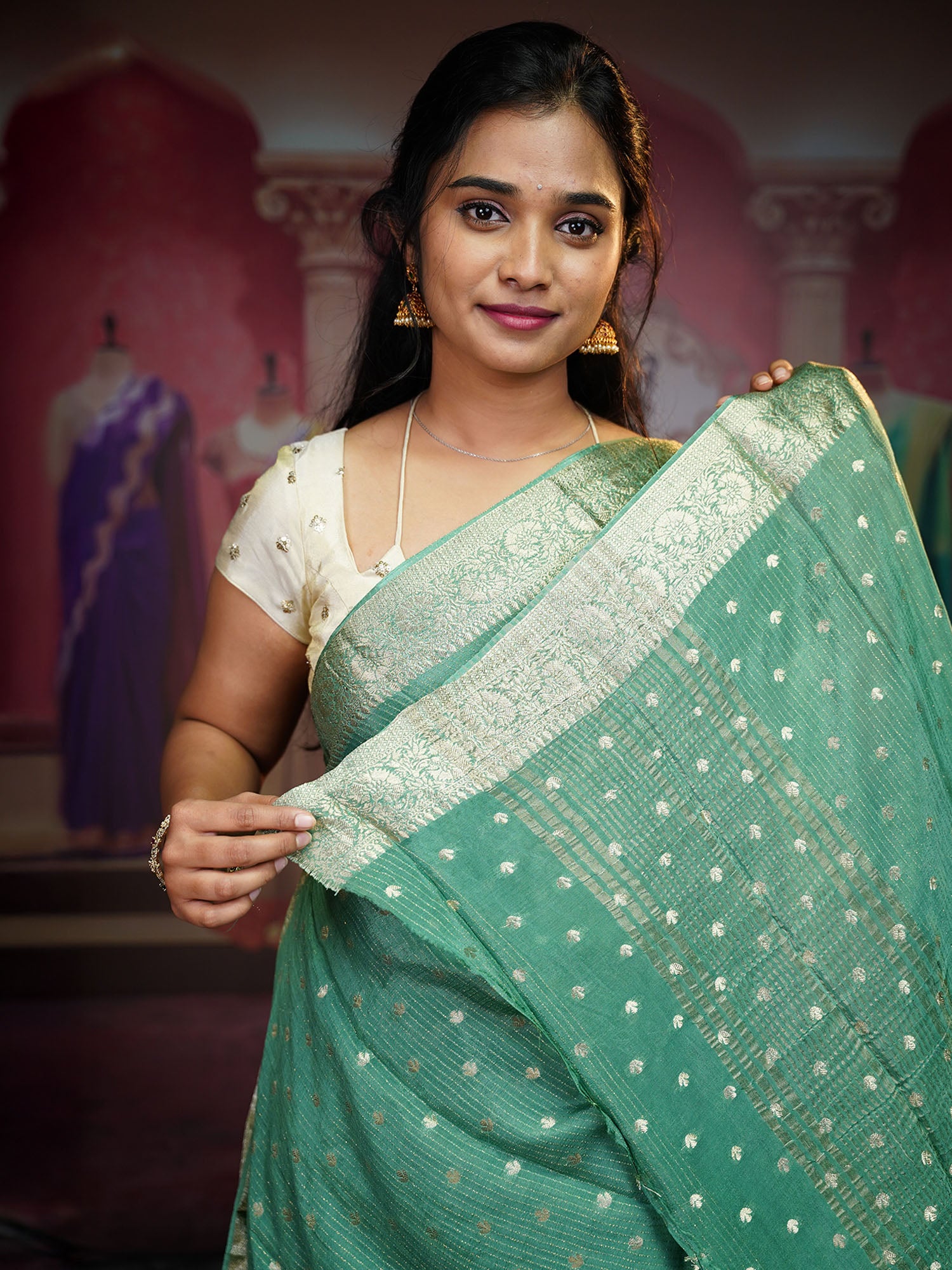 Drape yourself in elegance with this stunning Korean Crepe Saree featuring shimmering golden buttis scattered across the fabric and a gorgeous matching border. The luxurious crepe texture offers a graceful drape that flatters every silhouette, while the teal blue base creates a mesmerizing canvas for the intricate golden embellishments. Perfect for weddings, festivals, or those moments when you want to turn heads. Lightweight yet sophisticated, this saree brings together traditional charm with contemporary flair—because looking absolutely radiant should feel effortless."