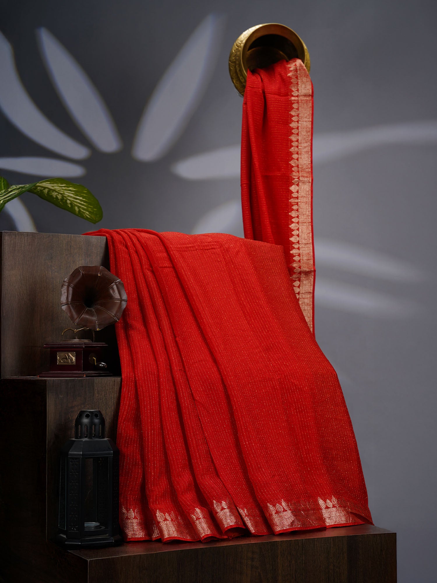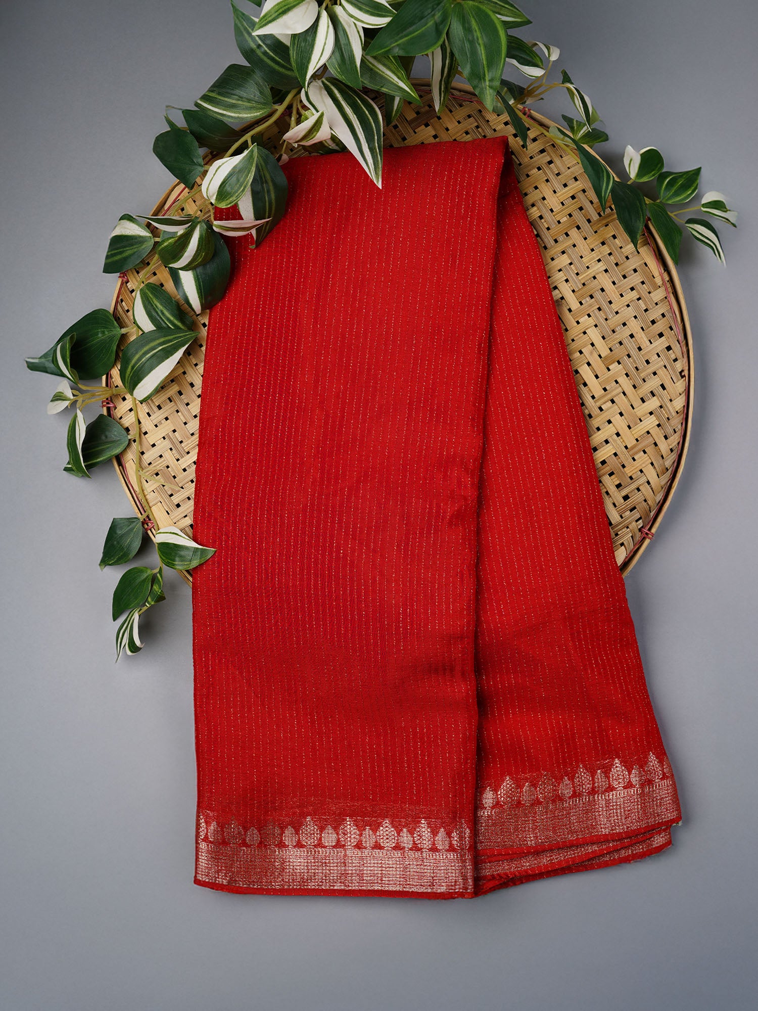 Drape yourself in elegance with this stunning Korean Crepe Saree featuring a luxurious golden zari border. The rich red fabric flows beautifully, offering a perfect blend of traditional charm and modern sophistication. The intricate golden embellishments add a touch of glamour to any occasion, whether it's a celebration or a special gathering. Lightweight and comfortable, this saree is ideal for all-day wear without compromising on style. A timeless piece that transforms you into the showstopper of the room!