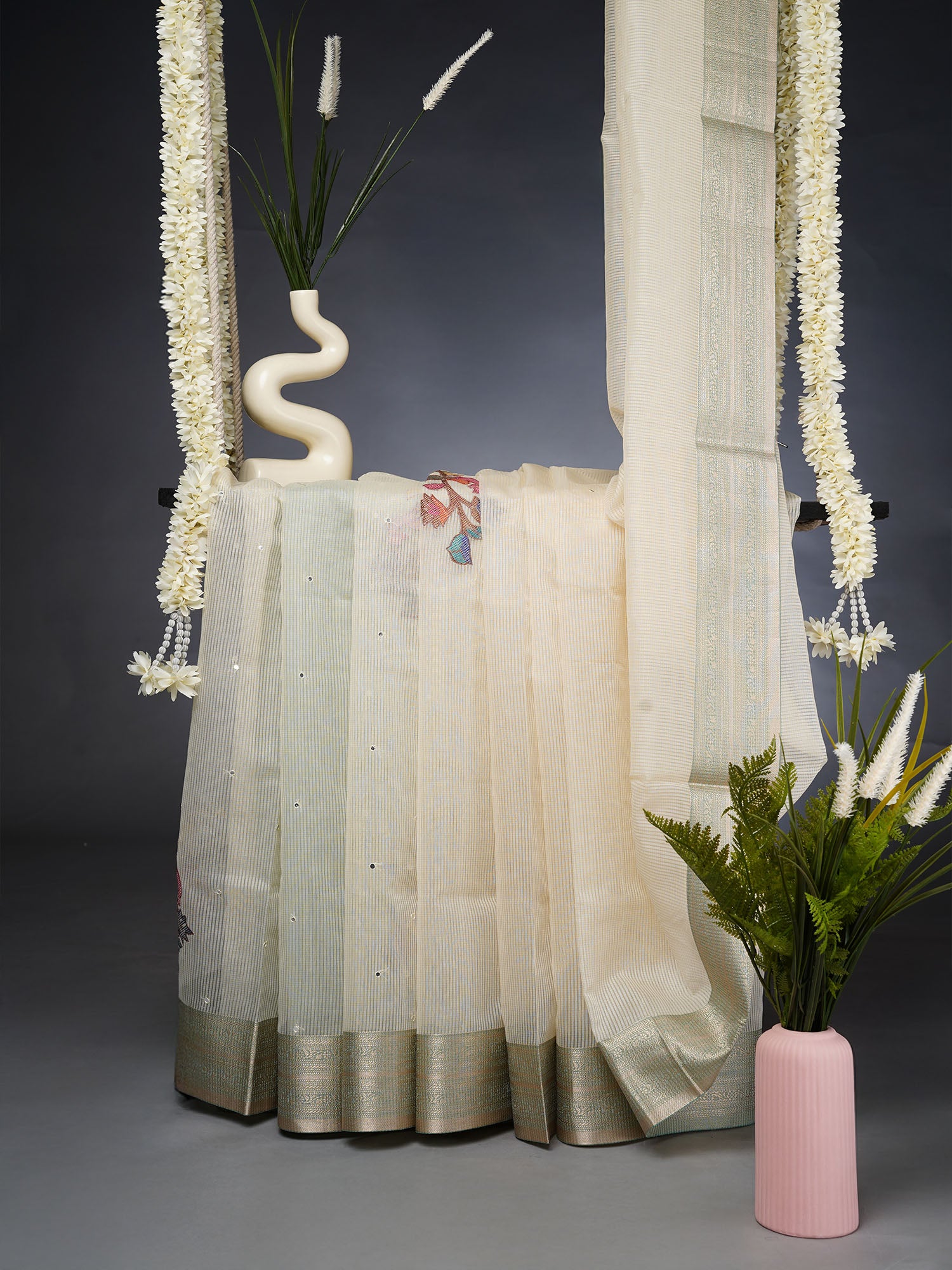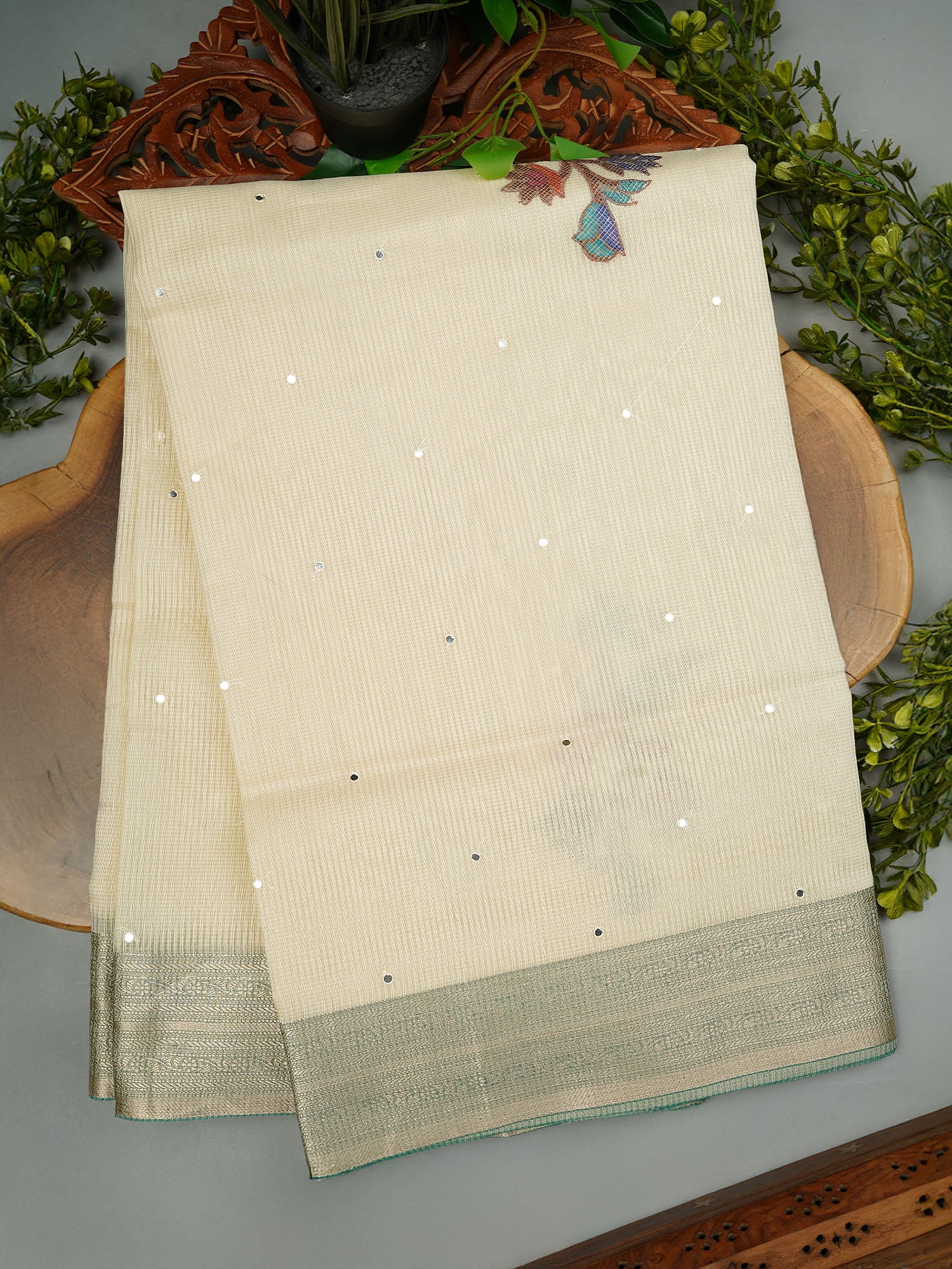Dive into understated elegance with this Kota Chanderi saree, where delicate mirror work catches the light with every movement. The...