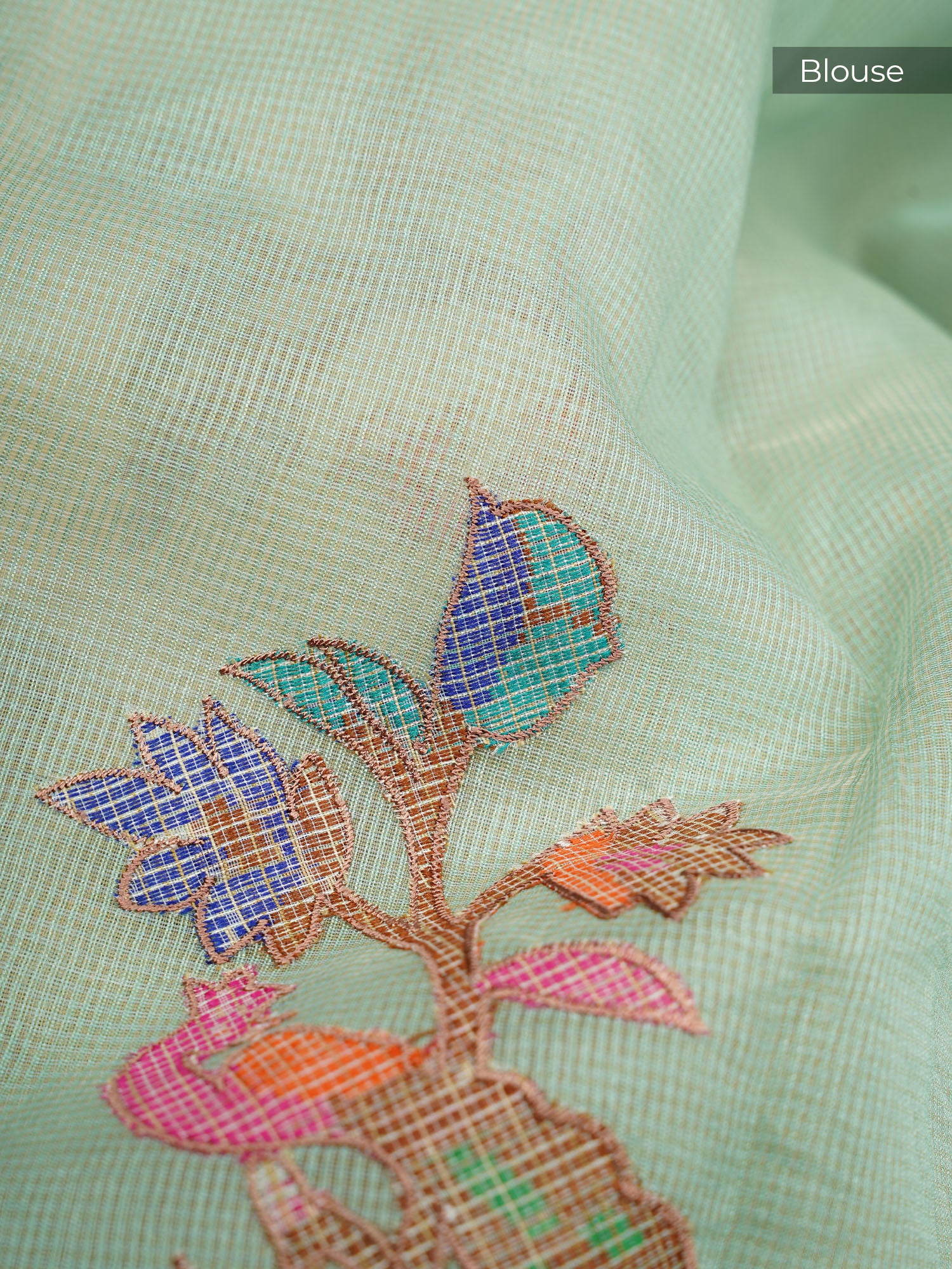 Kota Chanderi Saree with Mirror and Applique Work Contrast Border- Sea Green