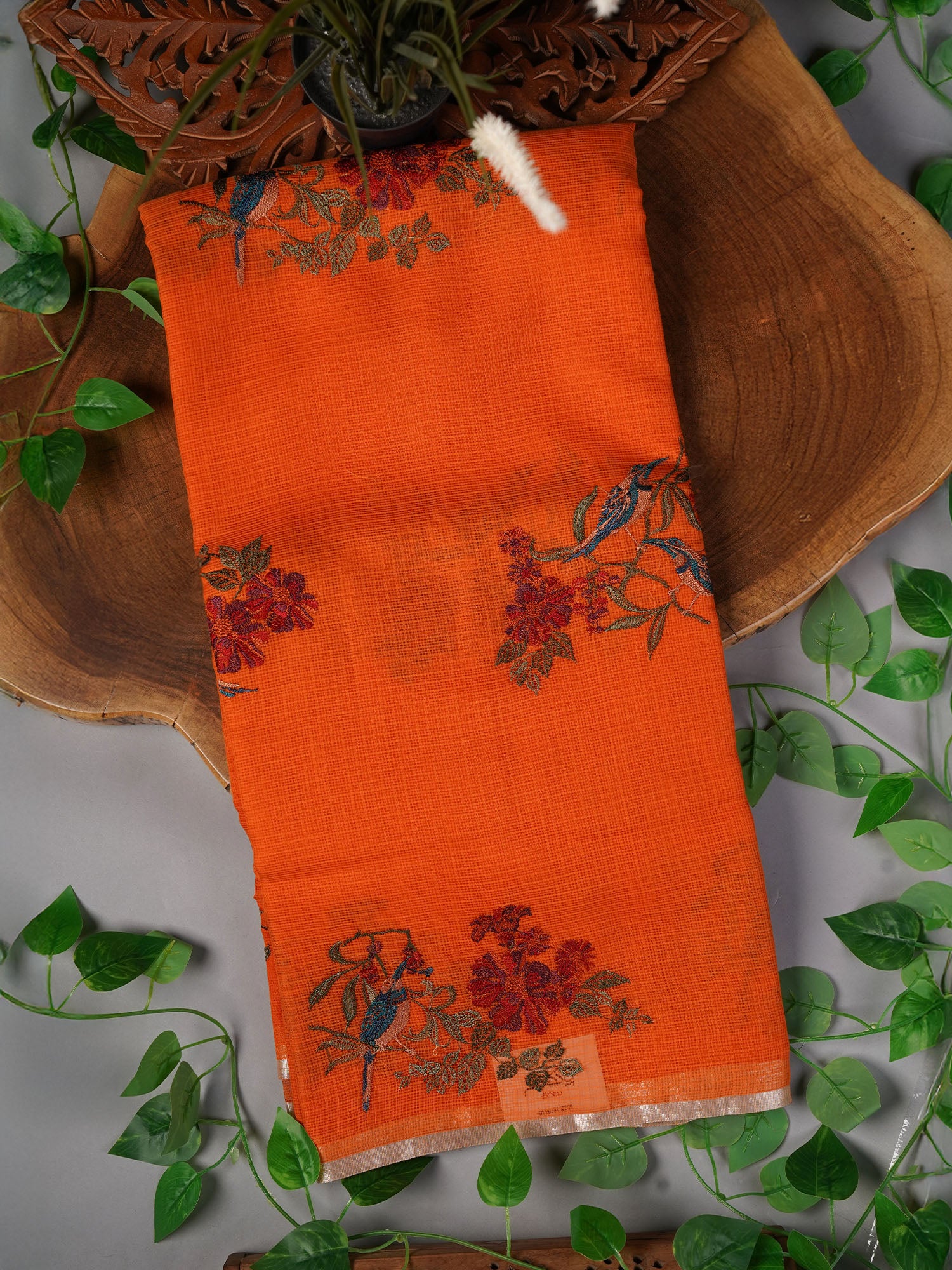Kota Saree with Thread Work Butties Silver Zari Border- Orange