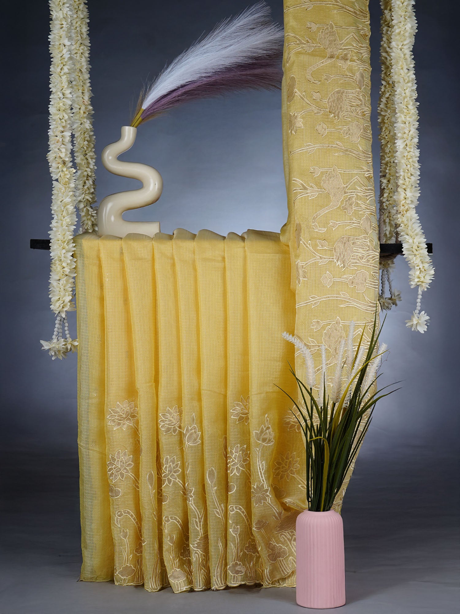 Kota Silk Saree With Applique Work and Scallop Border - Yellow