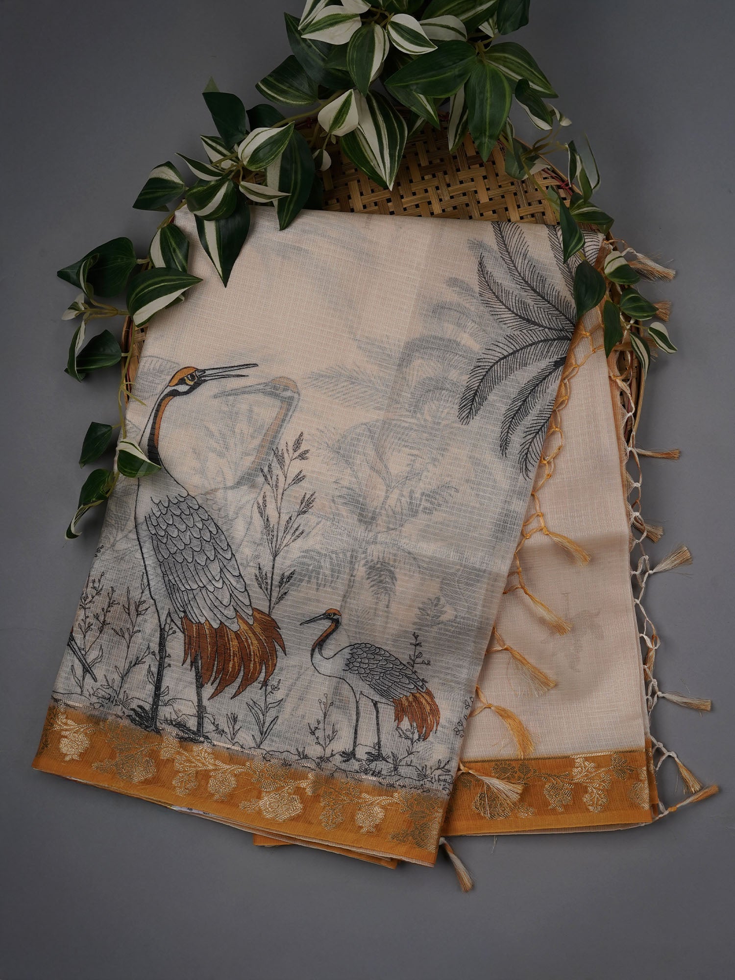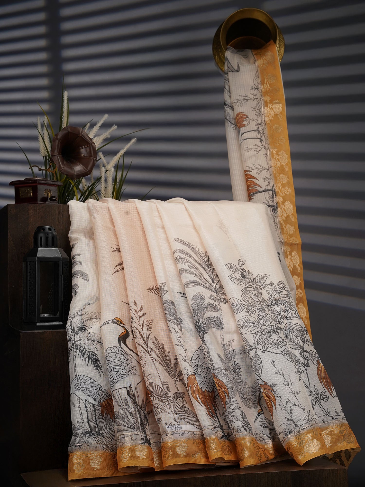 Kota Silk Saree With Digital Print And Contrast Border - Cream