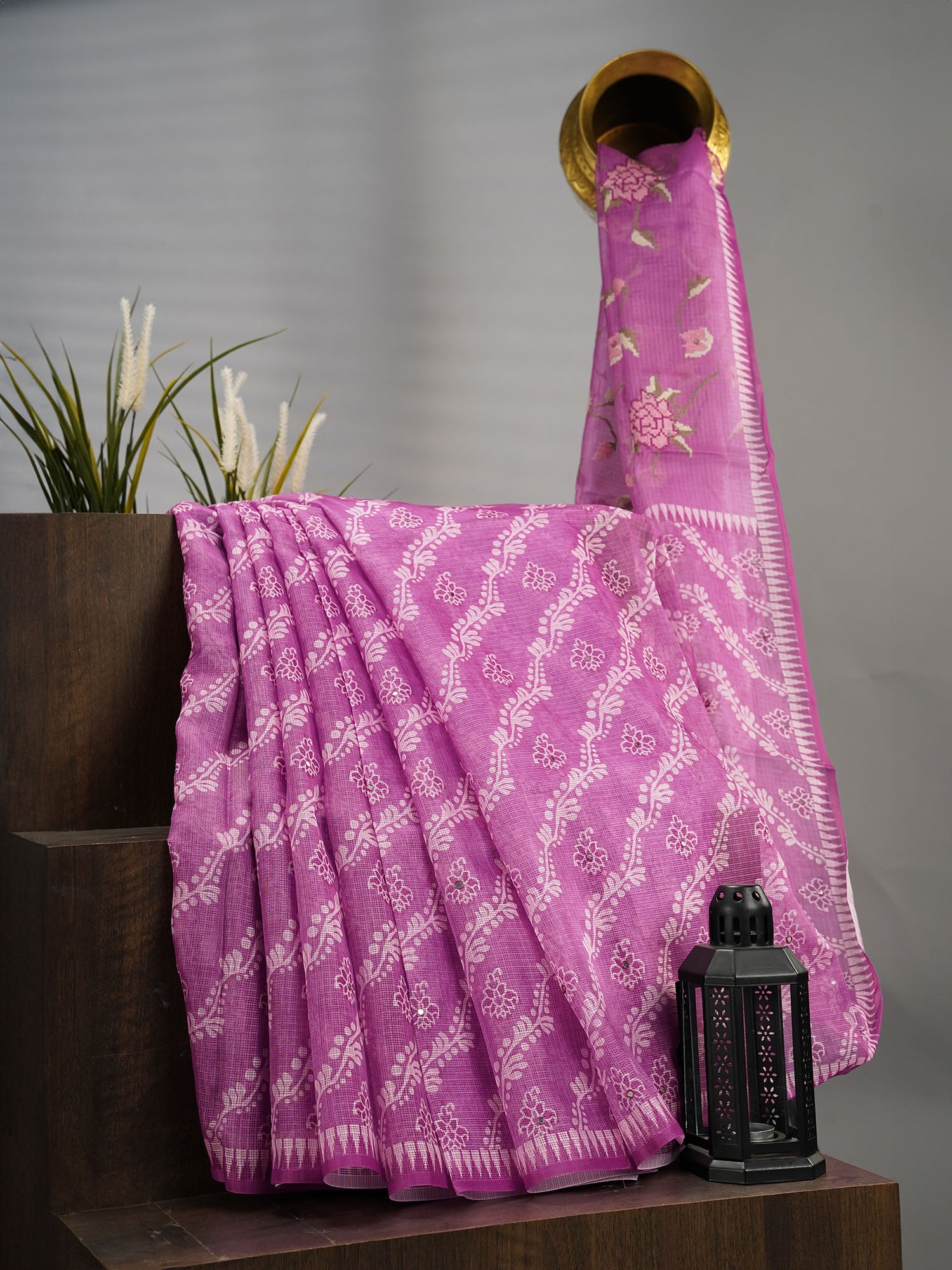 Elevate your wardrobe with this exquisite Silk Kota saree featuring a digitally printed Leharia pattern in a rich purple hue....