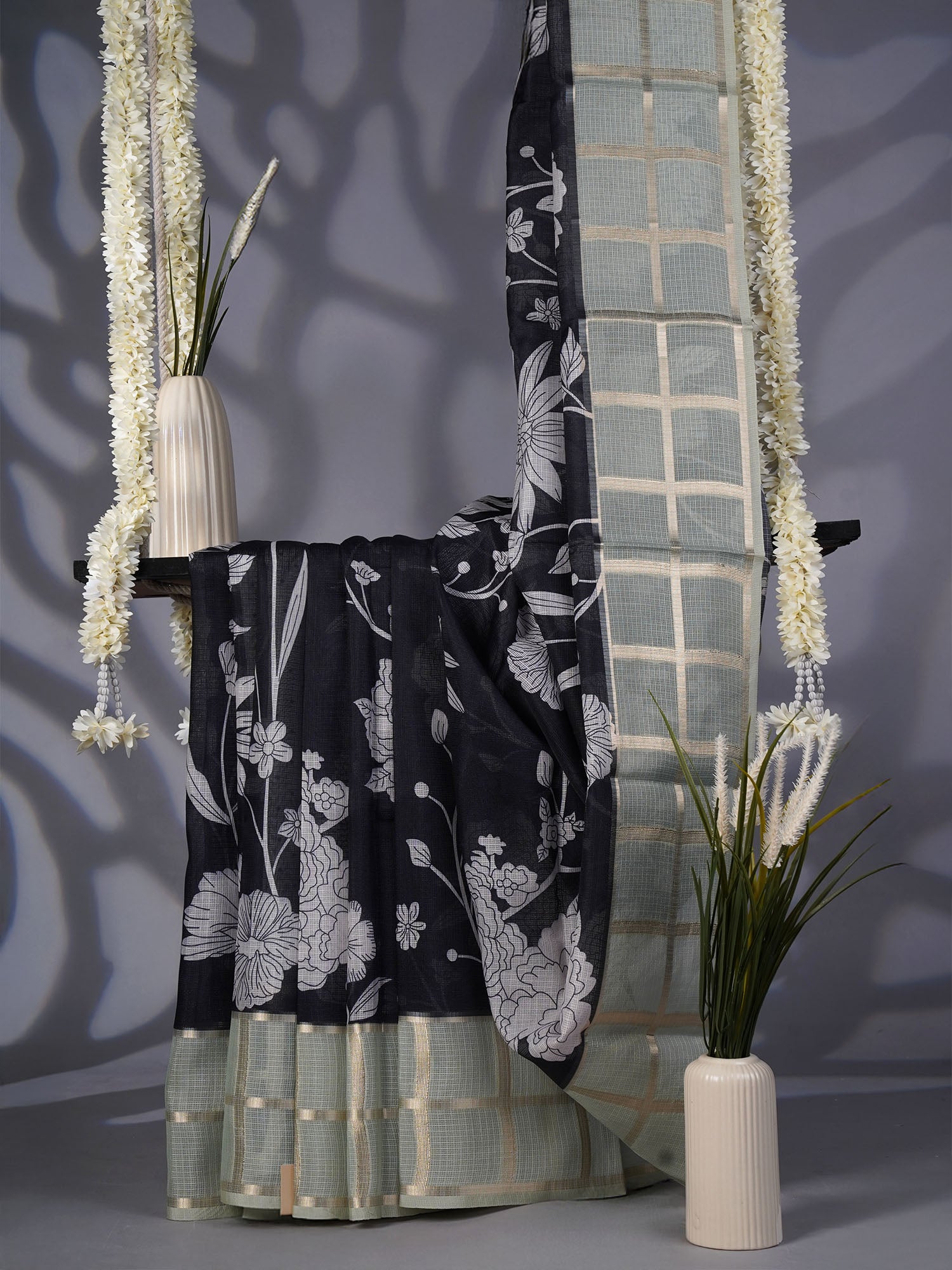 Kota Silk Saree with Floral Print and Contrast Border- Black and Green