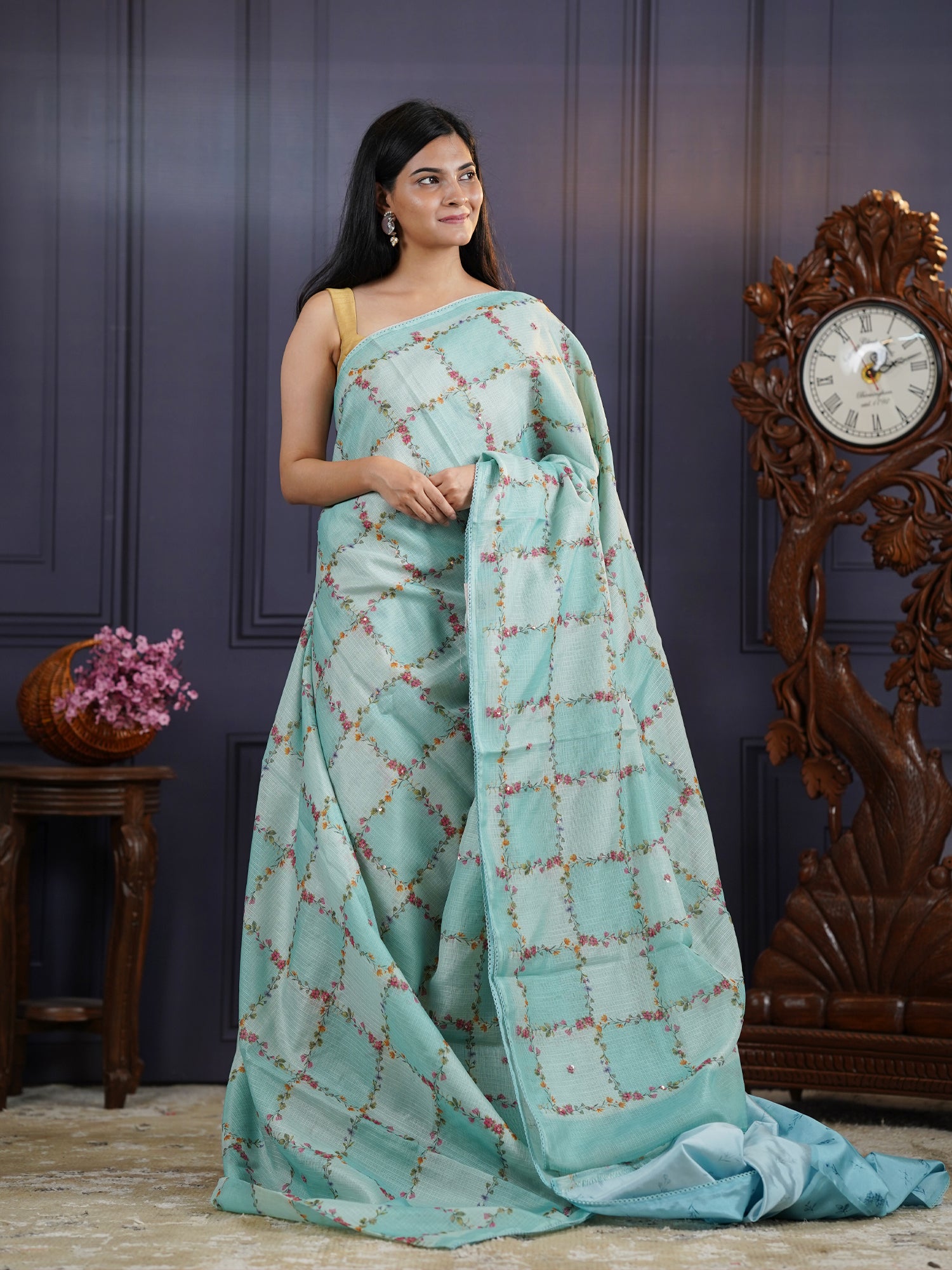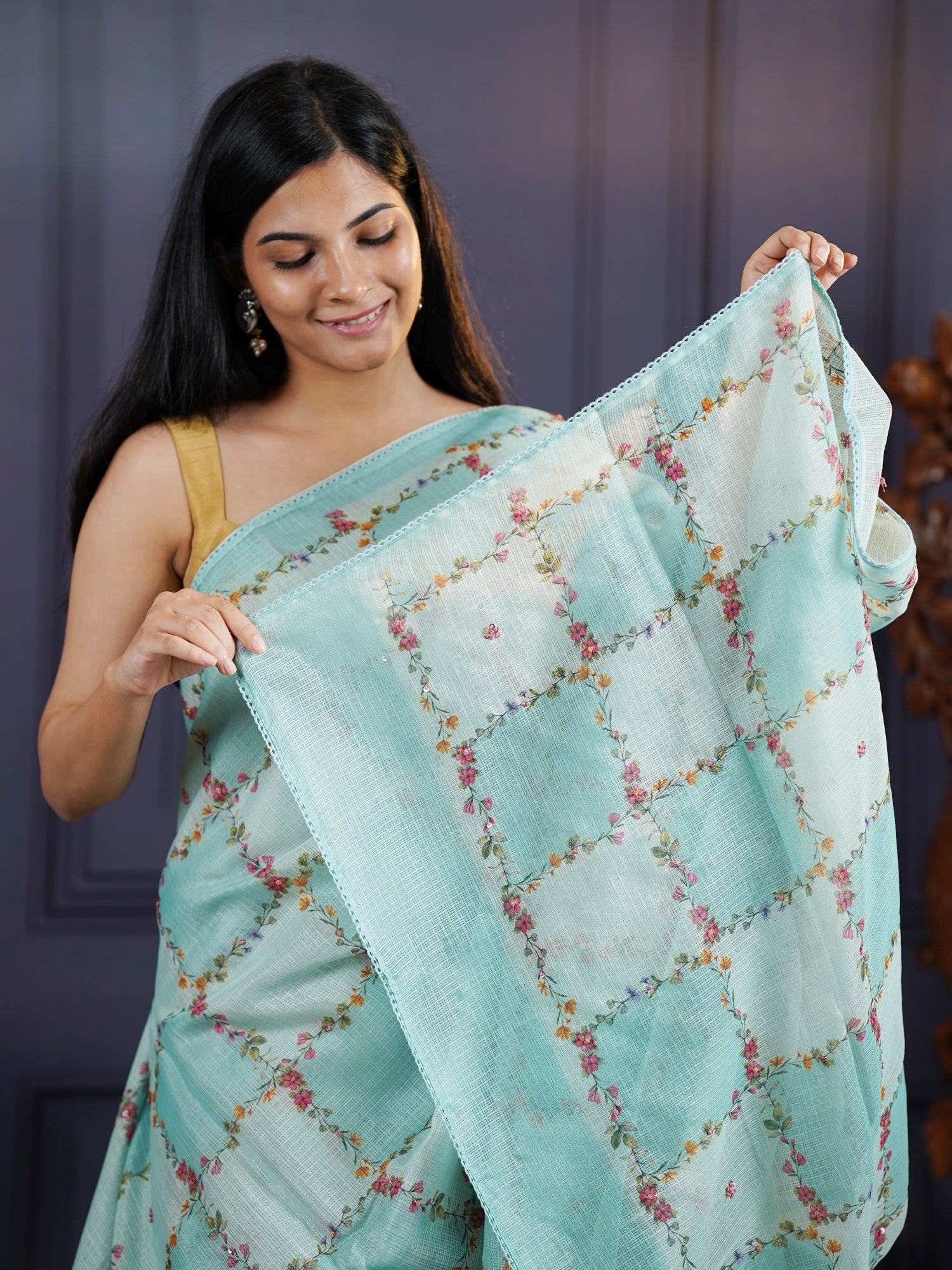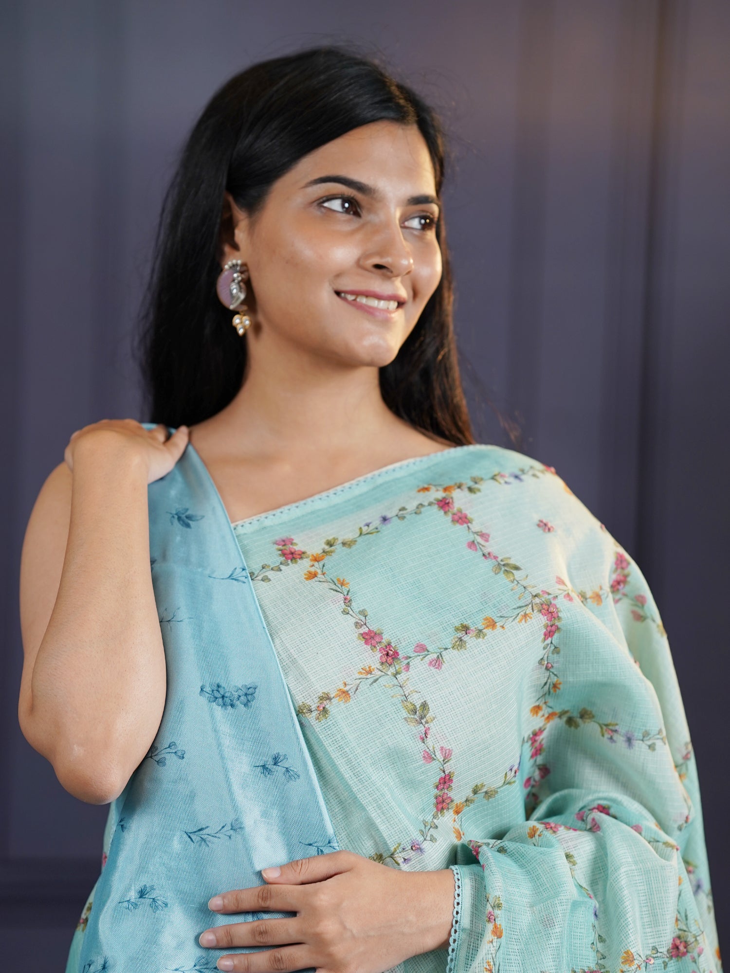 Dive into elegance with this serene Kota Silk Saree in soothing light blue! Featuring delicate floral prints interwoven with exquisite knot work, this saree captures the essence of timeless beauty with a modern twist. The lightweight, breathable Kota silk fabric glides effortlessly, making it your go-to choice for everything from casual outings to grand celebrations. With its calming color and intricate detailing, you'll feel poised and radiant at every turn. Add this versatile treasure to your collection and celebrate your unique style!