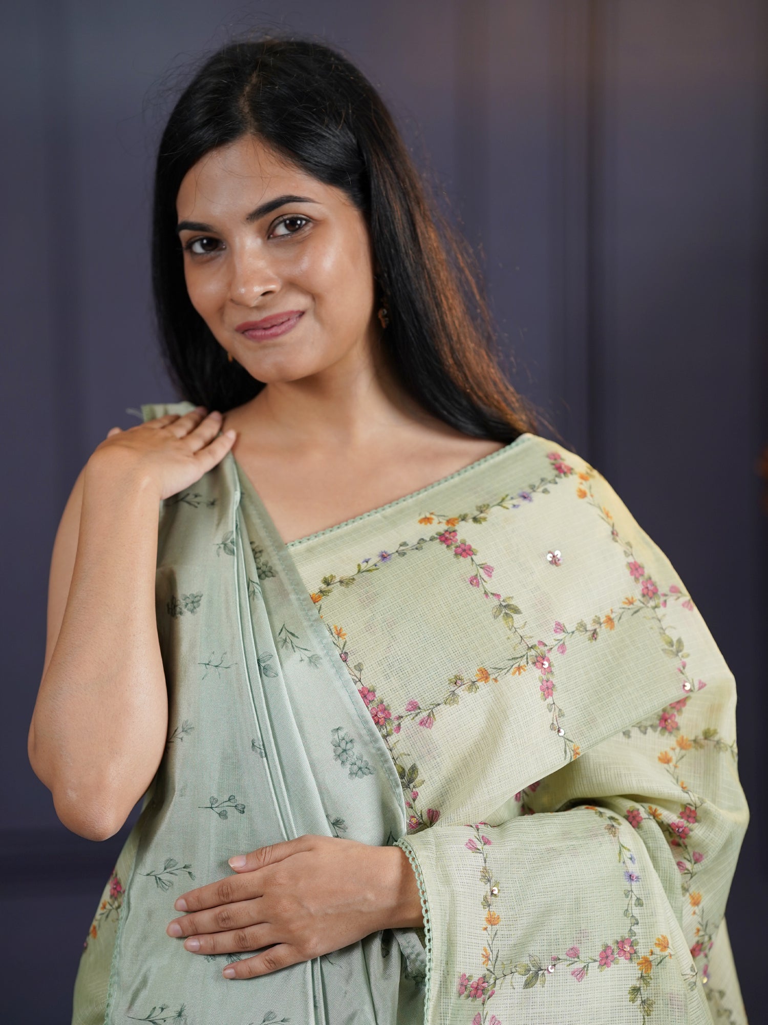 Kota Silk Saree with Floral Print and Knot Work- Pista Green