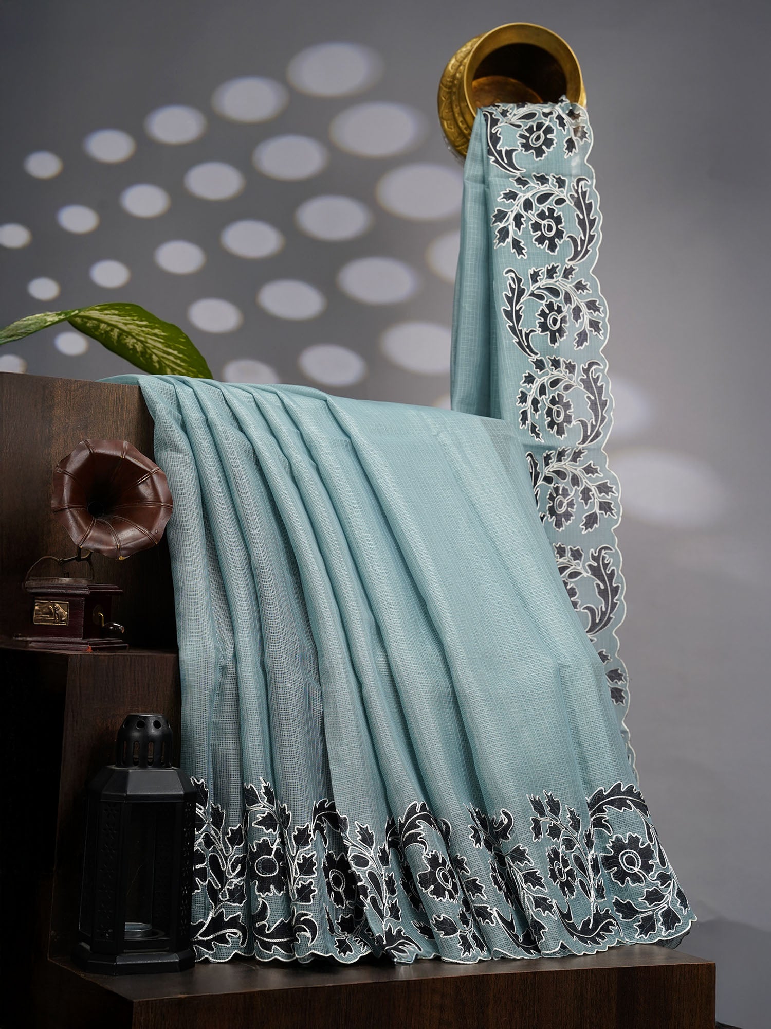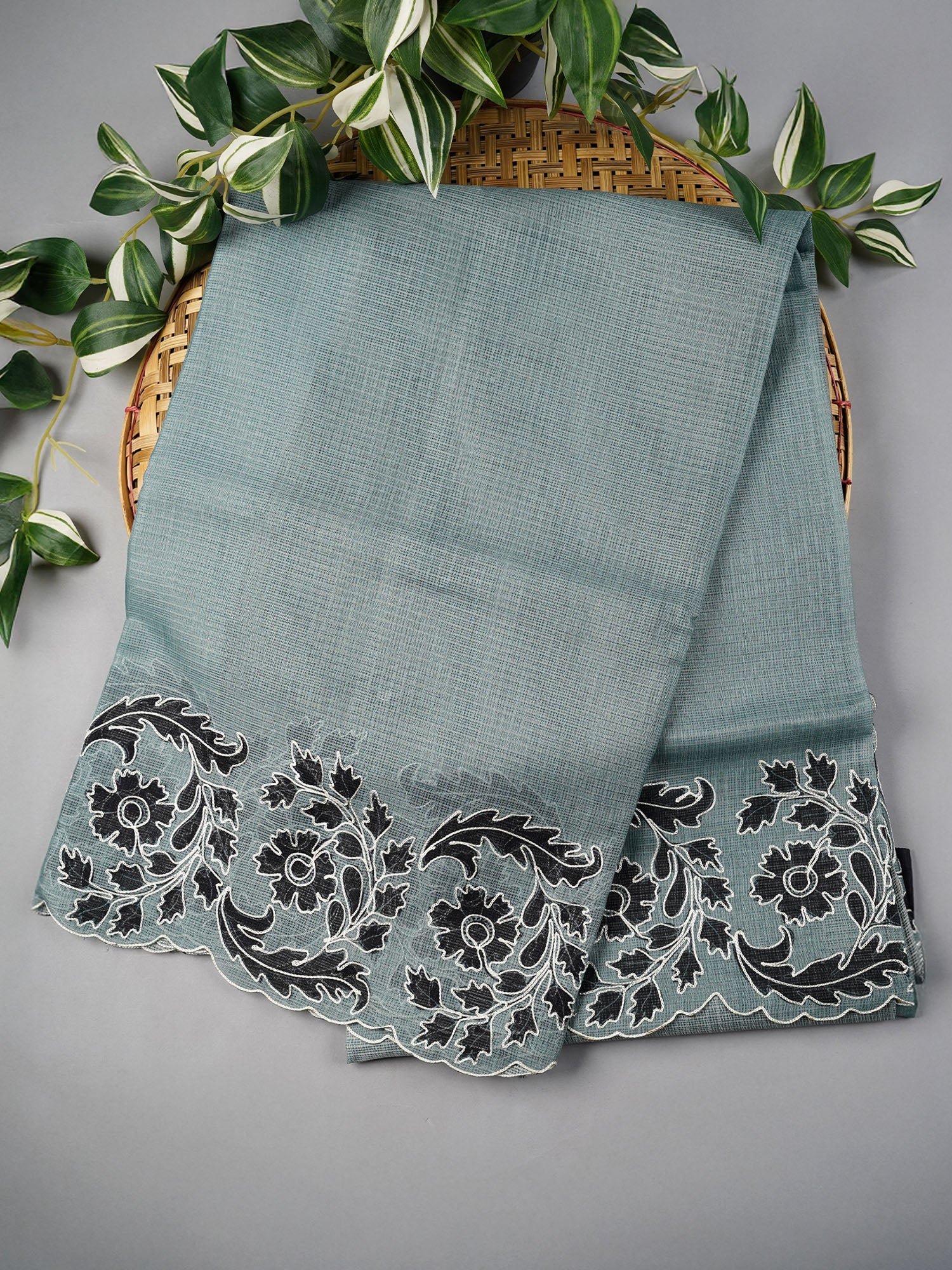 Kota Silk Saree With Floral Print & Ari Work Scallop Border - Greenish Grey
