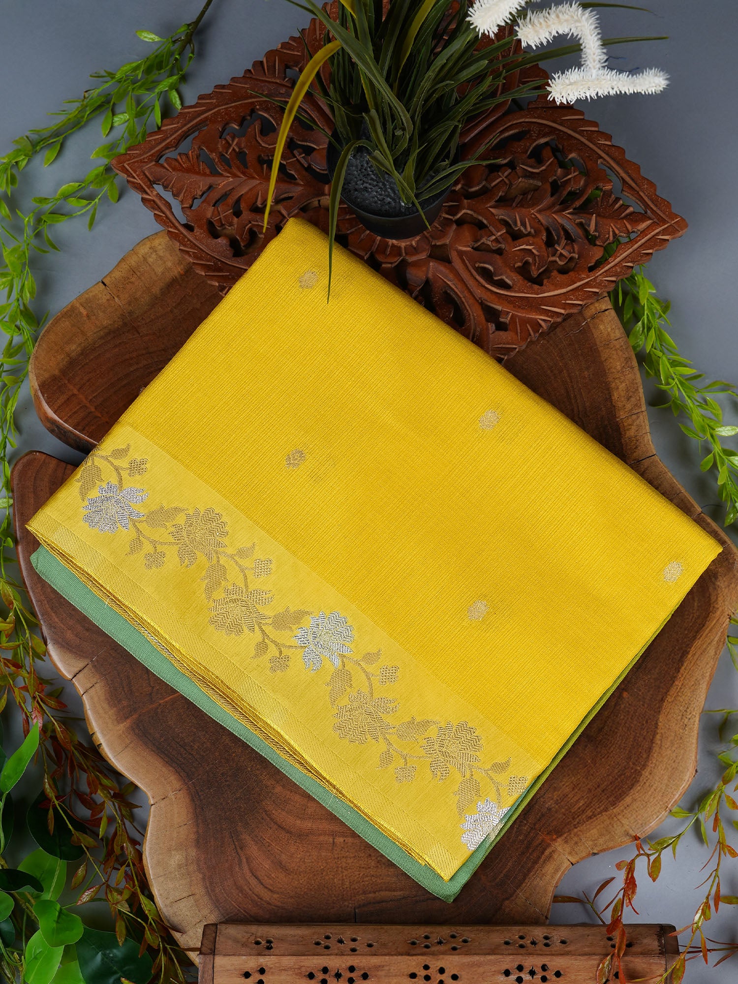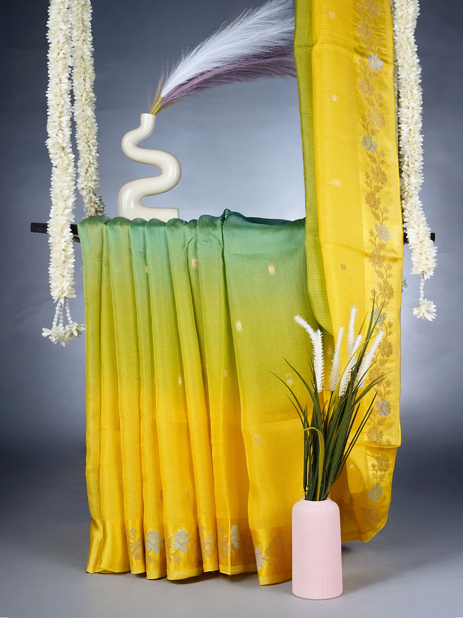 Sunshine meets sophistication in this radiant yellow Kota silk saree. Delicate golden butties dance across the fabric, catching light with...