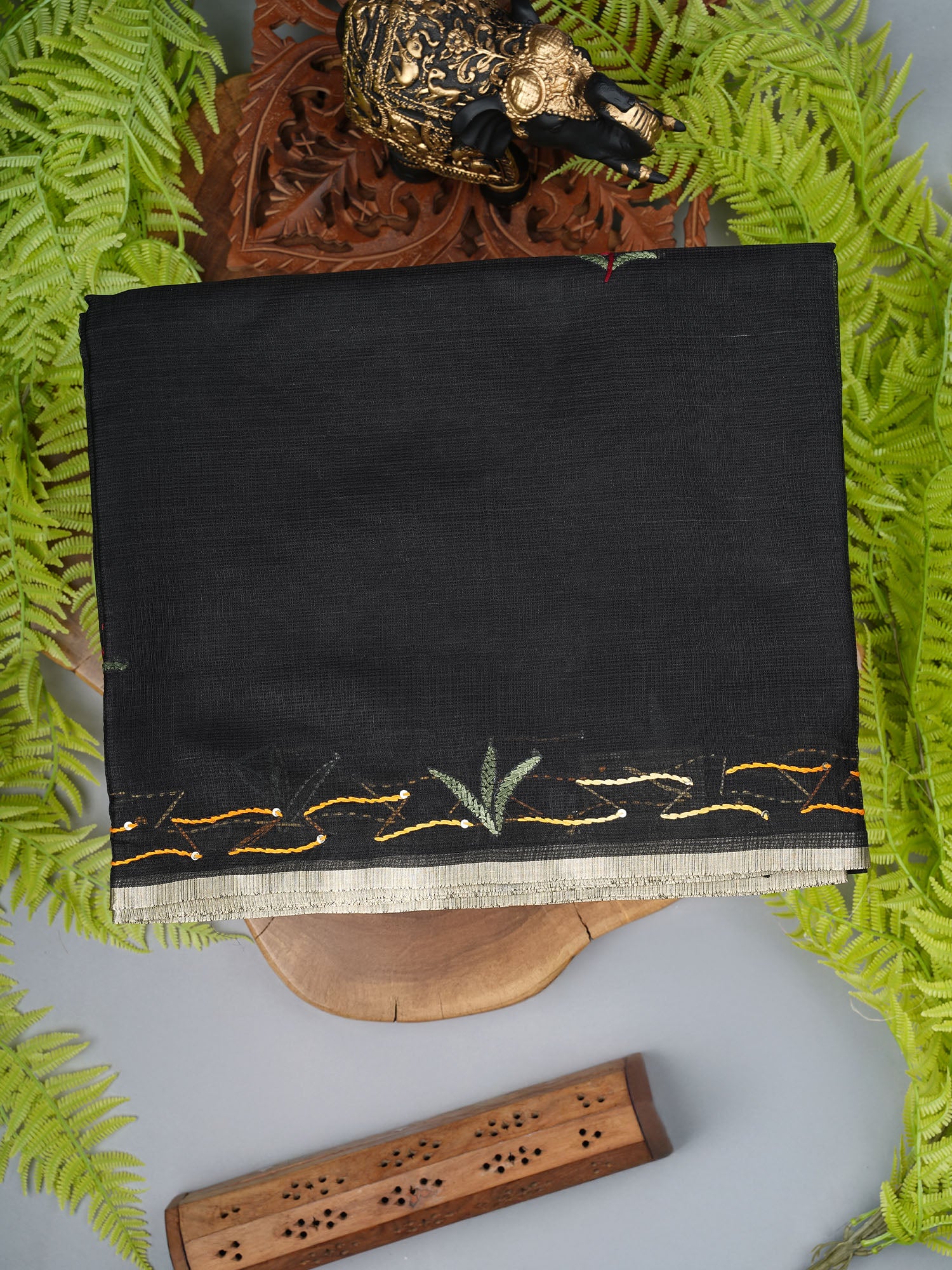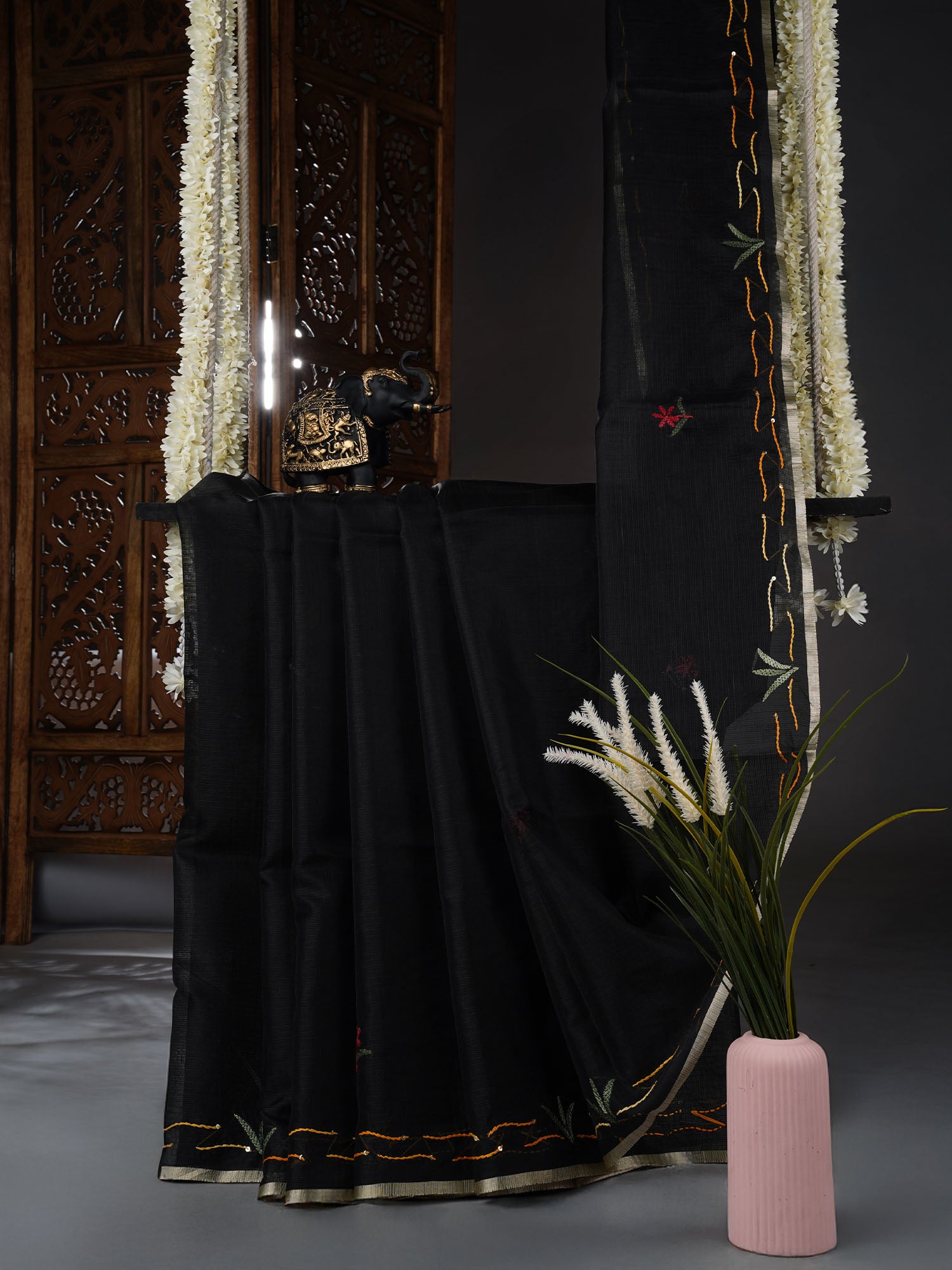 Drape yourself in timeless elegance with this stunning Kota Silk saree, where delicate kantha work meets shimmering zari borders. The rich black fabric flows effortlessly, creating that perfect silhouette for any occasion—whether you're heading to a celebration or making a statement at a gathering. The intricate hand-stitched kantha detailing adds soul and character, while the lustrous zari border catches light beautifully. Kota Silk's signature lightweight weave keeps you comfortable all day, making this saree your go-to for both tradition and style. A timeless piece that whispers sophistication with every drape.