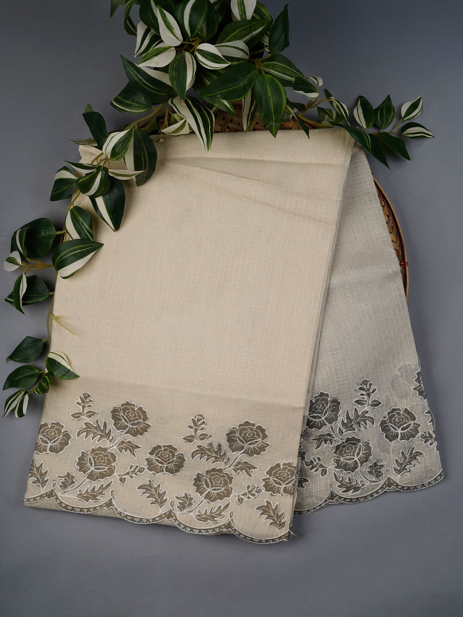 Kota Silk Saree with Thread Embroidery With Scallop Border - Cream & Green