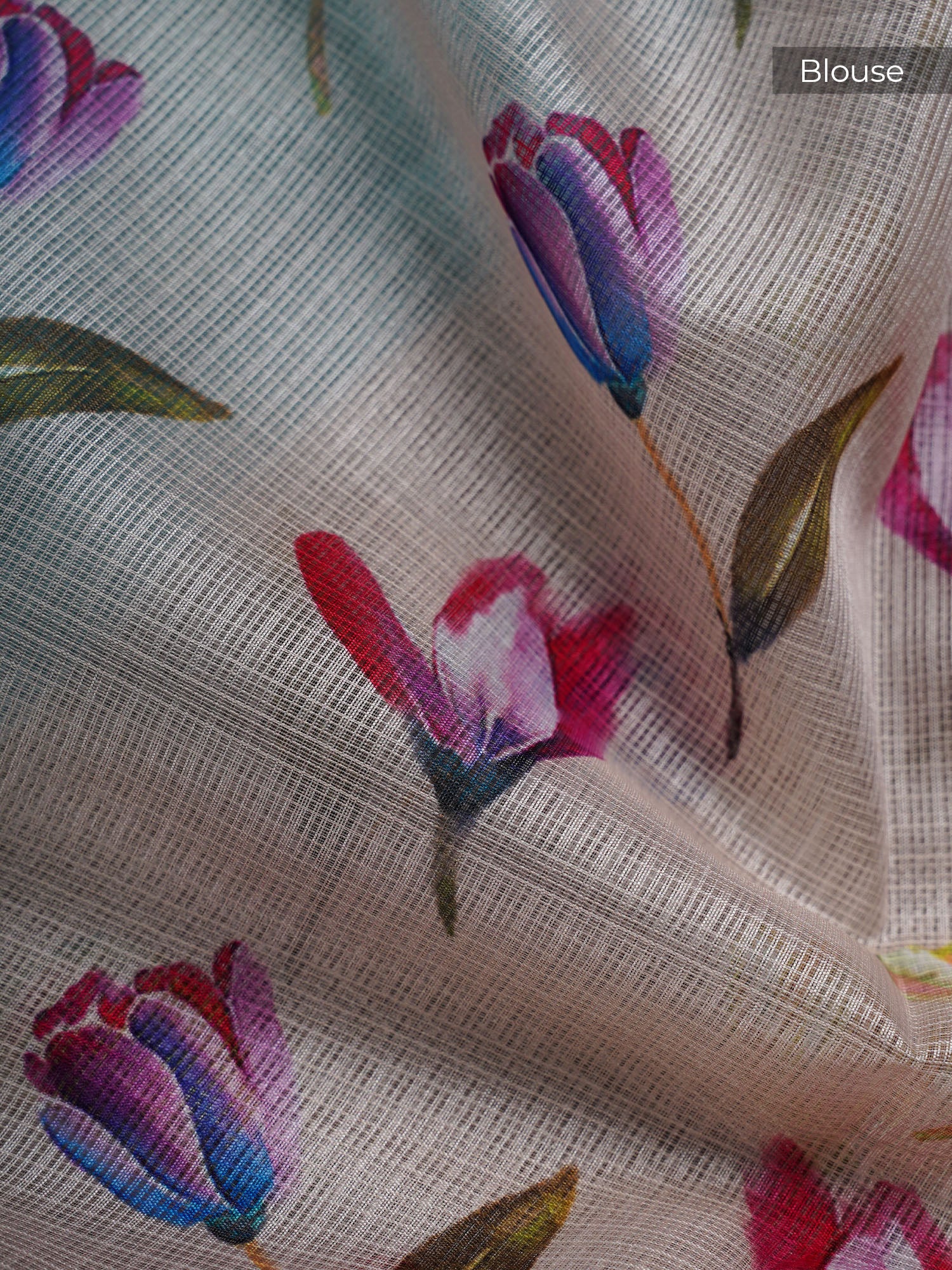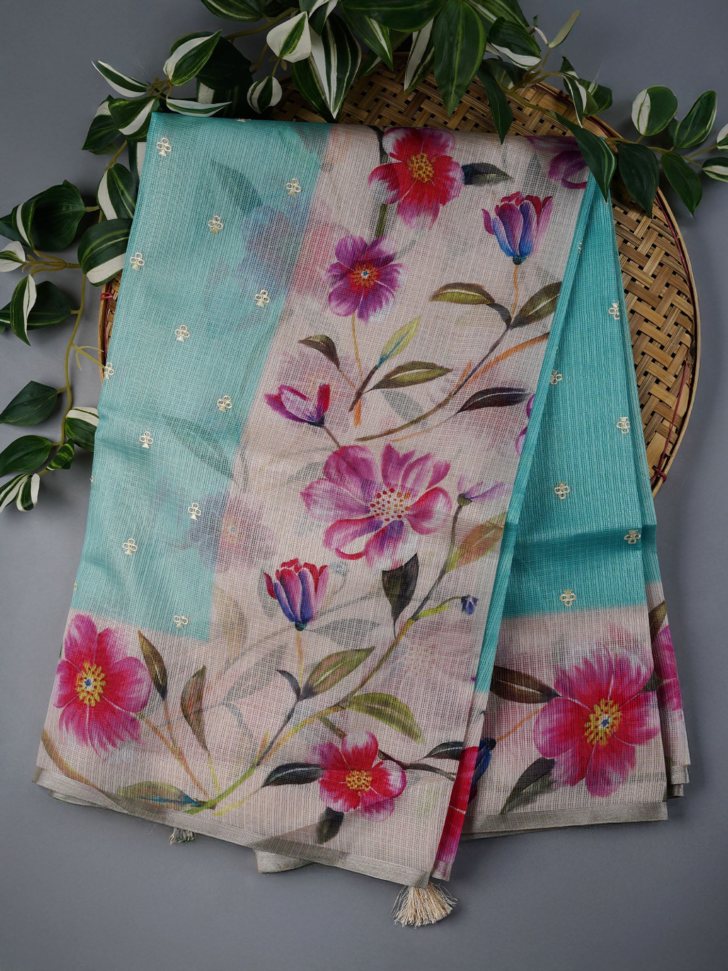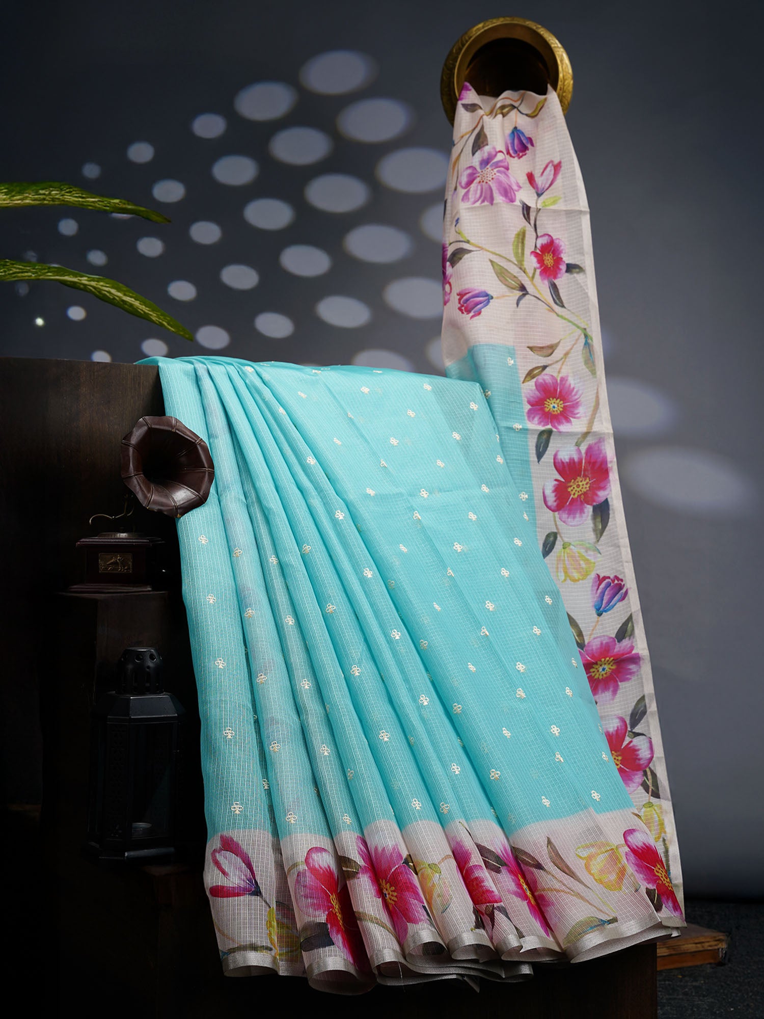 Elevate your ethnic wardrobe with this stunning sky blue Kota silk saree that's pure magic! Featuring intricate thread work butties adorned with a gorgeous floral border, this piece strikes the perfect balance between traditional charm and contemporary elegance. The lightweight Kota silk drapes beautifully, making it ideal for festivals, celebrations, or whenever you want to turn heads. The delicate floral detailing adds a touch of sophistication that works for both casual gatherings and formal occasions. A timeless investment that brings joy to every wear!