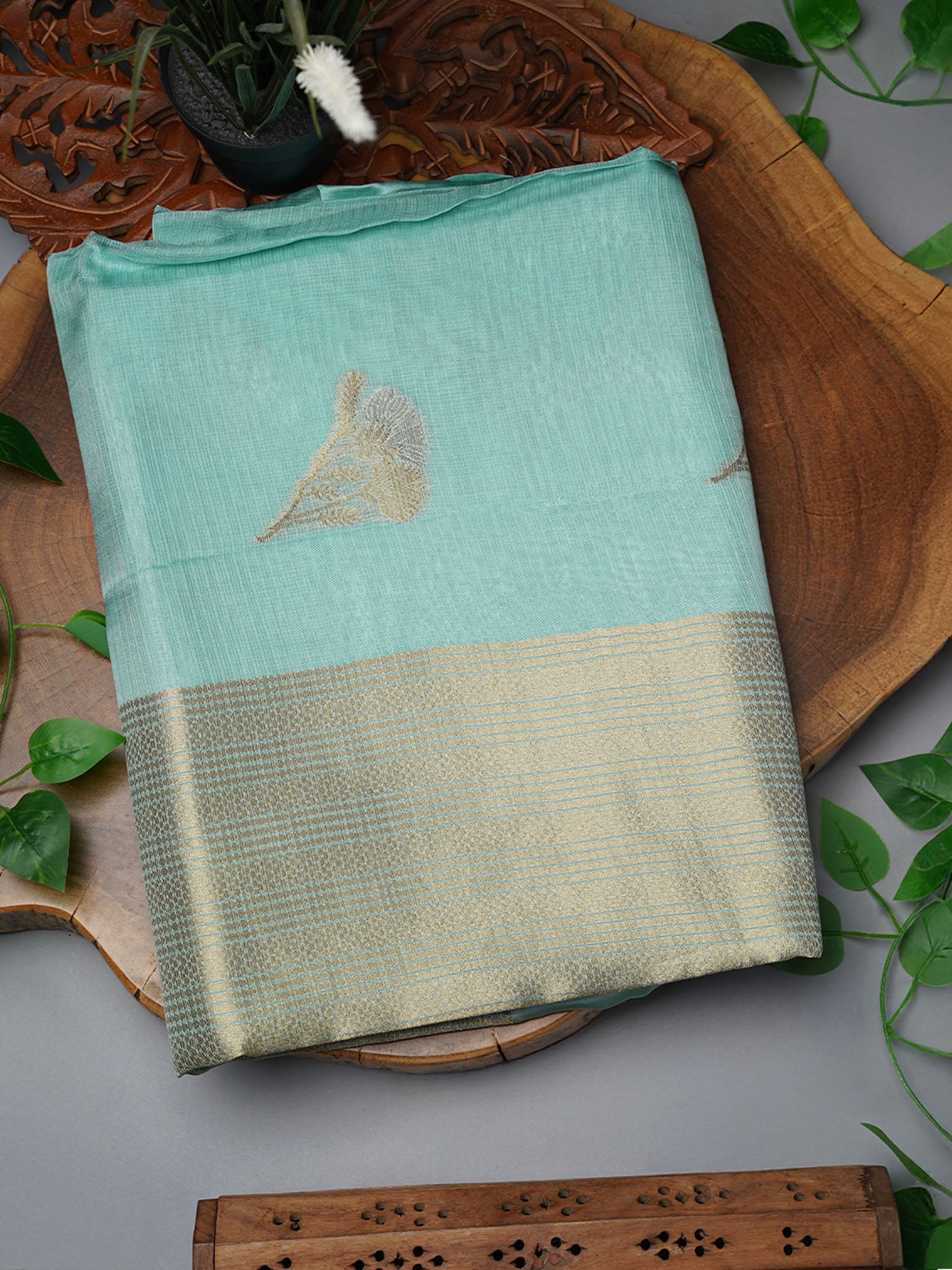 Dive into elegance with this stunning sea green Kota silk saree that's pure magic! Delicate golden butties dance across the...