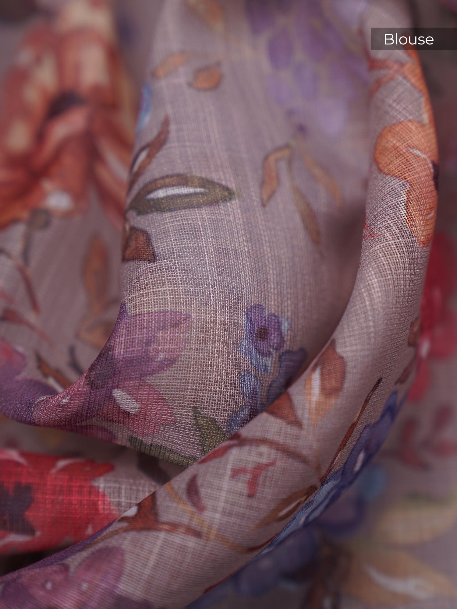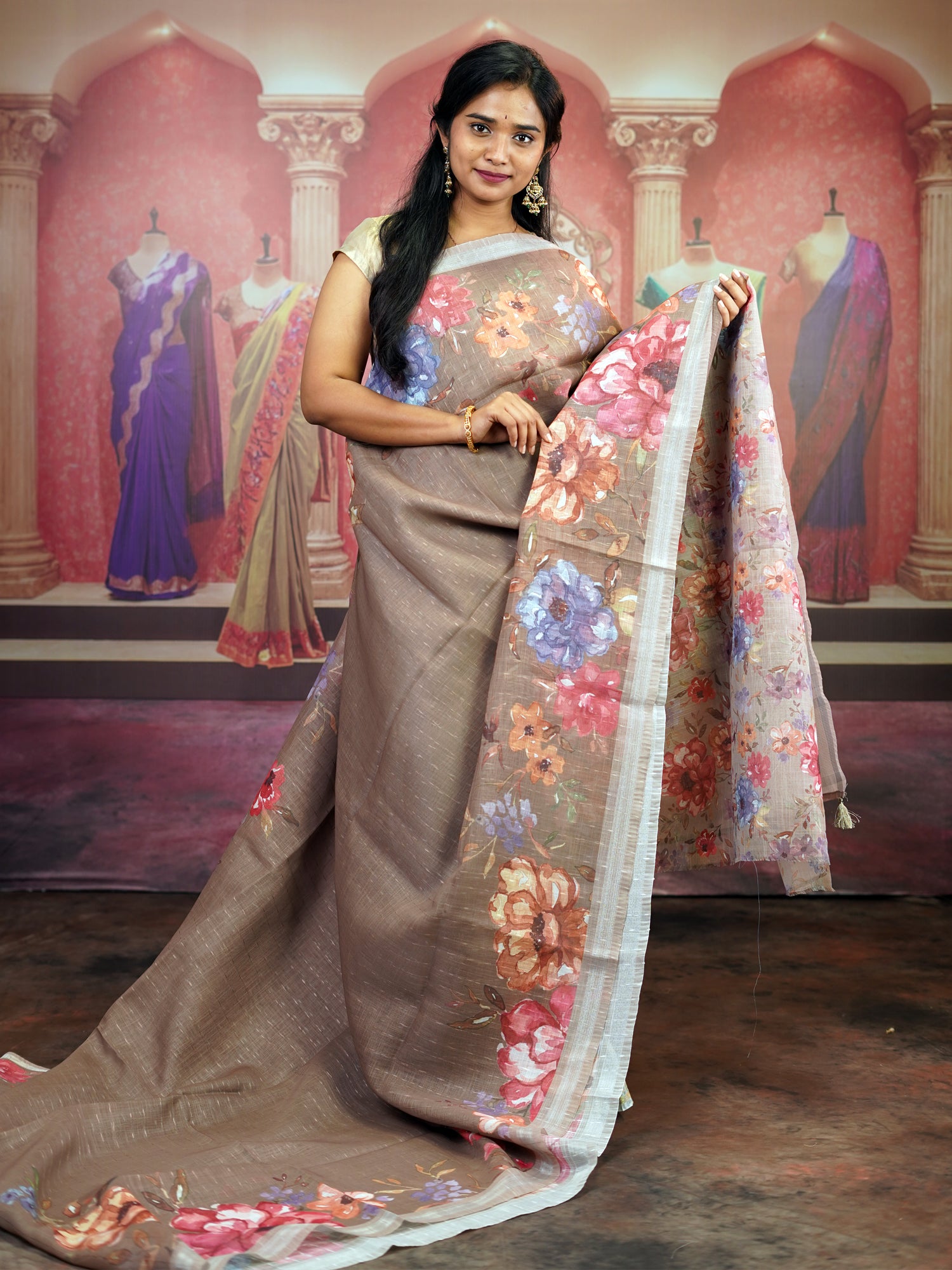 This Lenin Silk saree showcases an exquisite floral pallu complemented by a striking silver zari border. Crafted from smooth, lightweight...