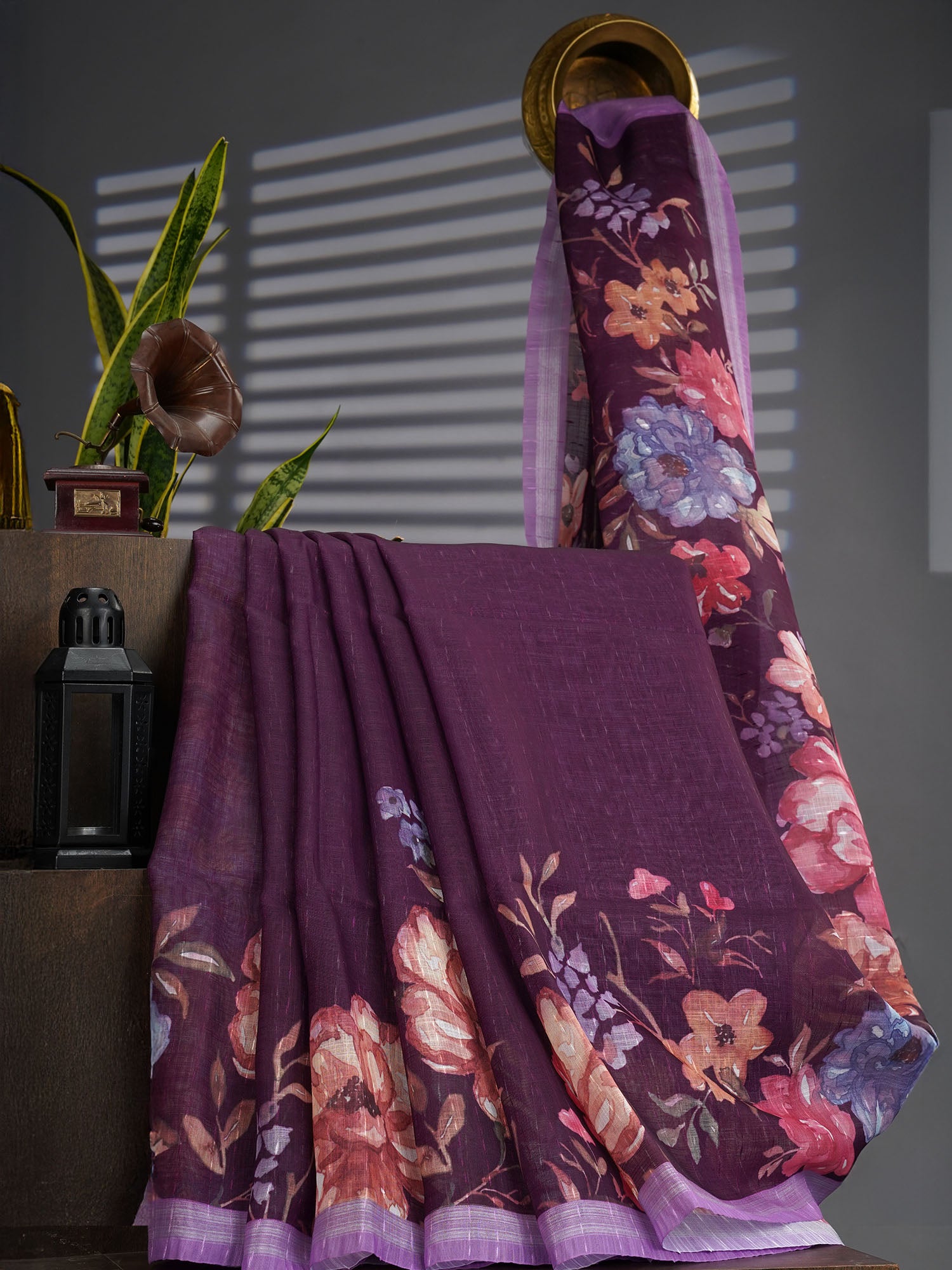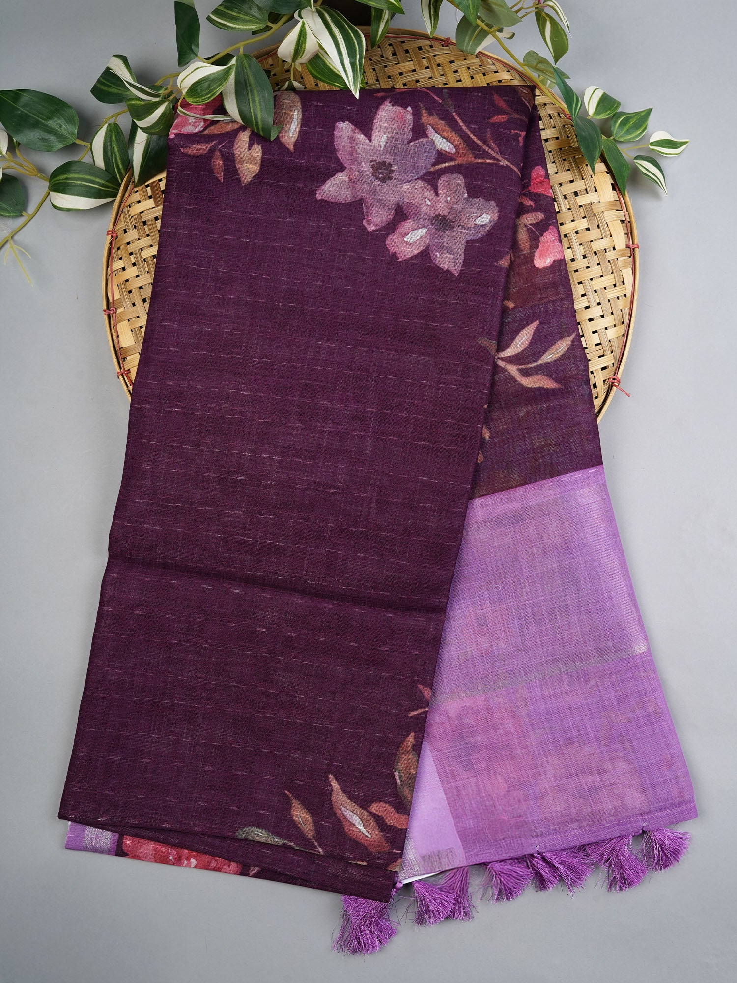Drape yourself in regal elegance with this stunning Lenin silk saree, where vibrant purple meets intricate artistry. The floral pallu steals the show with its delicate botanical motifs, while a shimmering silver zari border frames the entire piece in timeless glamour. Perfect for weddings, festivals, or those moments when you want to feel absolutely magnificent. This isn't just fabric—it's a celebration of traditional craftsmanship wrapped around you like a warm hug from heritage itself.