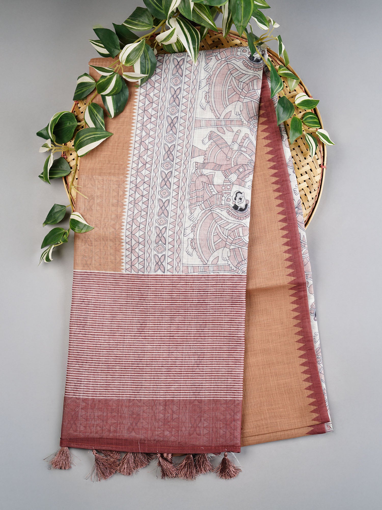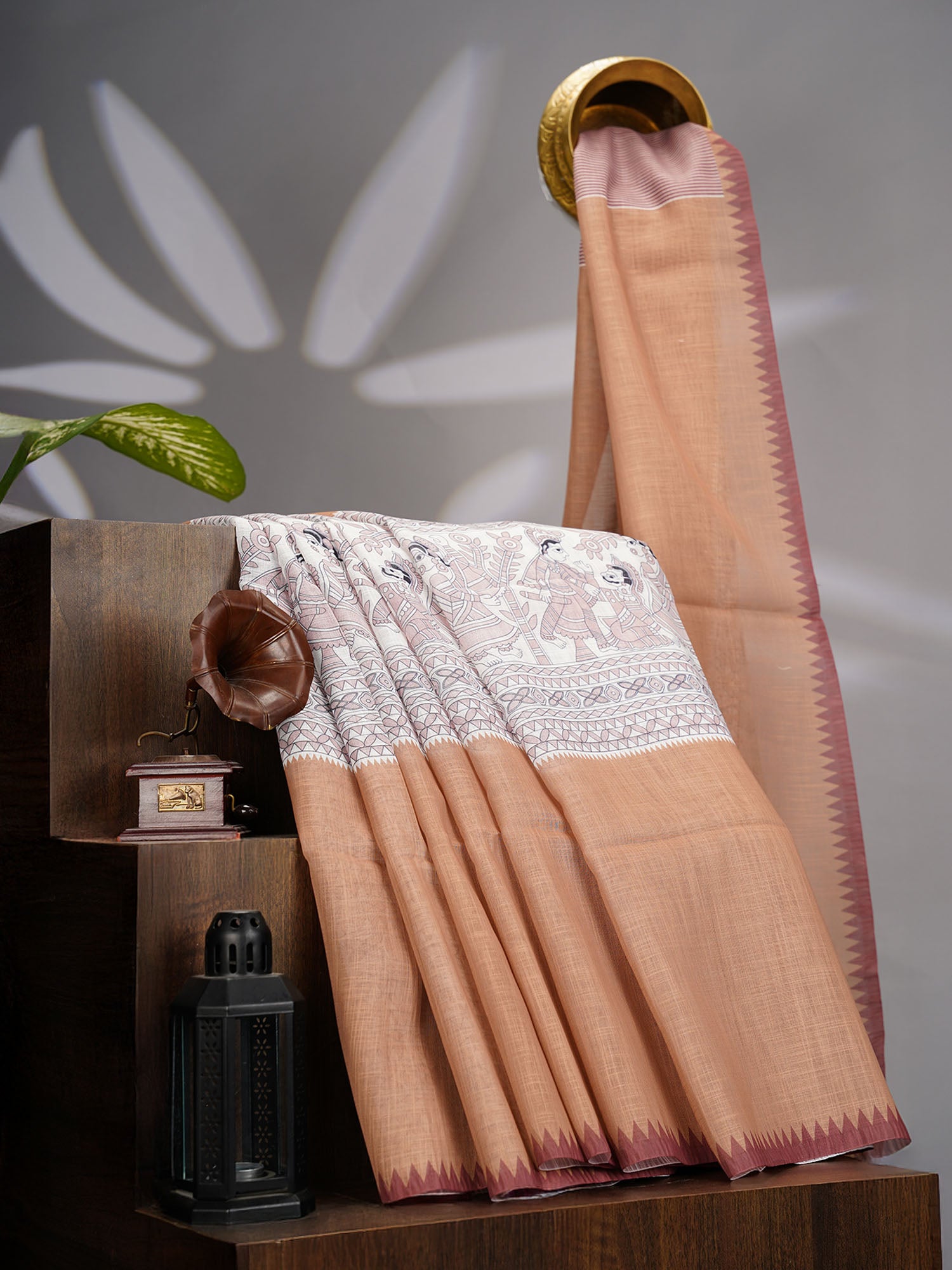 Drape yourself in artistry with this stunning Lenin silk saree, where traditional Madhubani prints dance across rich mustard fabric. The...