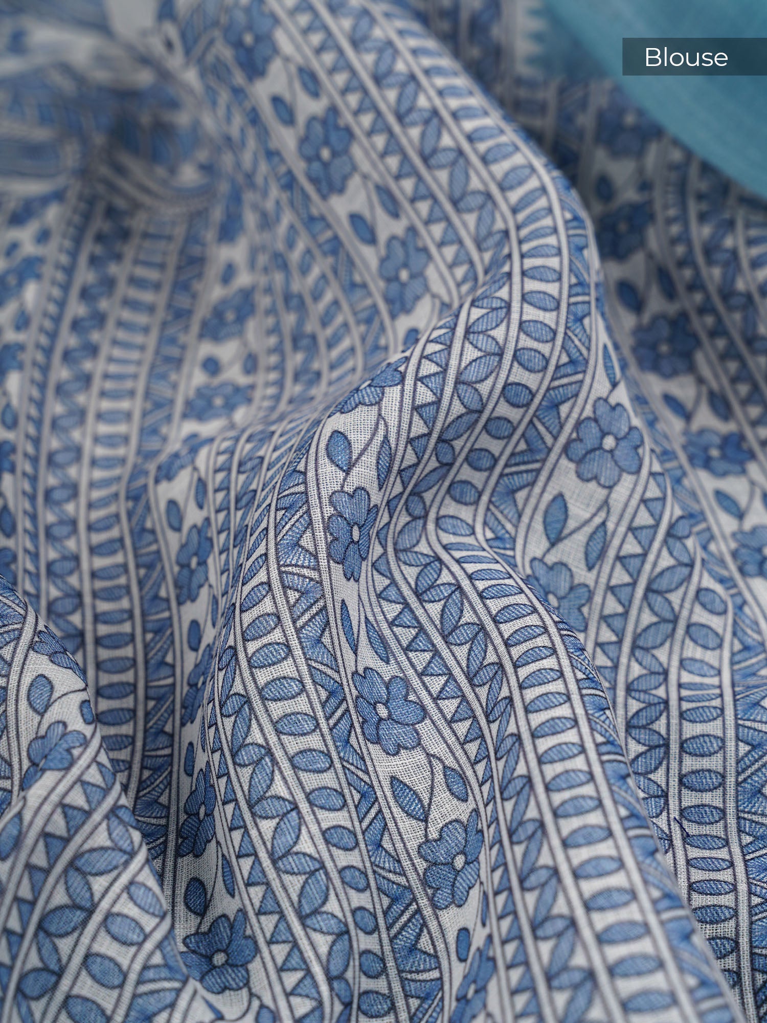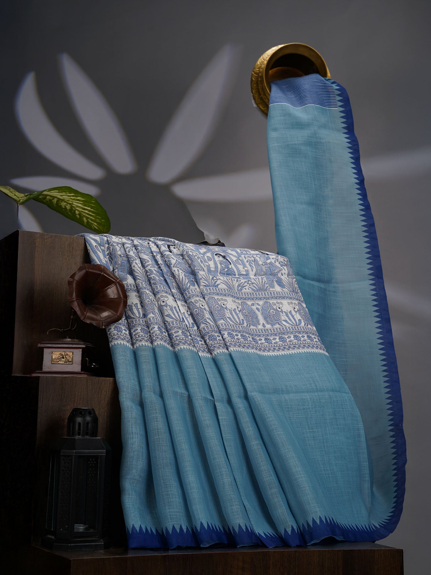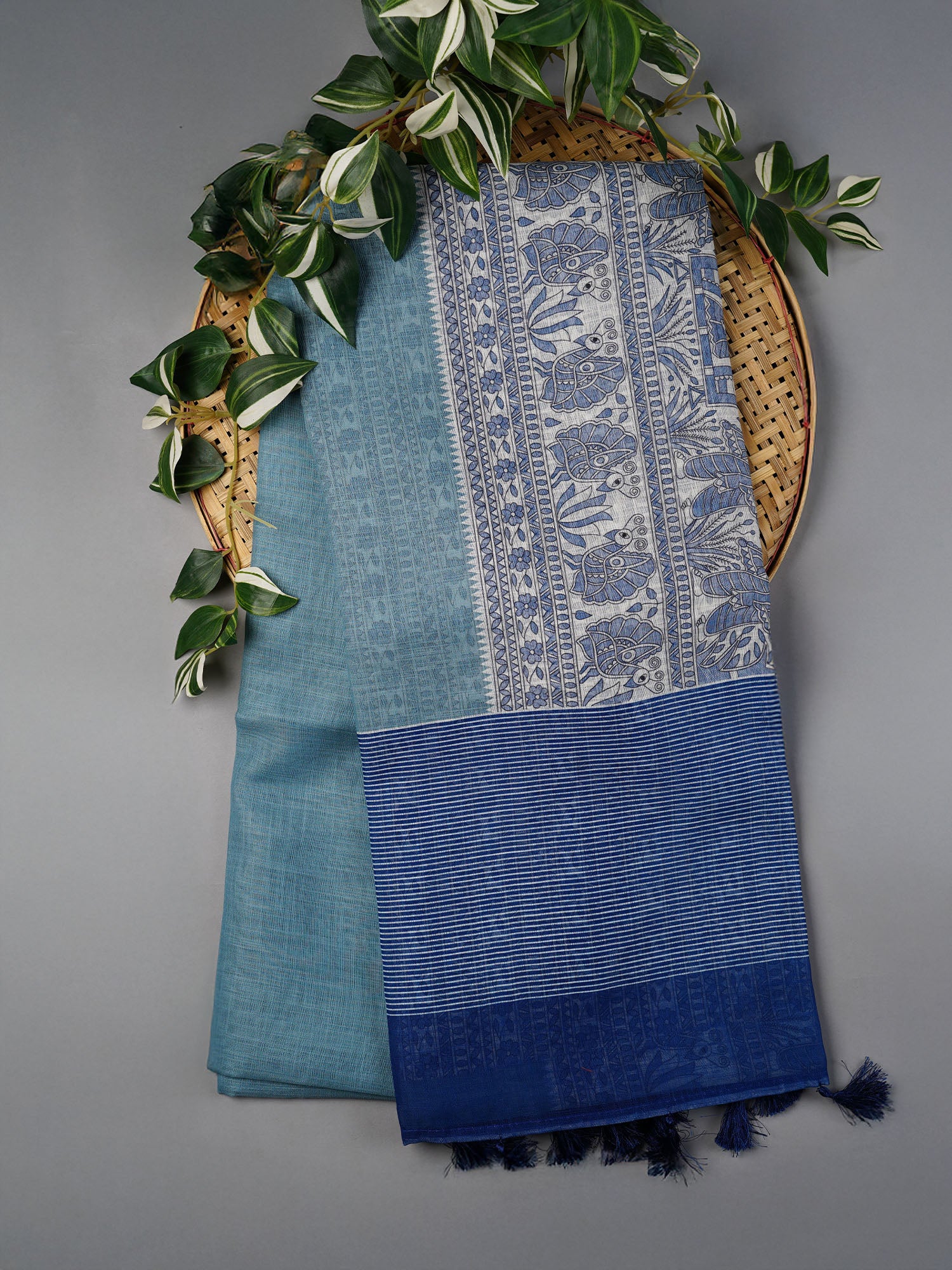 Lenin Silk Saree with Madhubani Print with Contrast Border- Blue