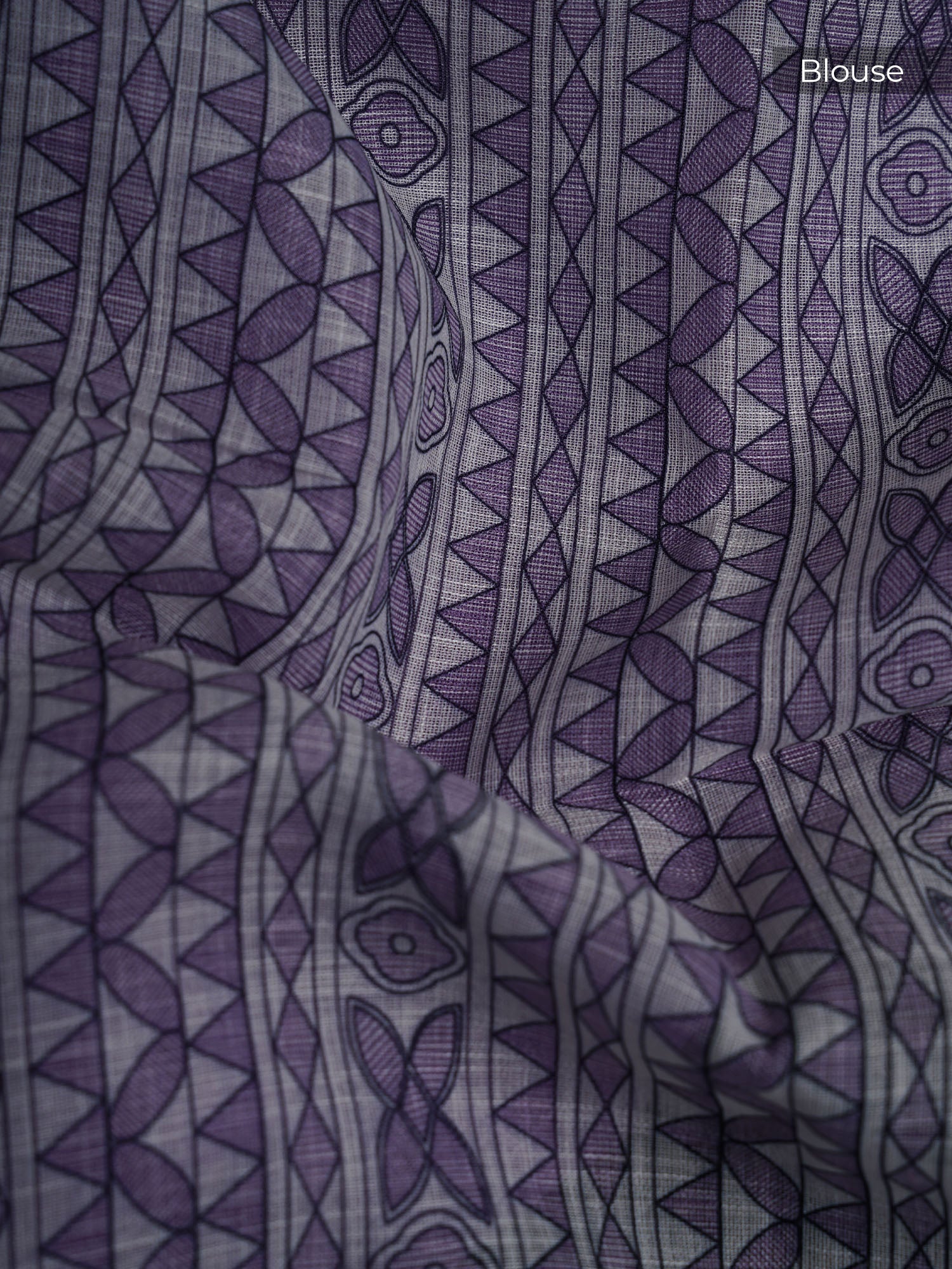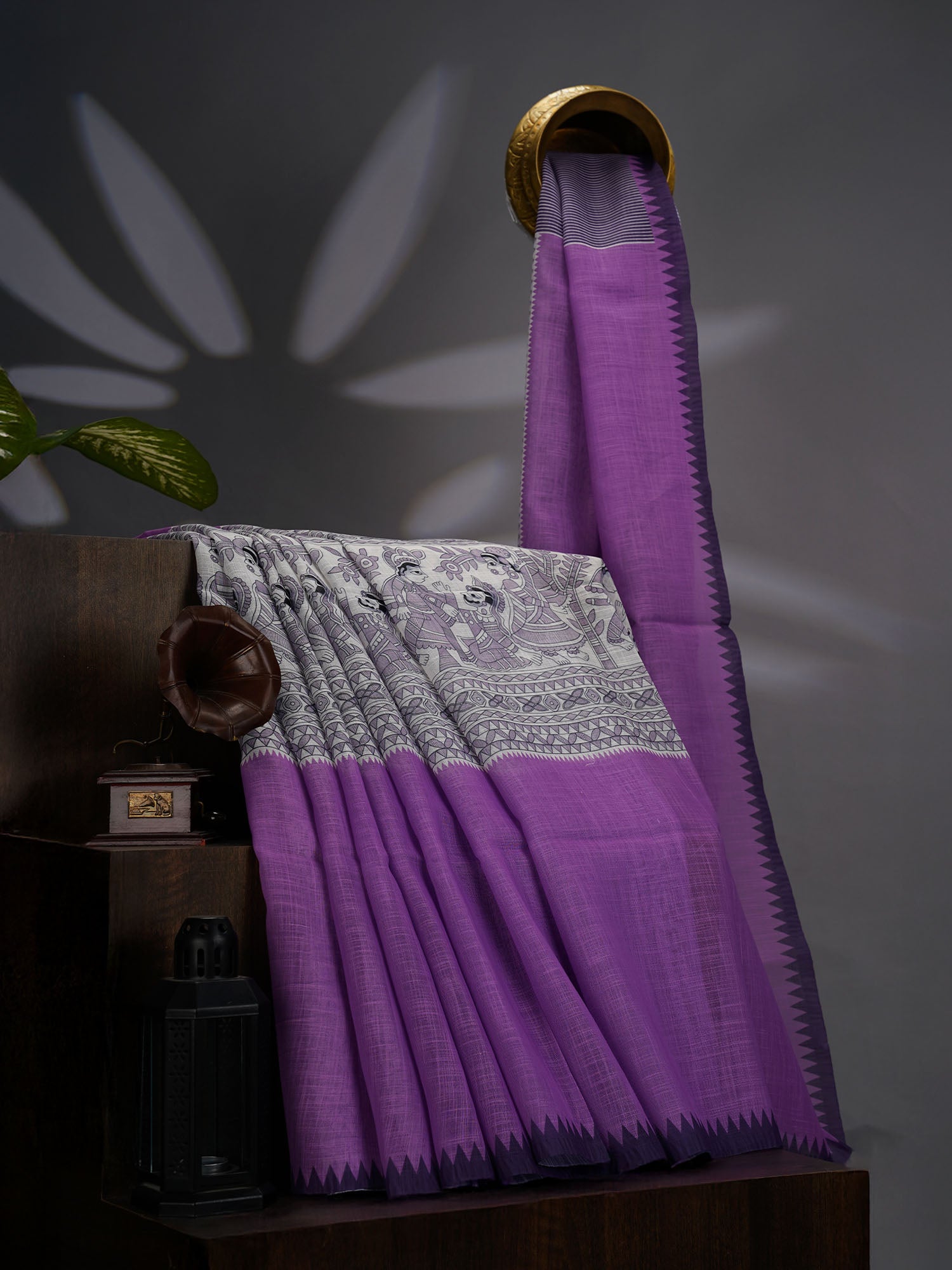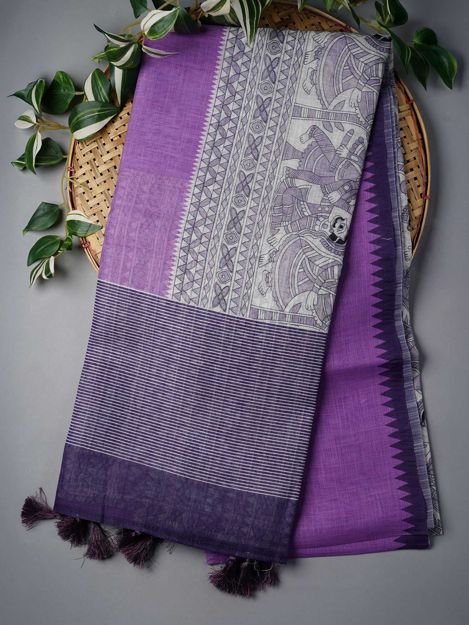 Lenin Silk Saree with Madhubani Print with Contrast Border- Violet