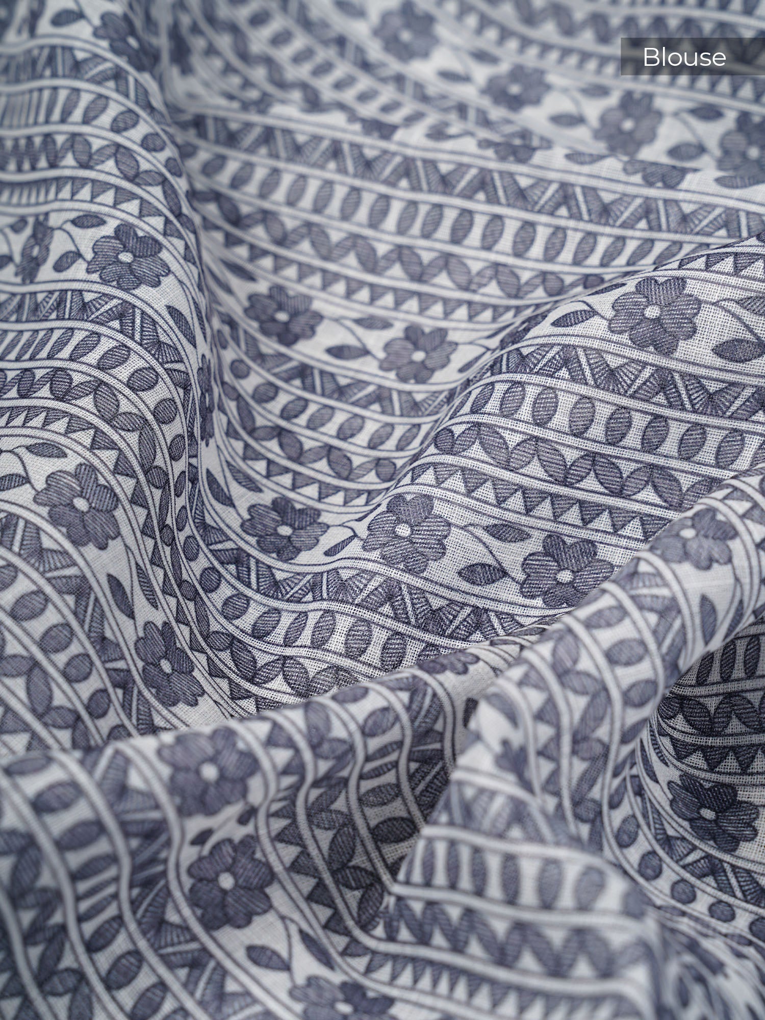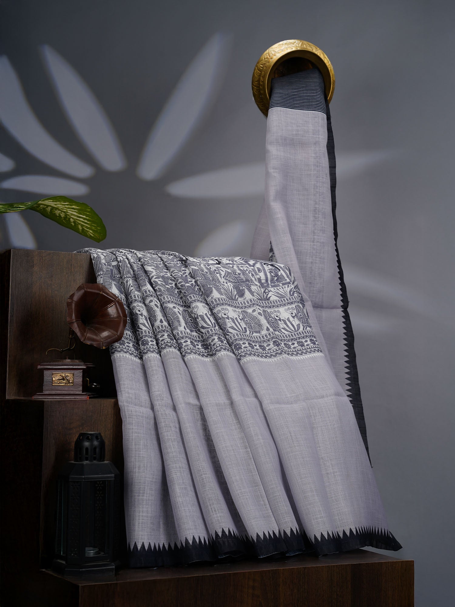 Lenin Silk Saree with Madhubhani Print with Contrast Border- Grey