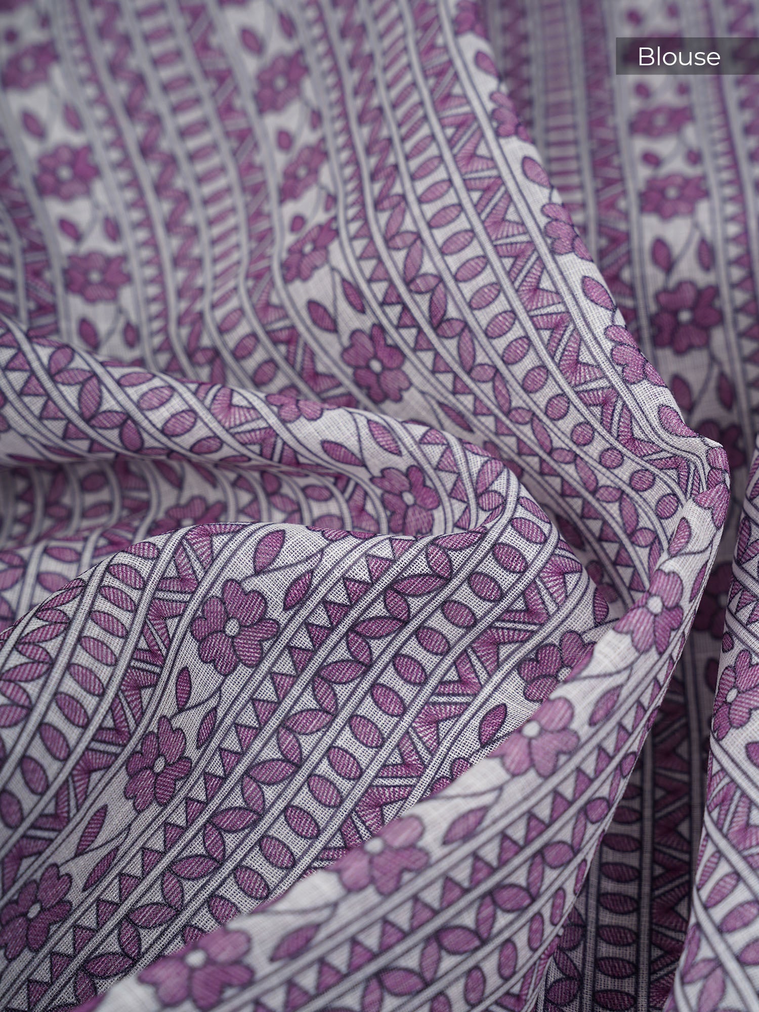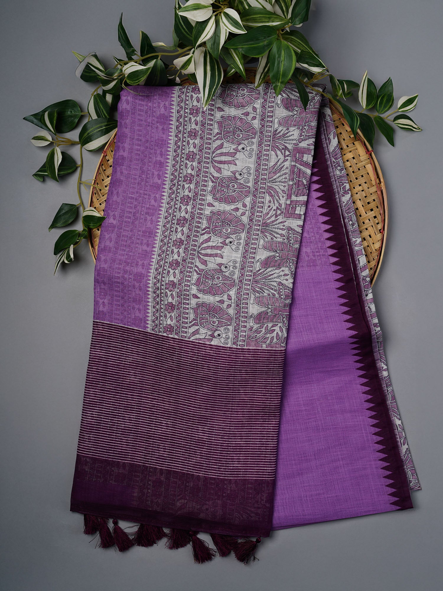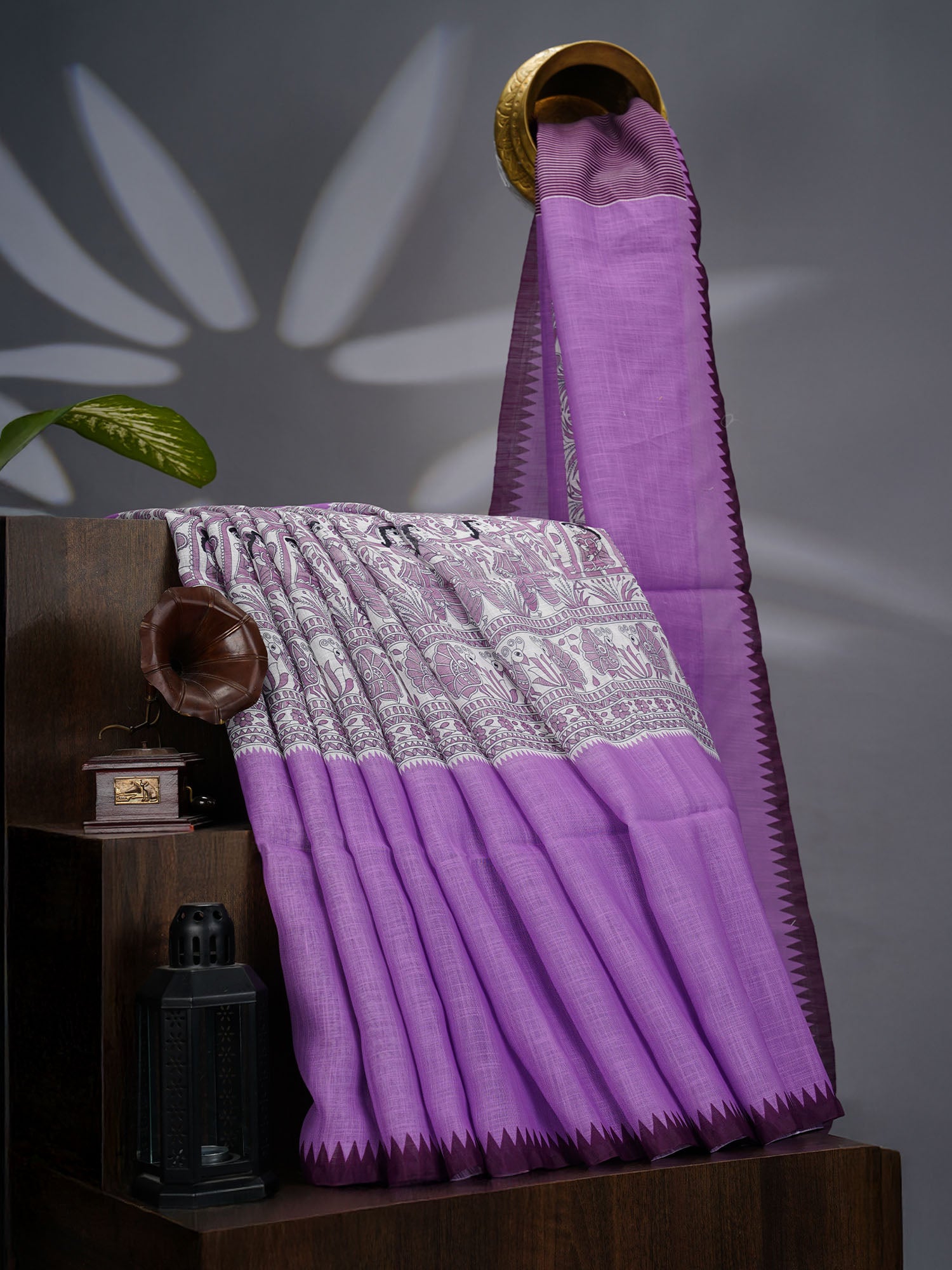 Drape yourself in artistic elegance with this stunning Lenin silk saree, where traditional Madhubani artistry meets modern sophistication. The intricate hand-painted Madhubani motifs dance across lavender silk, creating a mesmerizing canvas of cultural heritage. A striking contrast border frames the design beautifully, adding depth and dimension to every movement. Perfect for celebrations, festivals, or when you want to make a graceful statement, this saree blends timeless craftsmanship with contemporary charm. Embrace the magic of Indian textile tradition wrapped in lavender luxury.