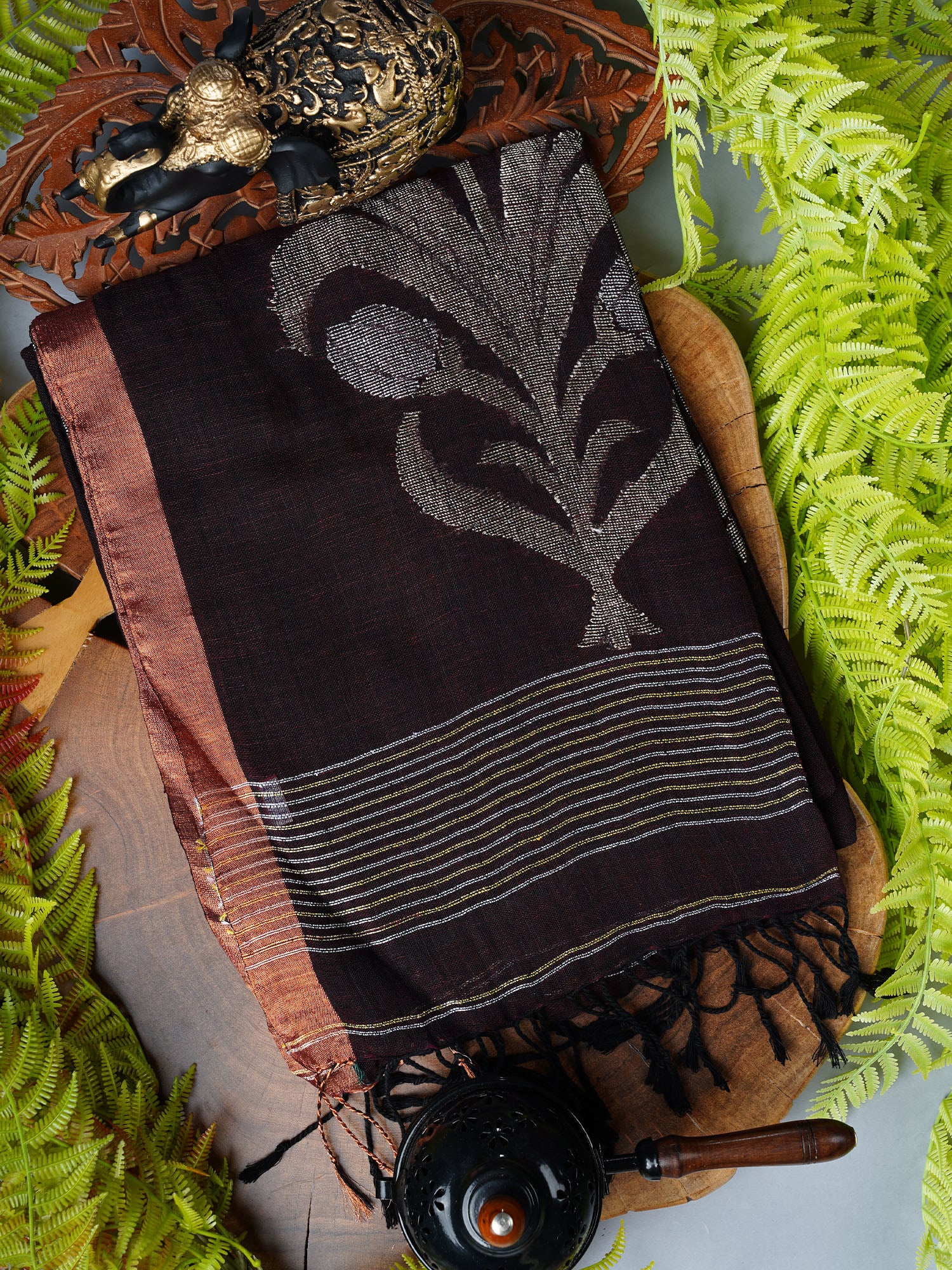Elevate your ethnic wardrobe with this stunning wine-hued saree that blends comfort with glamour. Crafted from a breathable linen-cotton blend,...