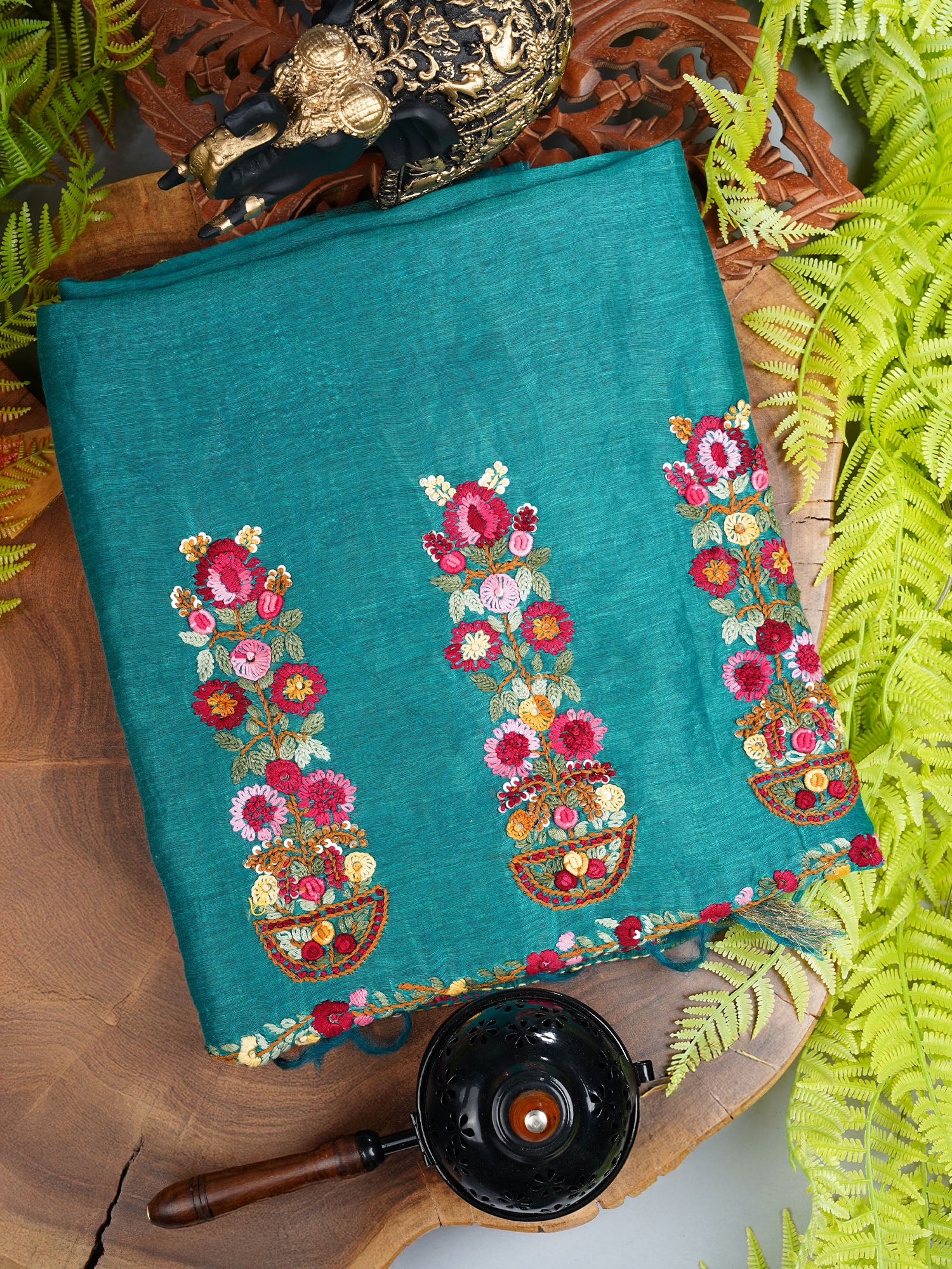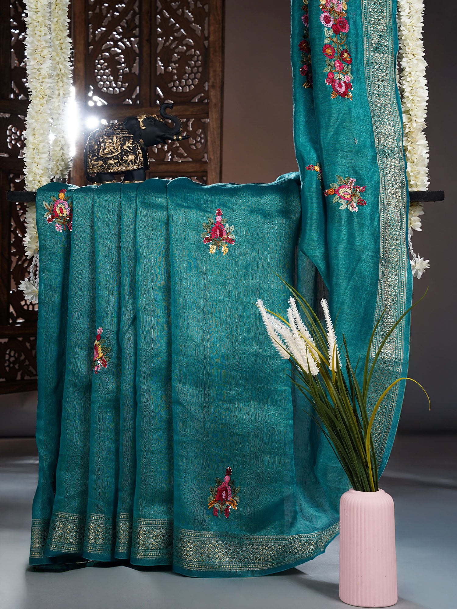 Discover the perfect blend of tradition and comfort with this stunning linen saree, where delicate kantha embroidery dances across the fabric like brushstrokes on canvas. The shimmering golden zari border frames the piece with timeless elegance, catching light with every movement. Lightweight linen keeps you cool and breathable, making it ideal for warm days without compromising on style. Whether you're heading to a celebration or elevating your everyday look, this saree brings that effortless grace that turns heads. A modern take on classic craftsmanship that feels as good as it looks.