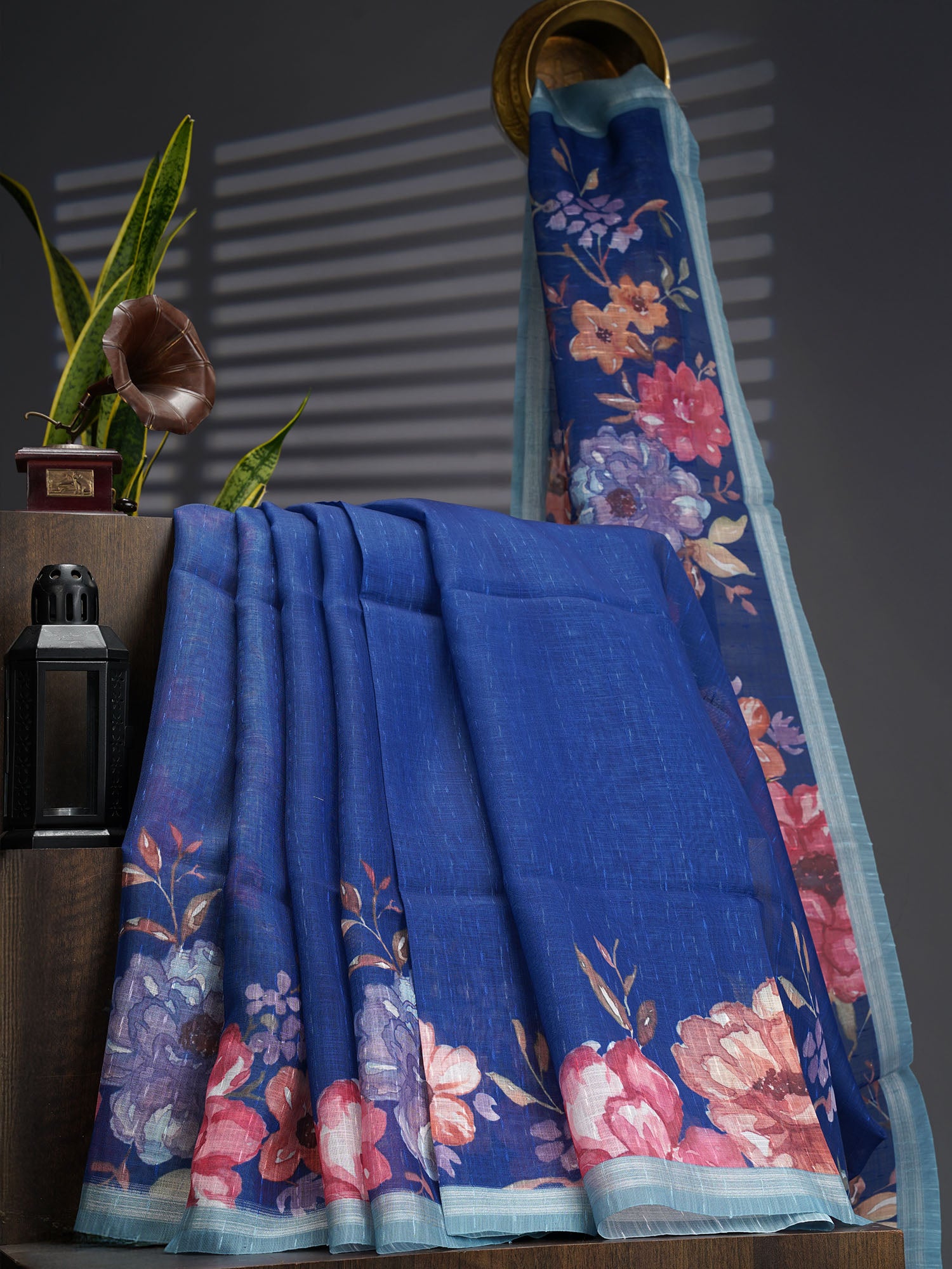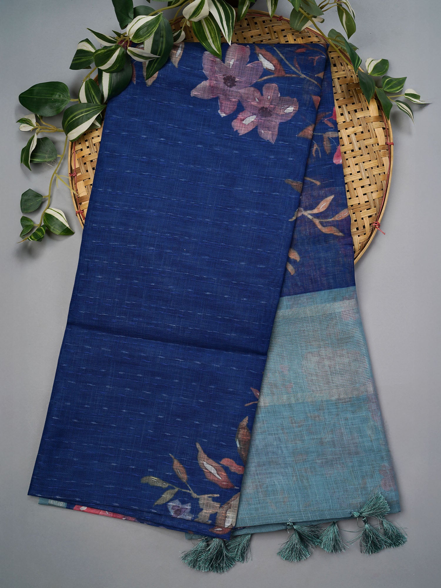 Dive into timeless elegance with this stunning linen-silk blend saree that marries comfort with sophistication. The intricate floral pallu steals the show, adorned with shimmering silver zari borders that catch light beautifully. Rich blue tones create a versatile canvas perfect for weddings, celebrations, or elevated everyday wear. The luxurious fabric blend ensures breathability without compromising on that coveted drape and sheen. A modern twist on traditional craftsmanship that'll have you feeling absolutely radiant.