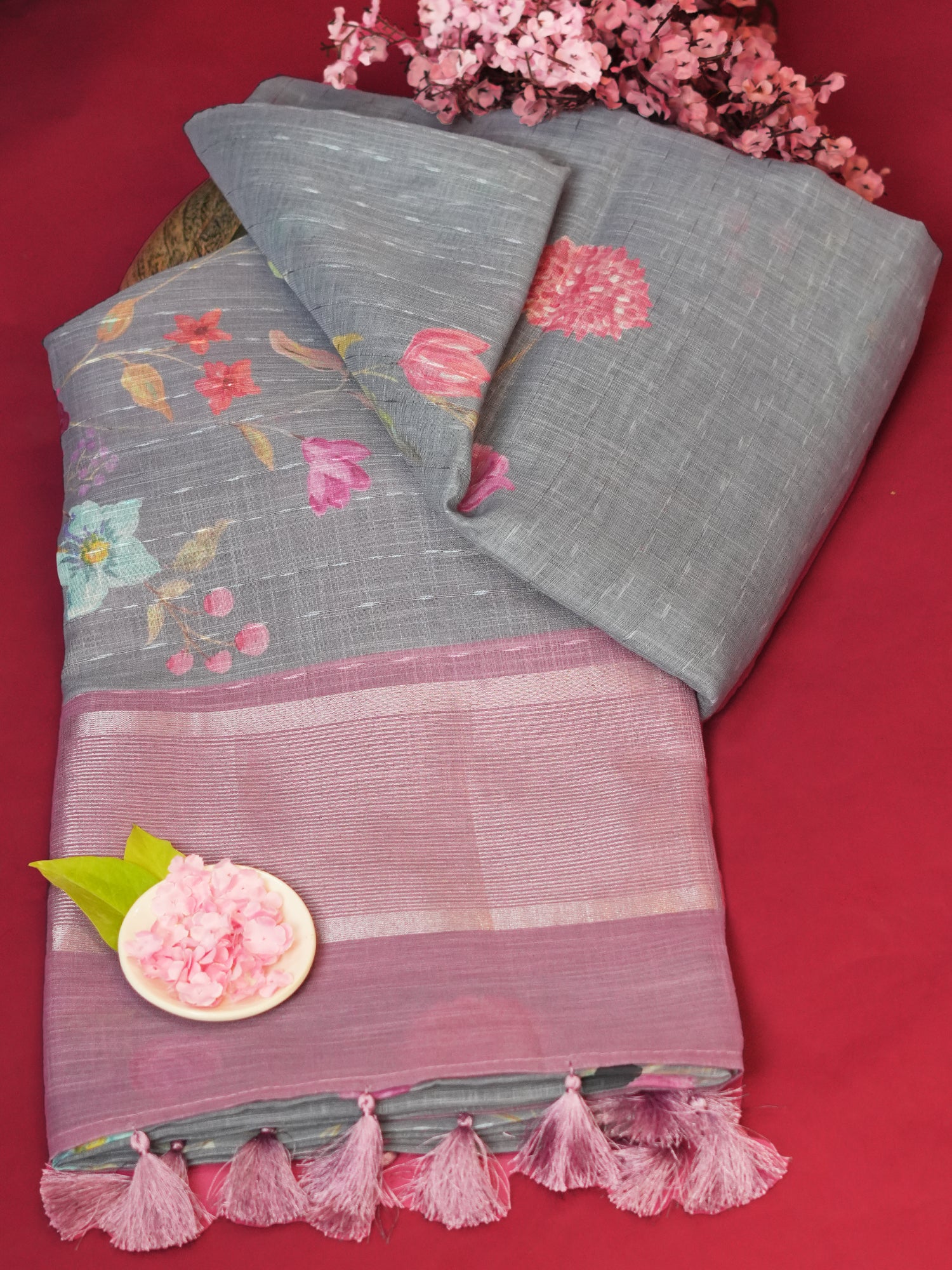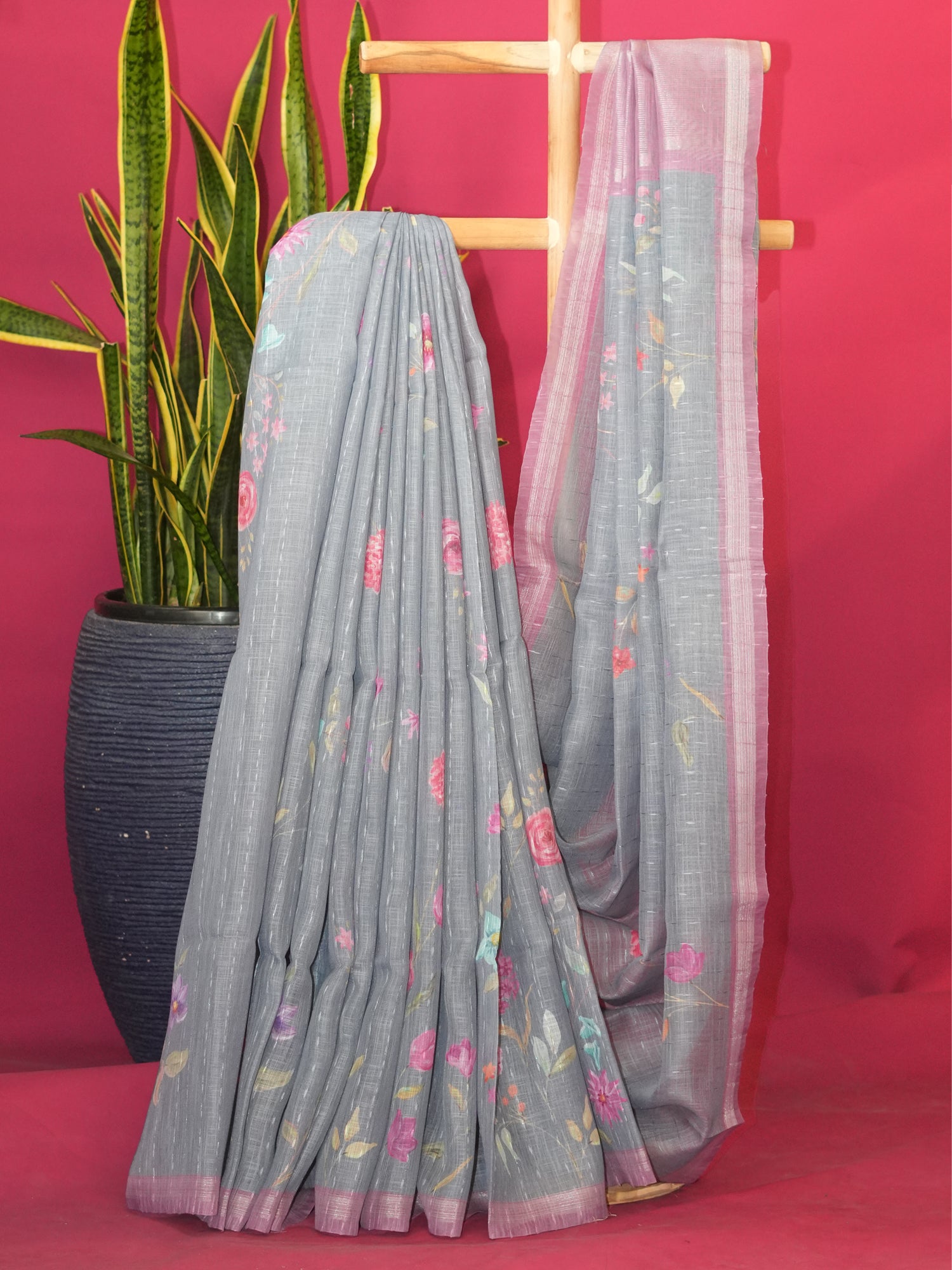 Discover the perfect blend of comfort and elegance with this linen silk saree featuring a stunning floral print and striking contrast border in sophisticated grey. The lightweight linen-silk blend makes it ideal for warm weather while maintaining that graceful drape every saree lover craves. The delicate floral motifs paired with a bold contrast border create a modern twist on traditional styling, giving you versatility for both casual gatherings and festive occasions. Effortlessly chic, breathable, and utterly wearable—this grey beauty is ready to become your go-to pick for any season.