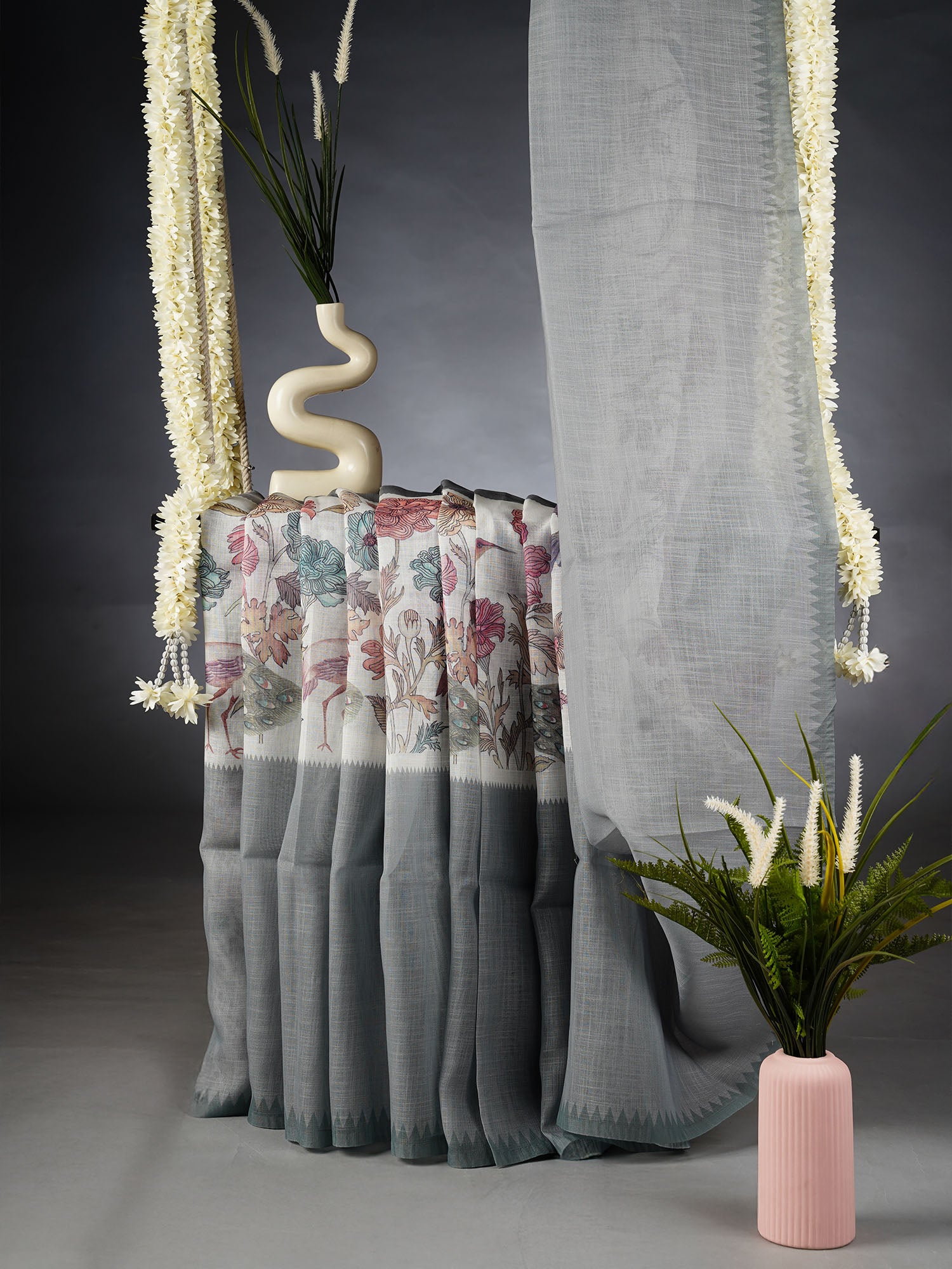 Discover effortless elegance with this linen silk saree, where soft natural fibers meet vibrant artistry. The delicate floral print dances...
