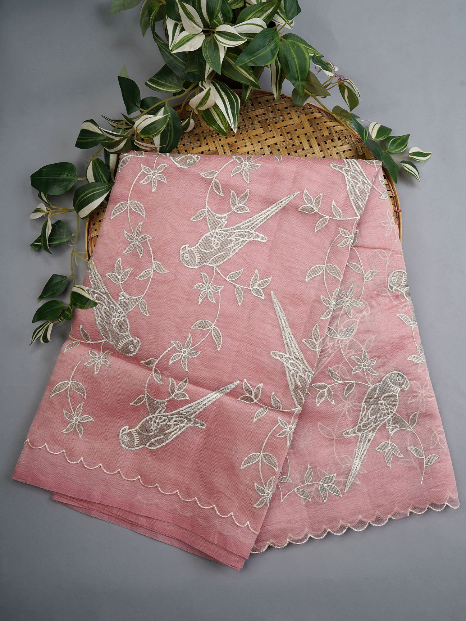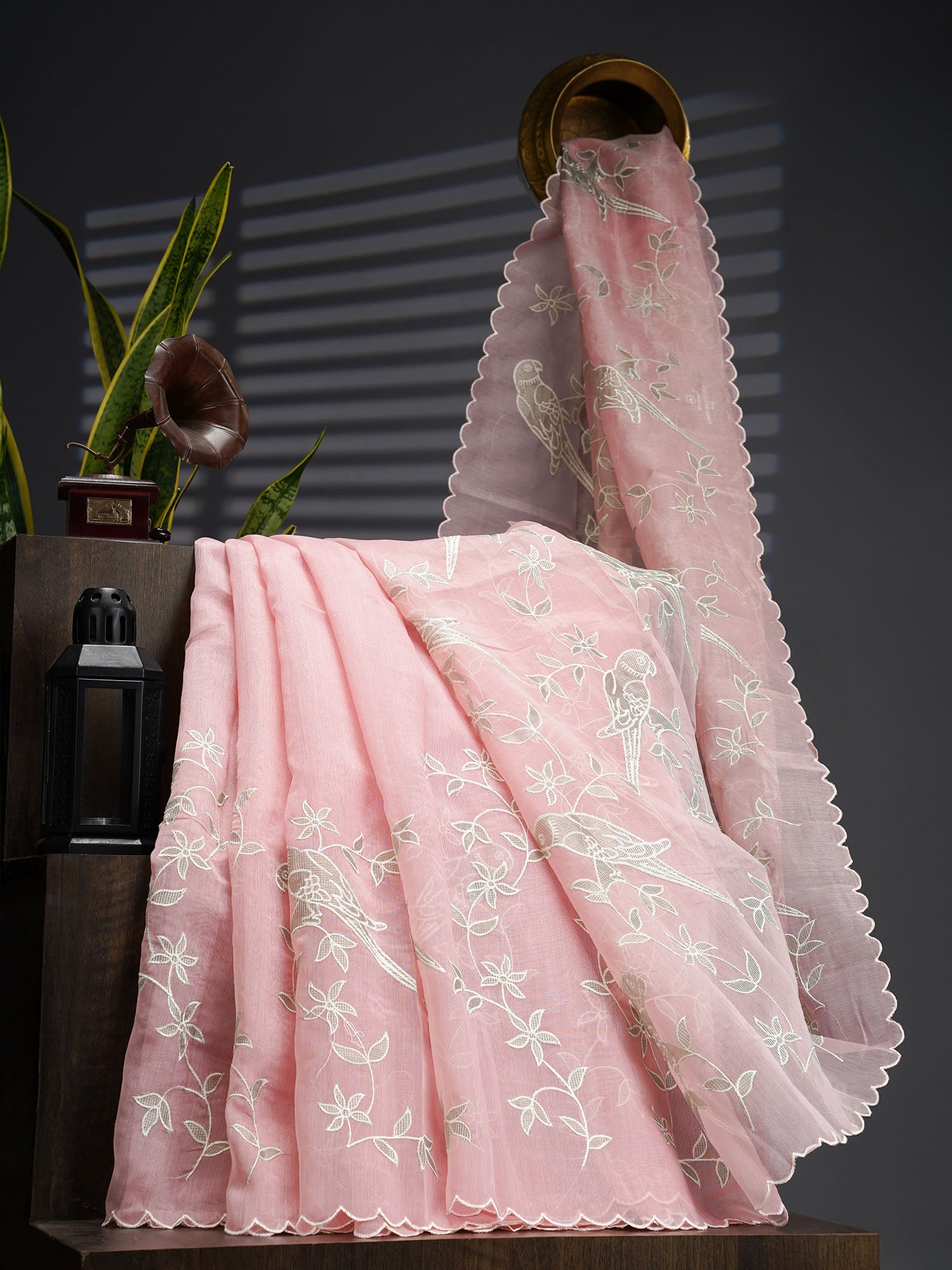 Linen Tissue Saree With Applique Work And Scallop Border - Baby Pink