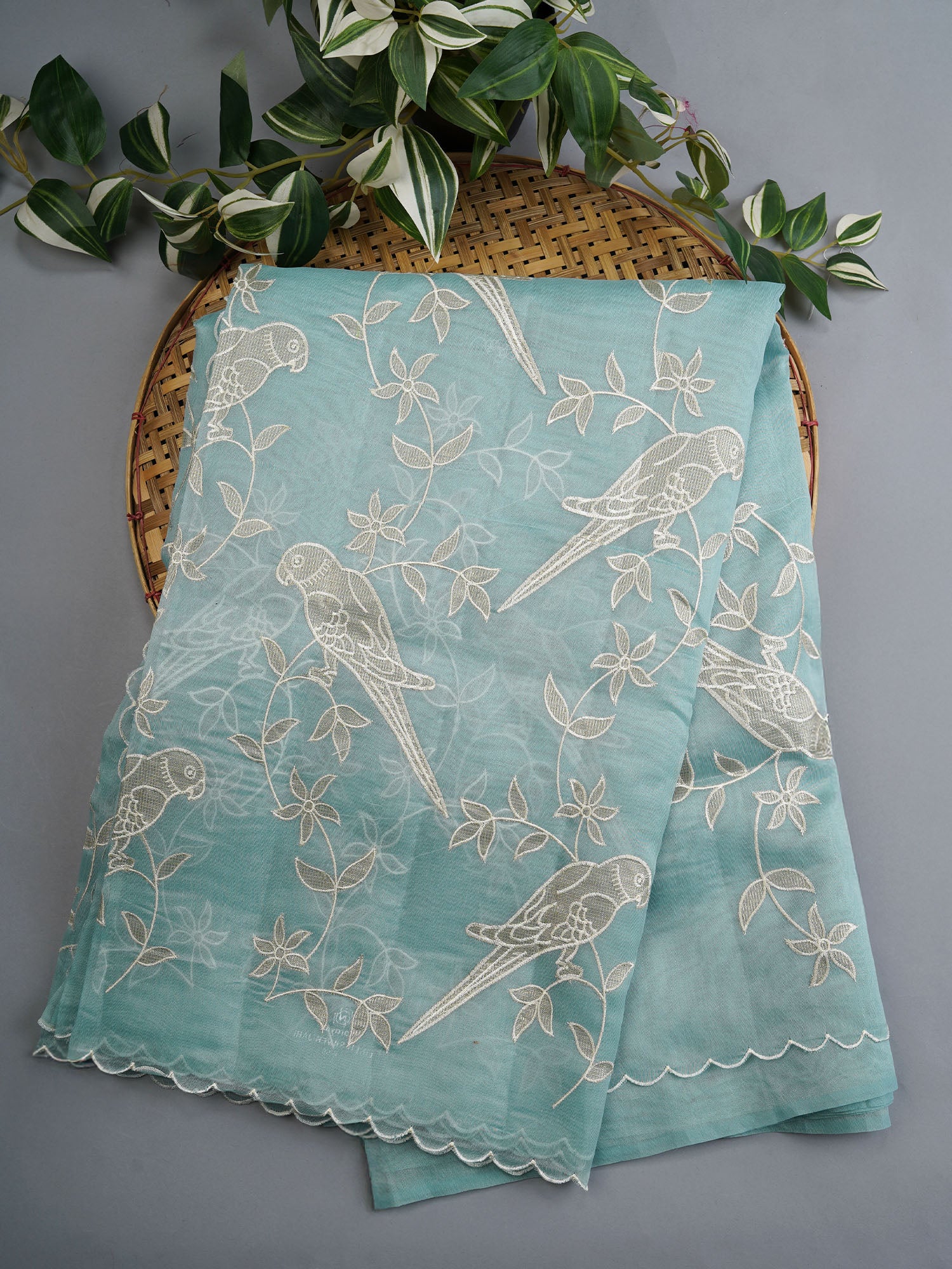 Linen Tissue Saree With Applique Work And Scallop Border - Sky Blue