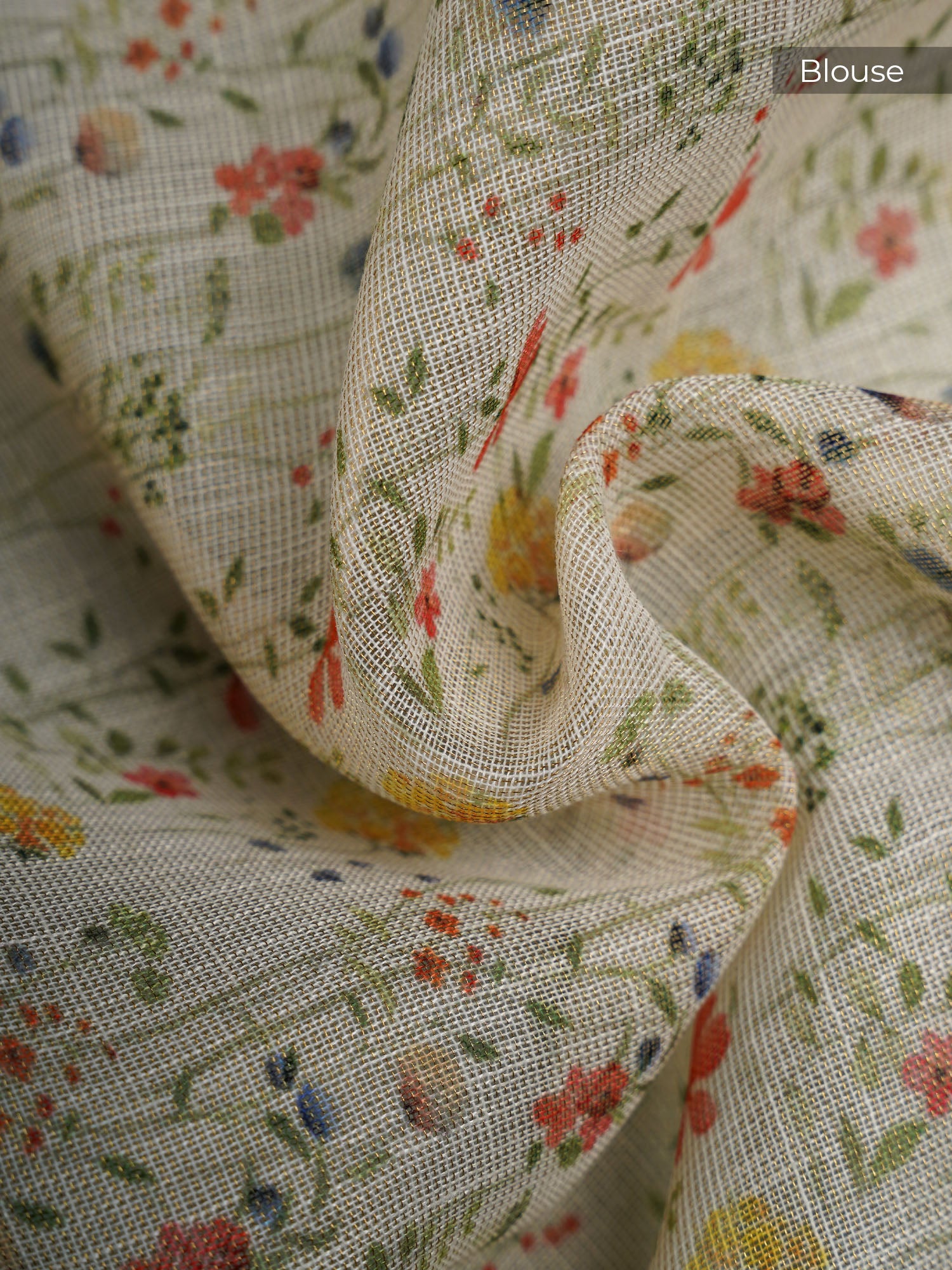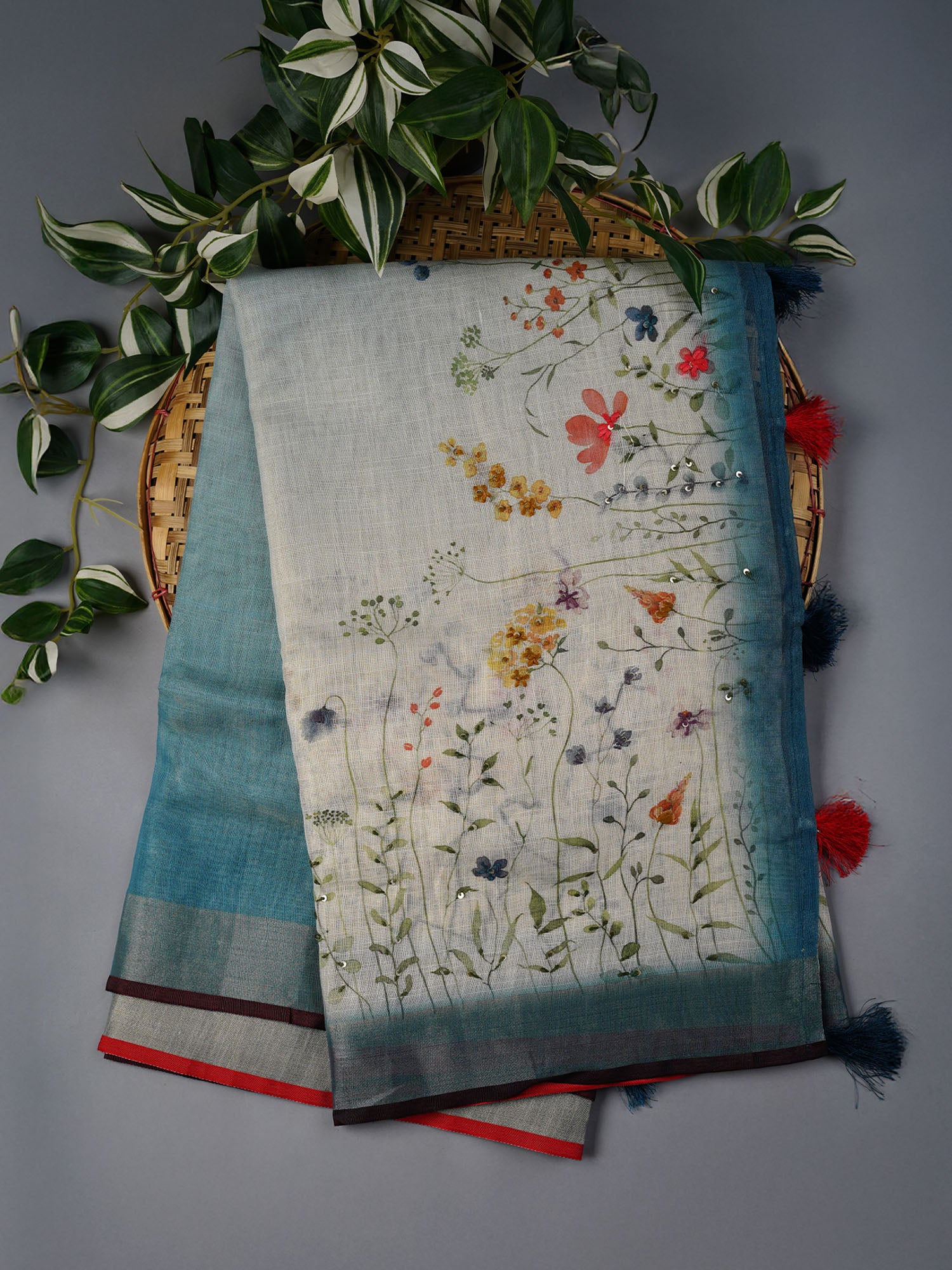 Linen Tissue Saree With Floral Print & Knot Work - Beige & Peacock Blue