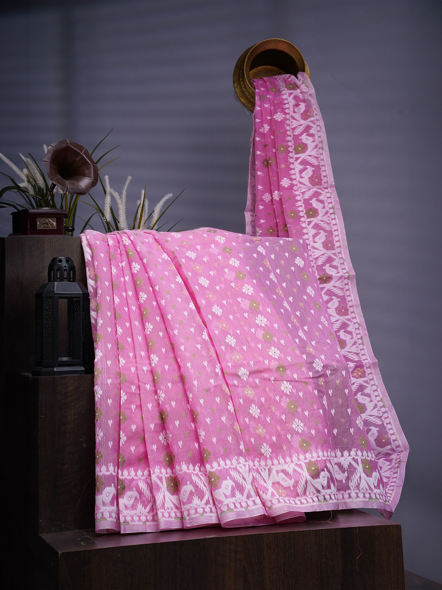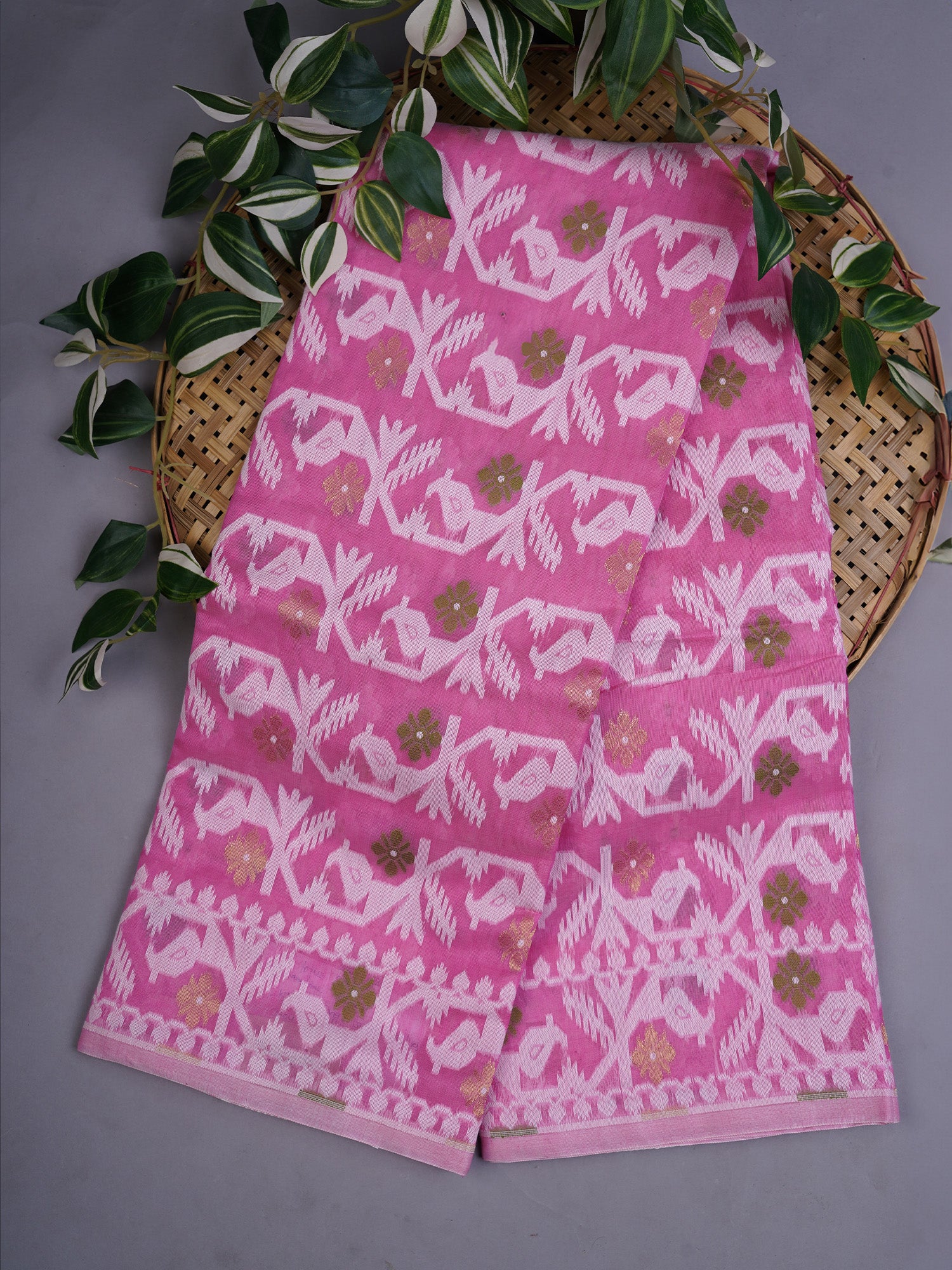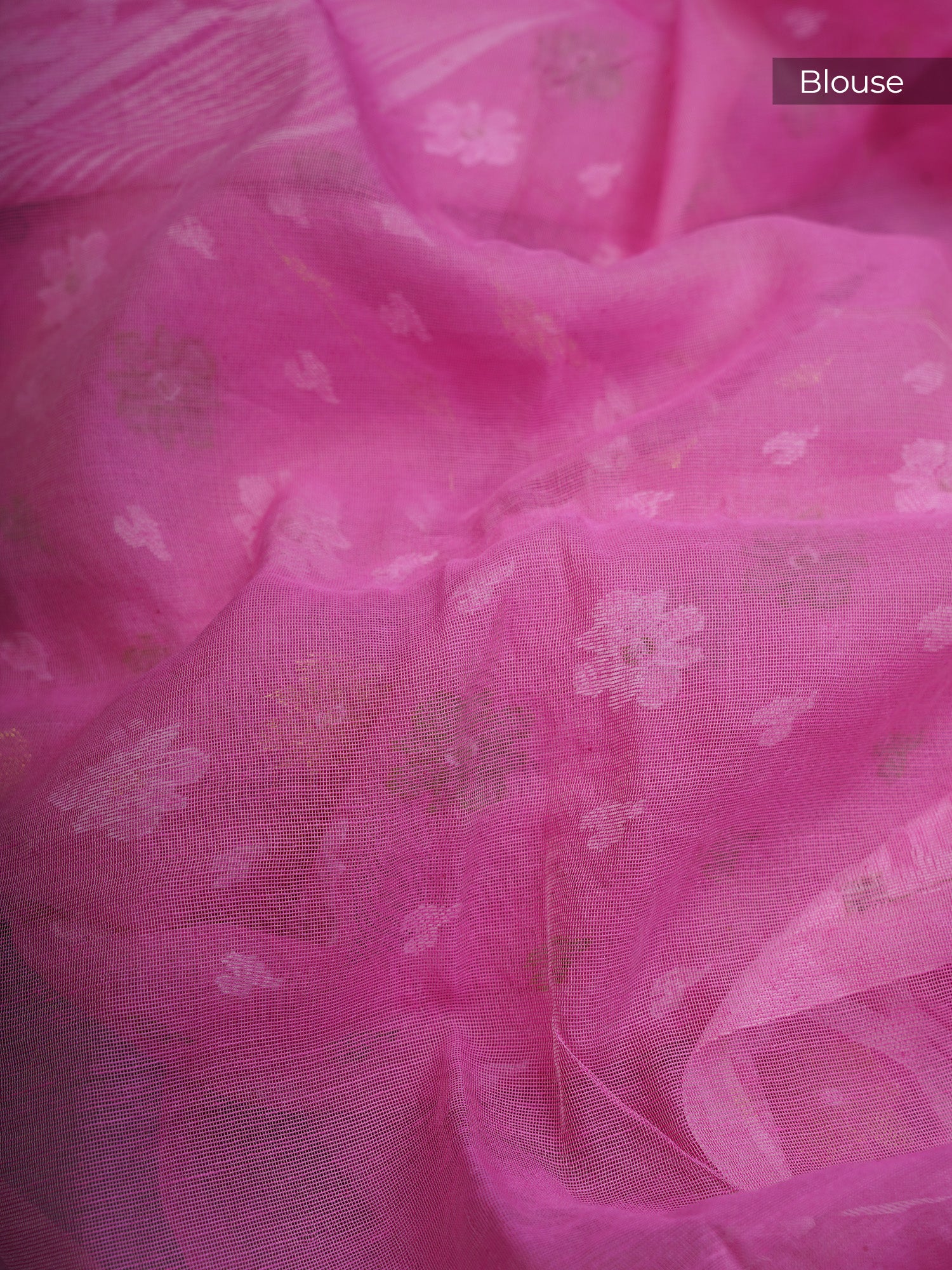 Discover the timeless elegance of this Lotus Cotton Ikkat saree, featuring an exquisite golden buttis pattern against a delicate baby pink backdrop. Crafted from premium lotus cotton, this fabric offers a luxurious drape with natural breathability, making it ideal for both everyday wear and special occasions. The traditional ikkat weaving technique creates distinctive geometric motifs that showcase authentic craftsmanship. The golden buttis add a touch of sophistication and shimmer, elevating the saree's refined aesthetic. Perfect for those who appreciate classic Indian textiles with contemporary appeal, this piece seamlessly blends heritage artistry with comfort and style.