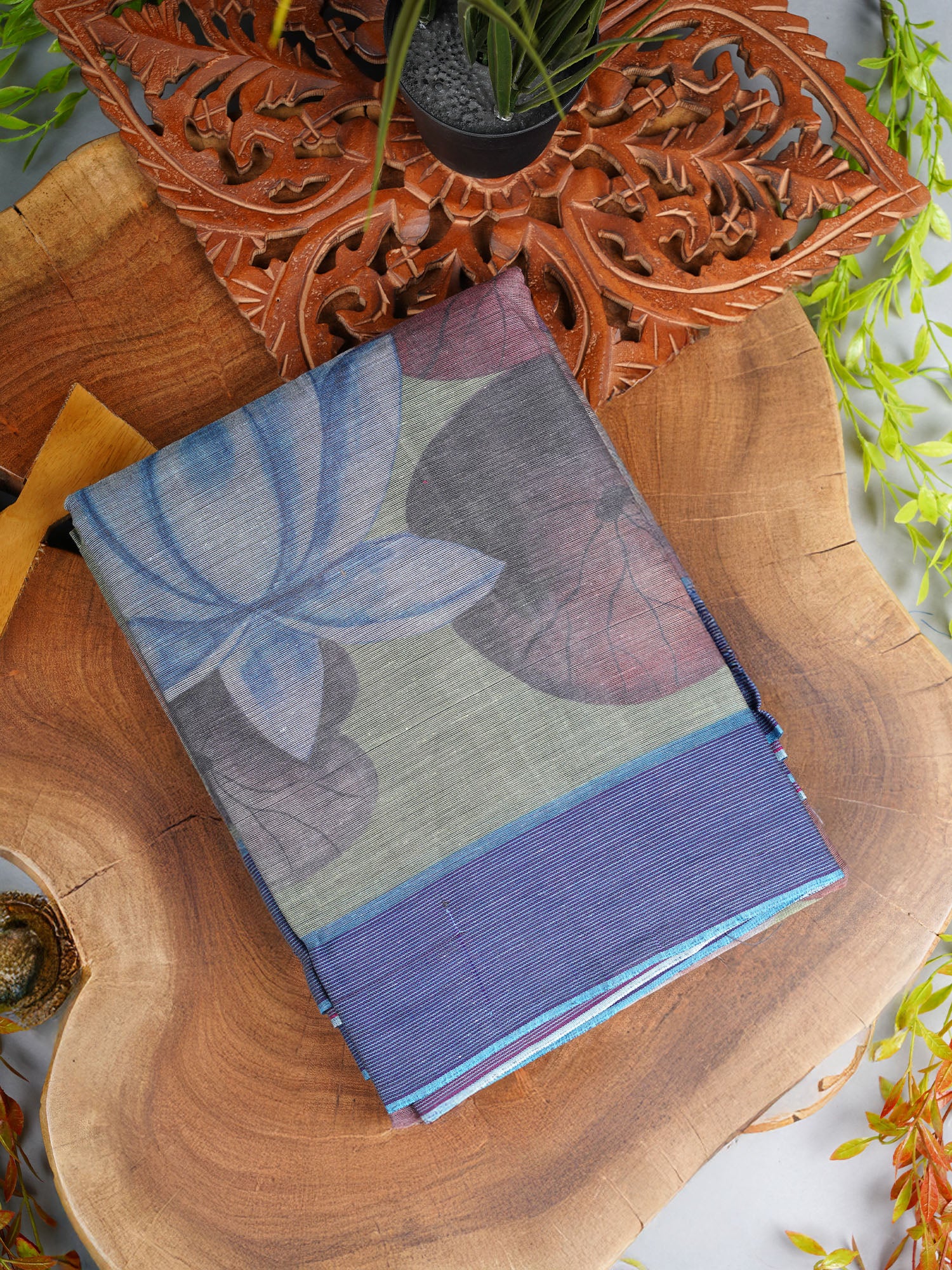 Lotus Cotton Saree With Floral Print And Contrast Border - Green