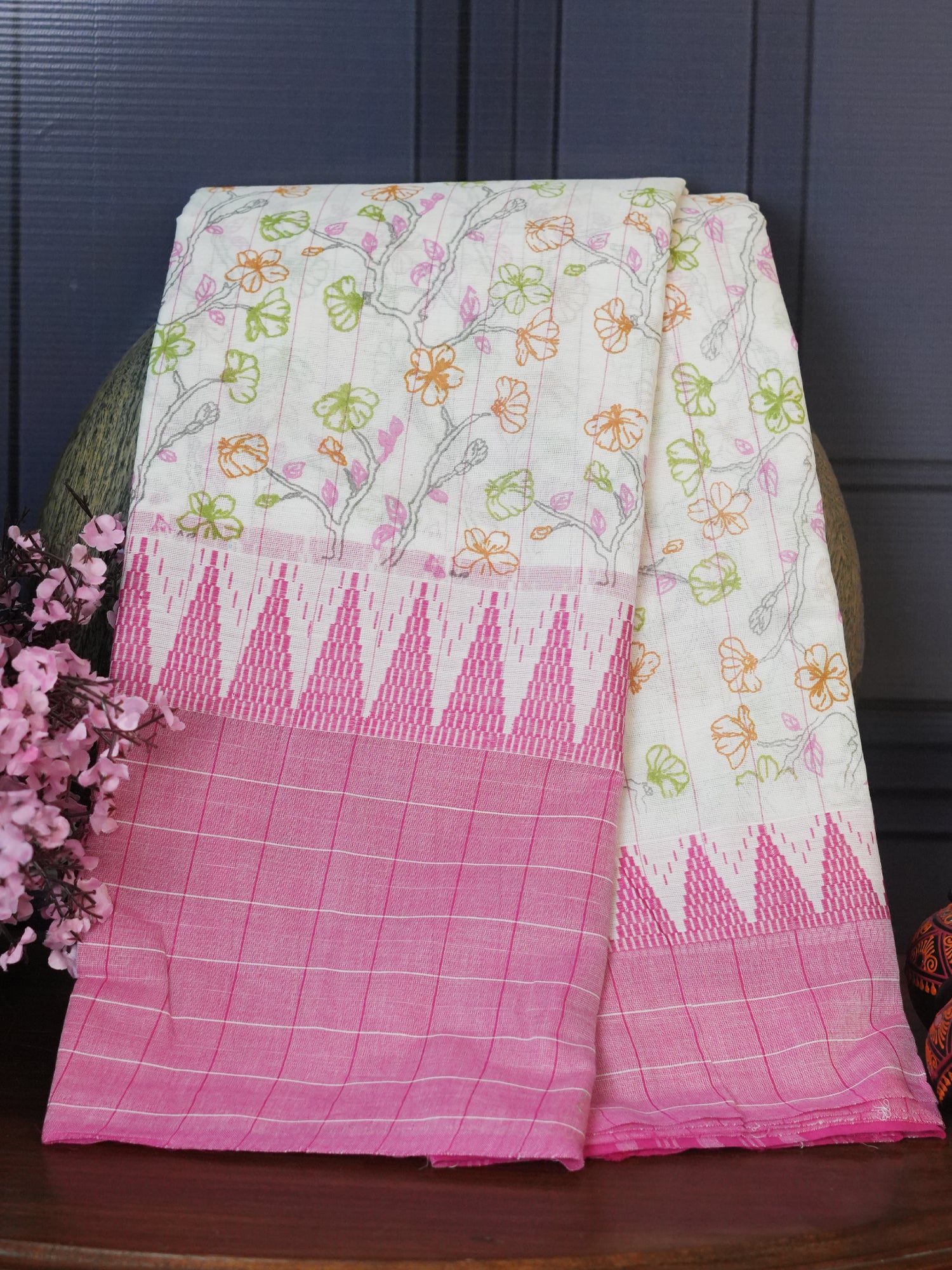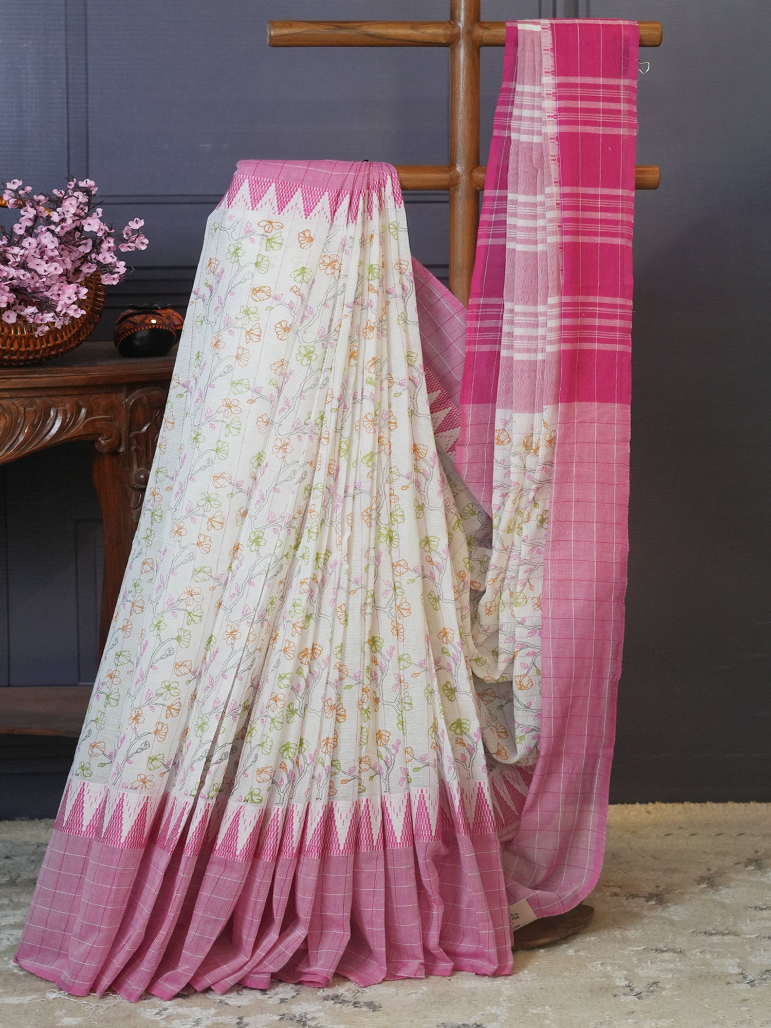 Mangalagiri cotton foral print contrast Border - Cream & Pink