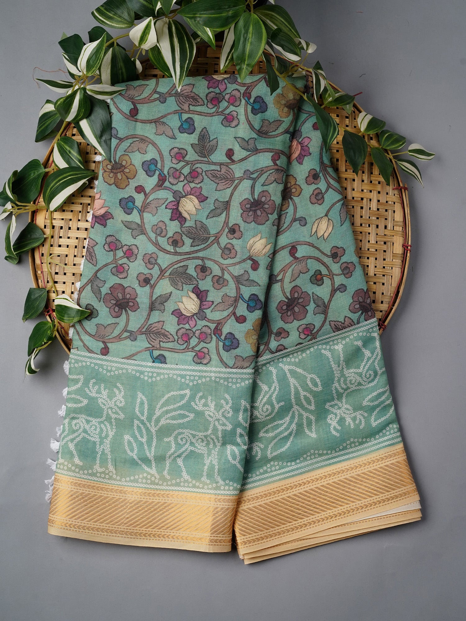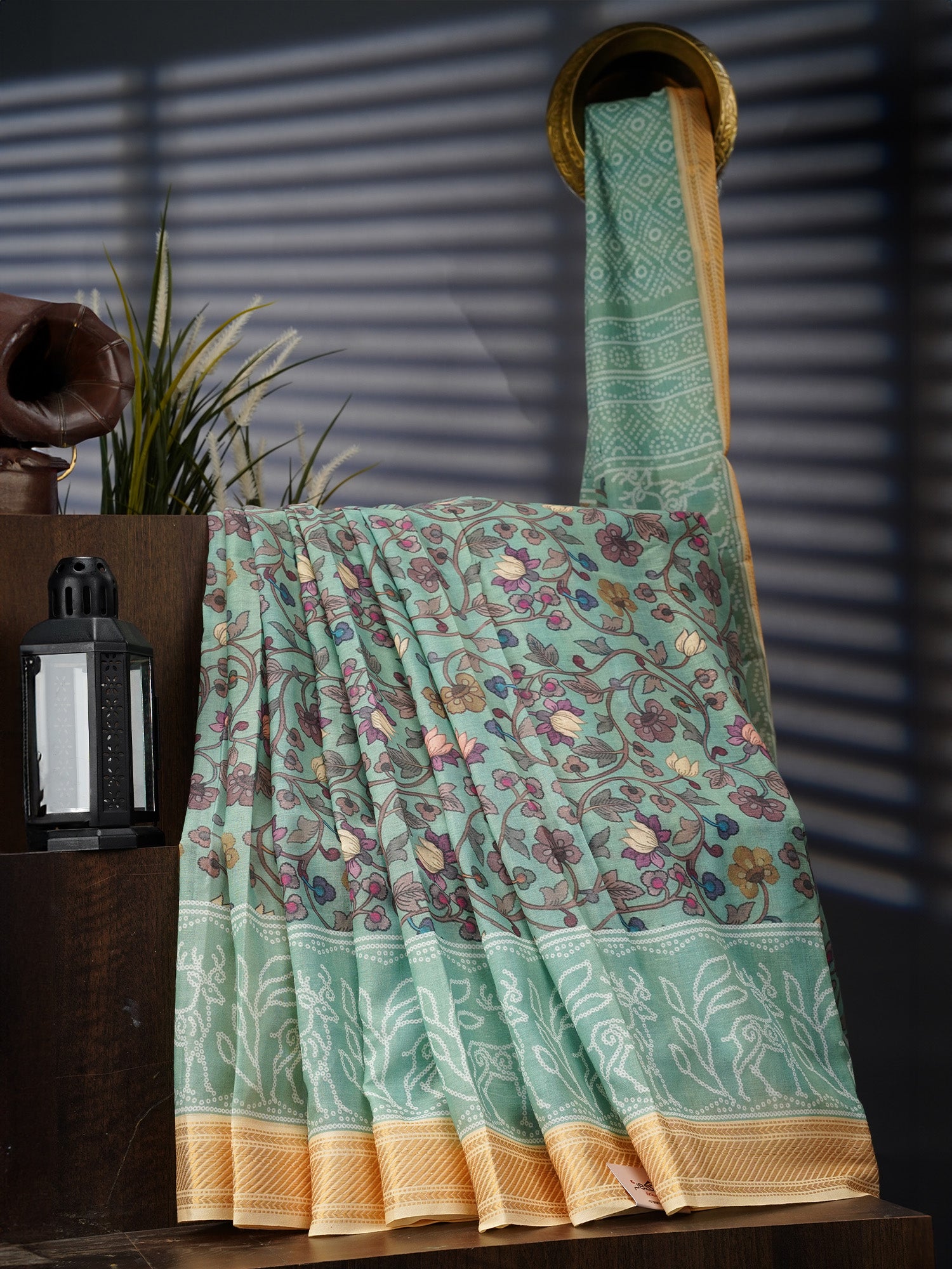 Mangalagiri Cotton Saree Digital Kalamkari Print With Contrast Border - Pista Green