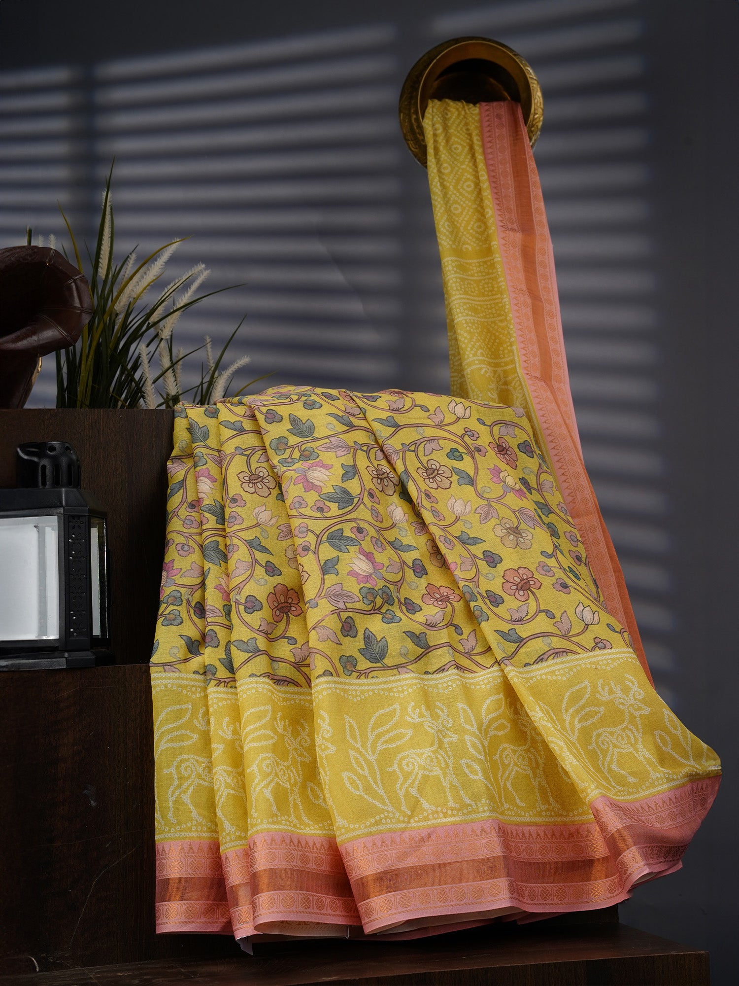 Mangalagiri Cotton Saree Digital Kalamkari Print With Contrast Border - Yellow & Green