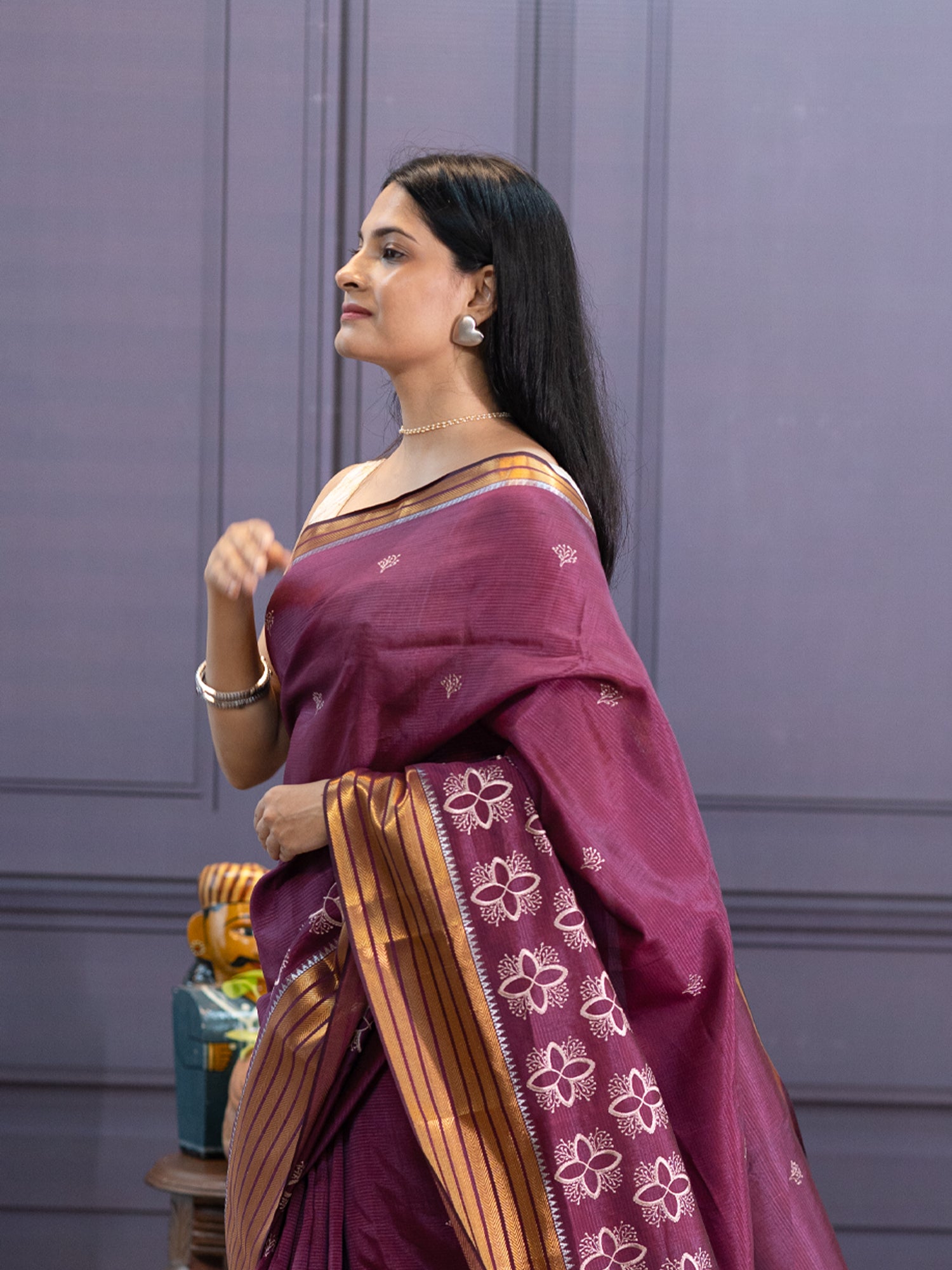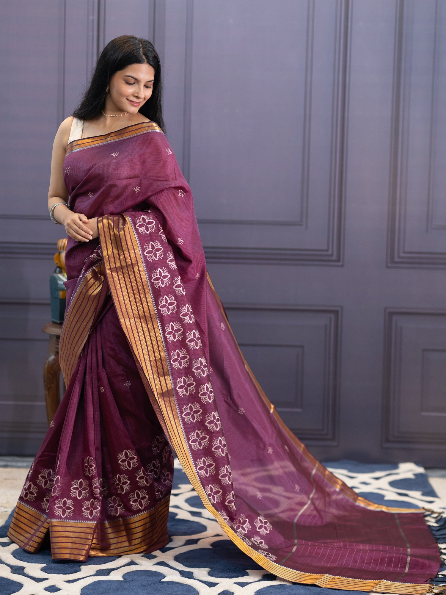 Drape yourself in timeless elegance with this stunning Mangalagiri silk saree, where traditional craftsmanship meets luxurious comfort. Adorned with intricate embroidery work and a gleaming zari border, this saree captures the essence of classic Indian weaving. The soft silk fabric flows beautifully, making it perfect for weddings, festivals, or special celebrations. Each piece tells a story of skilled artisanship, bringing grace and sophistication to your wardrobe. A true treasure for those who appreciate authentic handcrafted textiles.