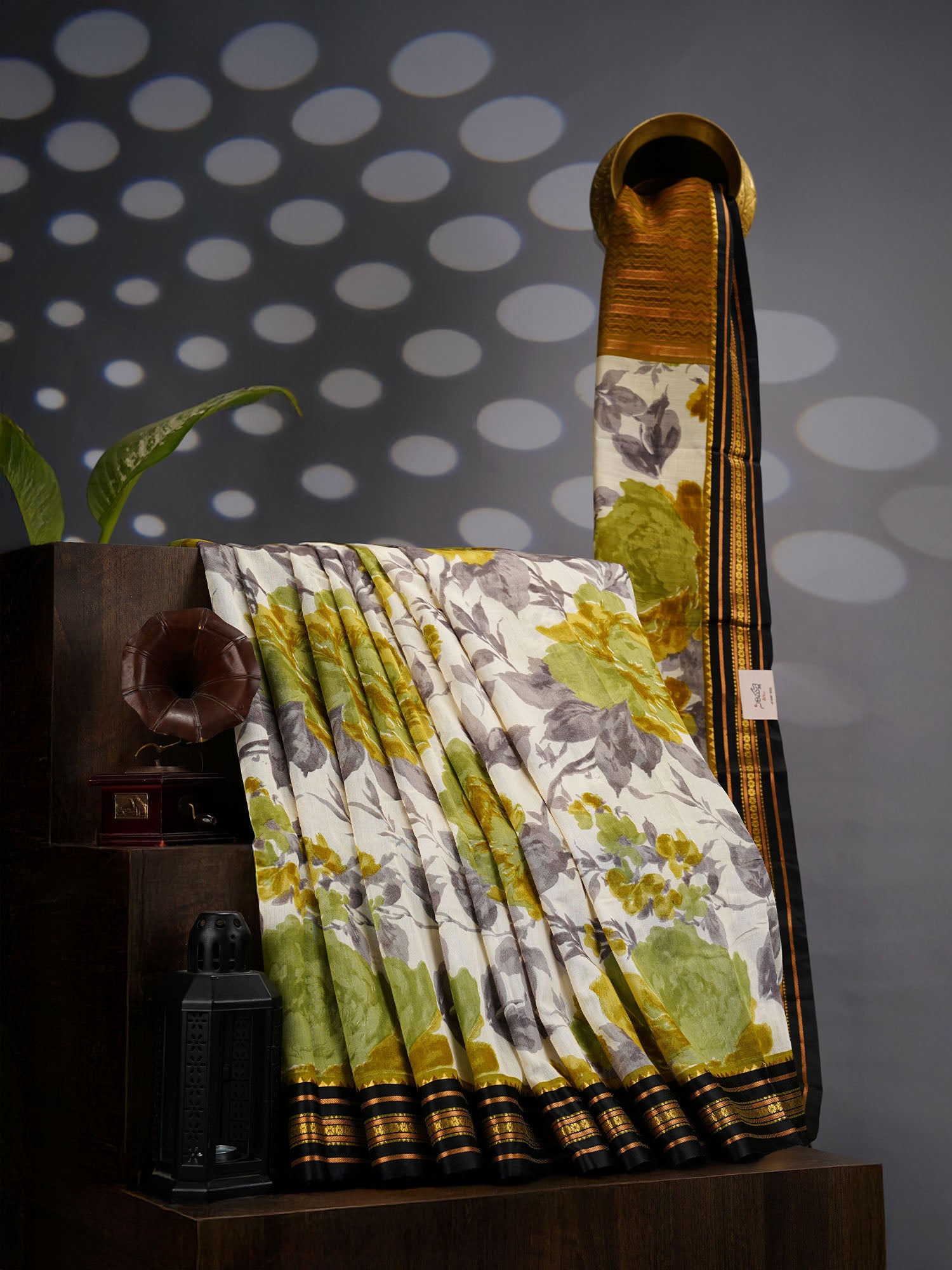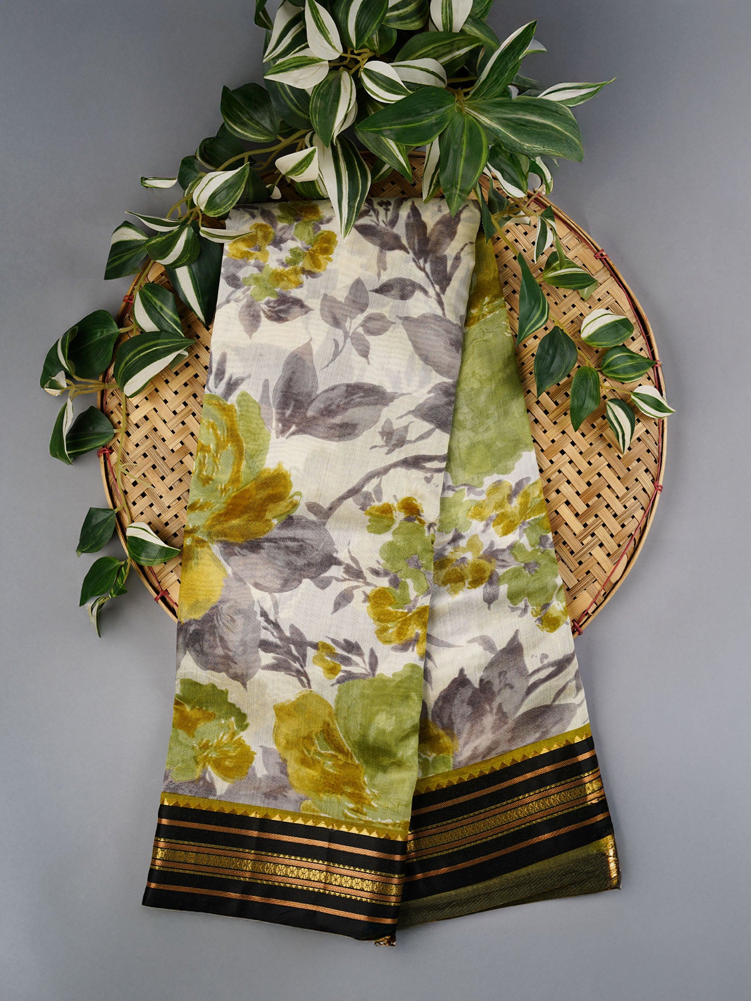 Mangalagiri Silk Saree with Floral Print and Contrast Border- Green