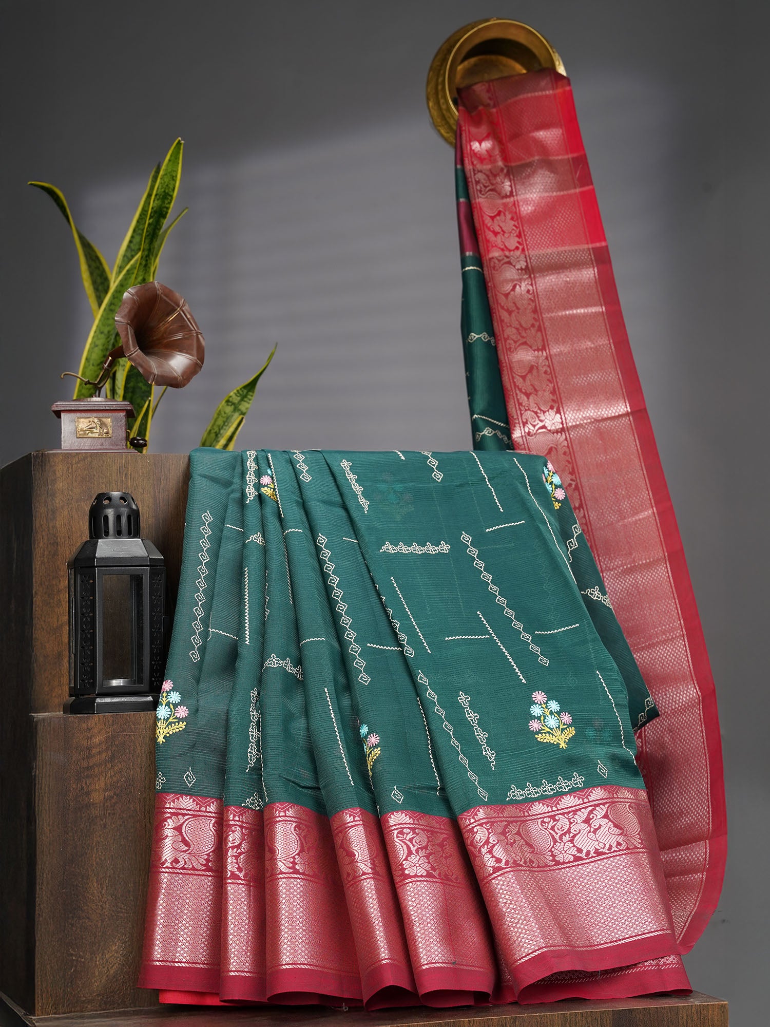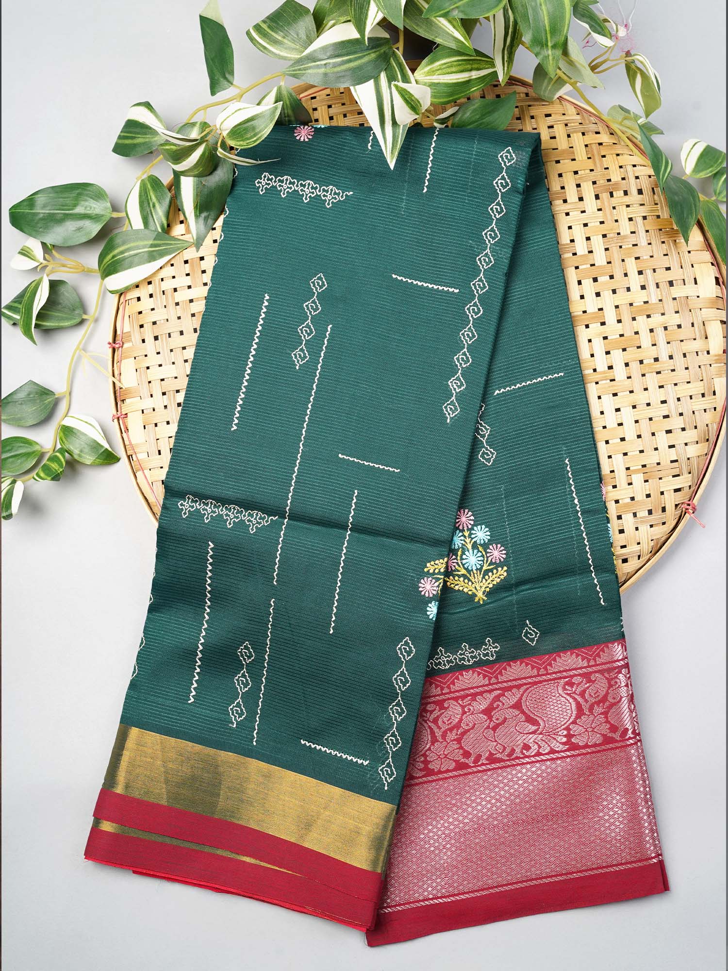 Drape yourself in timeless elegance with this stunning Mangalagiri silk saree! Crafted from luxurious silk, this beauty features intricate thread embroidery butties that dance across the fabric, complemented by shimmering silver zari accents. The rich bottle green hue exudes sophistication and pairs beautifully with any occasion—from festive celebrations to intimate gatherings. The delicate embroidery work showcases traditional craftsmanship, while the silver zari adds that perfect sparkle to make you shine. A wardrobe essential that blends heritage with contemporary style, this saree is your ticket to turning heads and feeling absolutely fabulous!