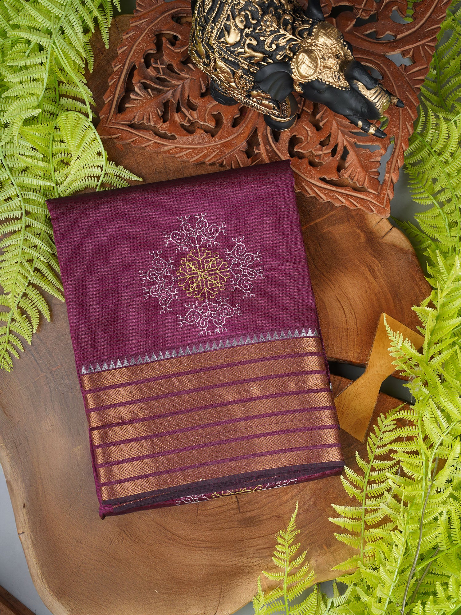 Mangalagiri silk saree with thread embroidery work and contrast border - Purple