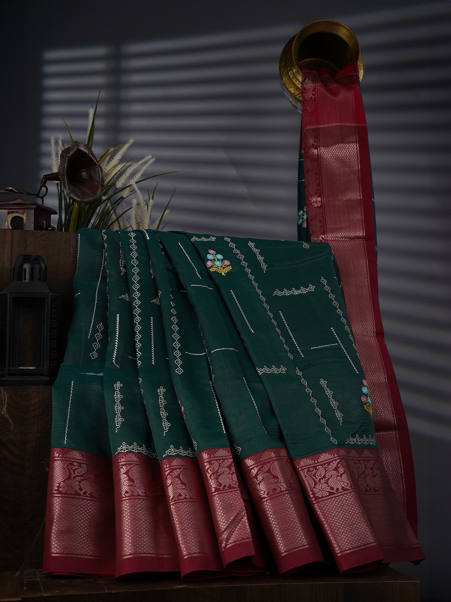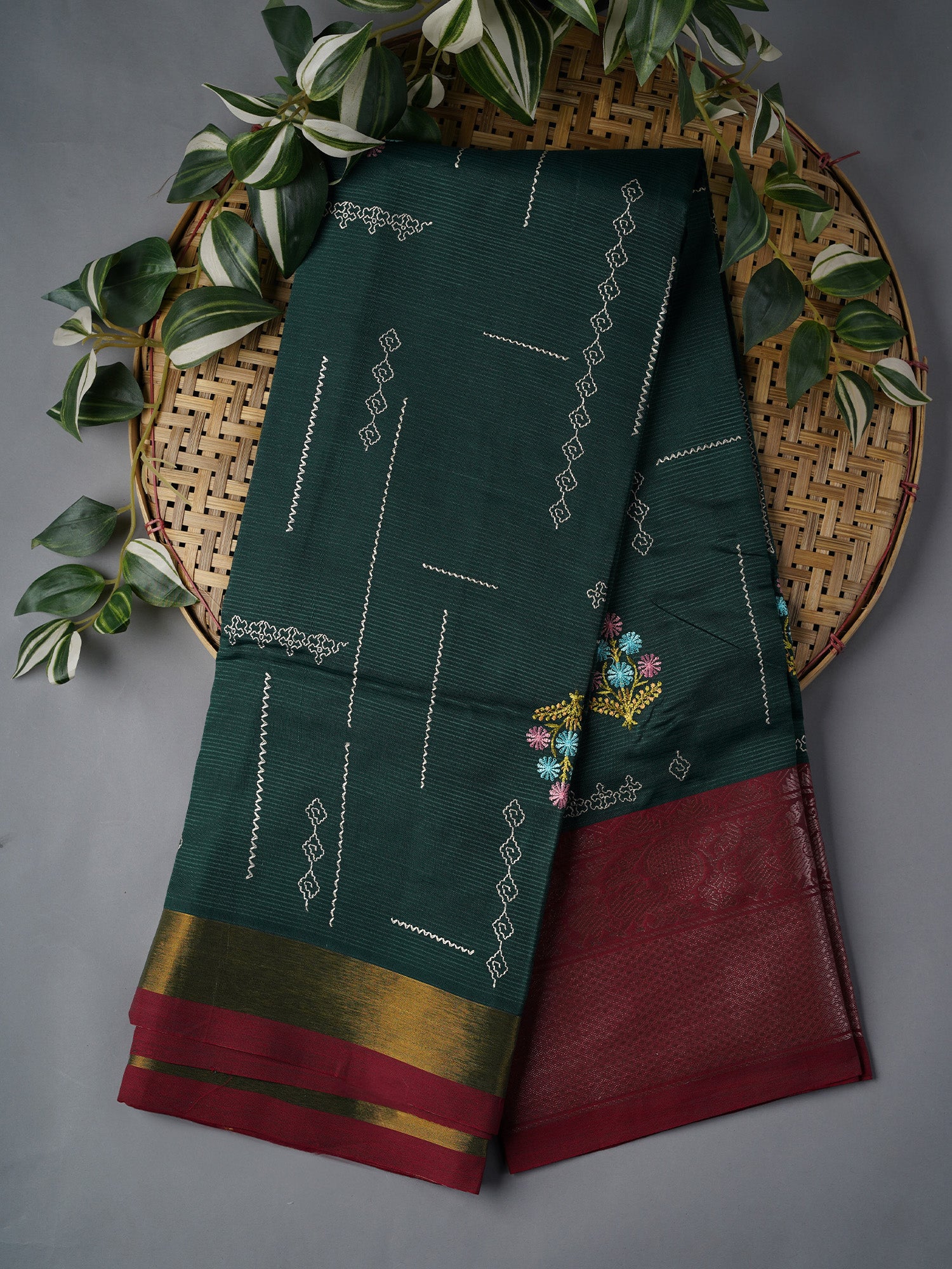 Mangalagiri Silk With Thread Embroidery Work And Contrast Border - Bottle Green