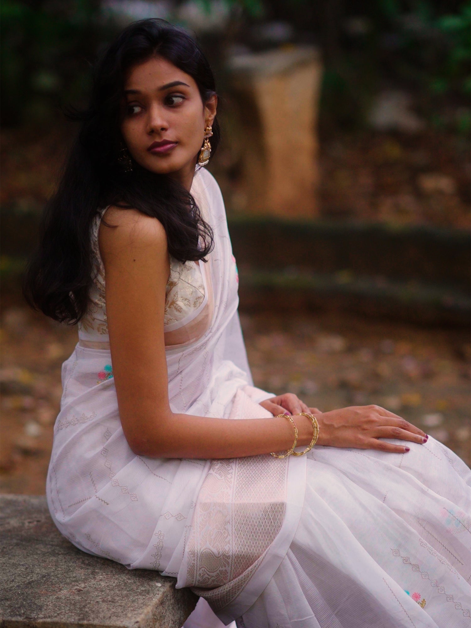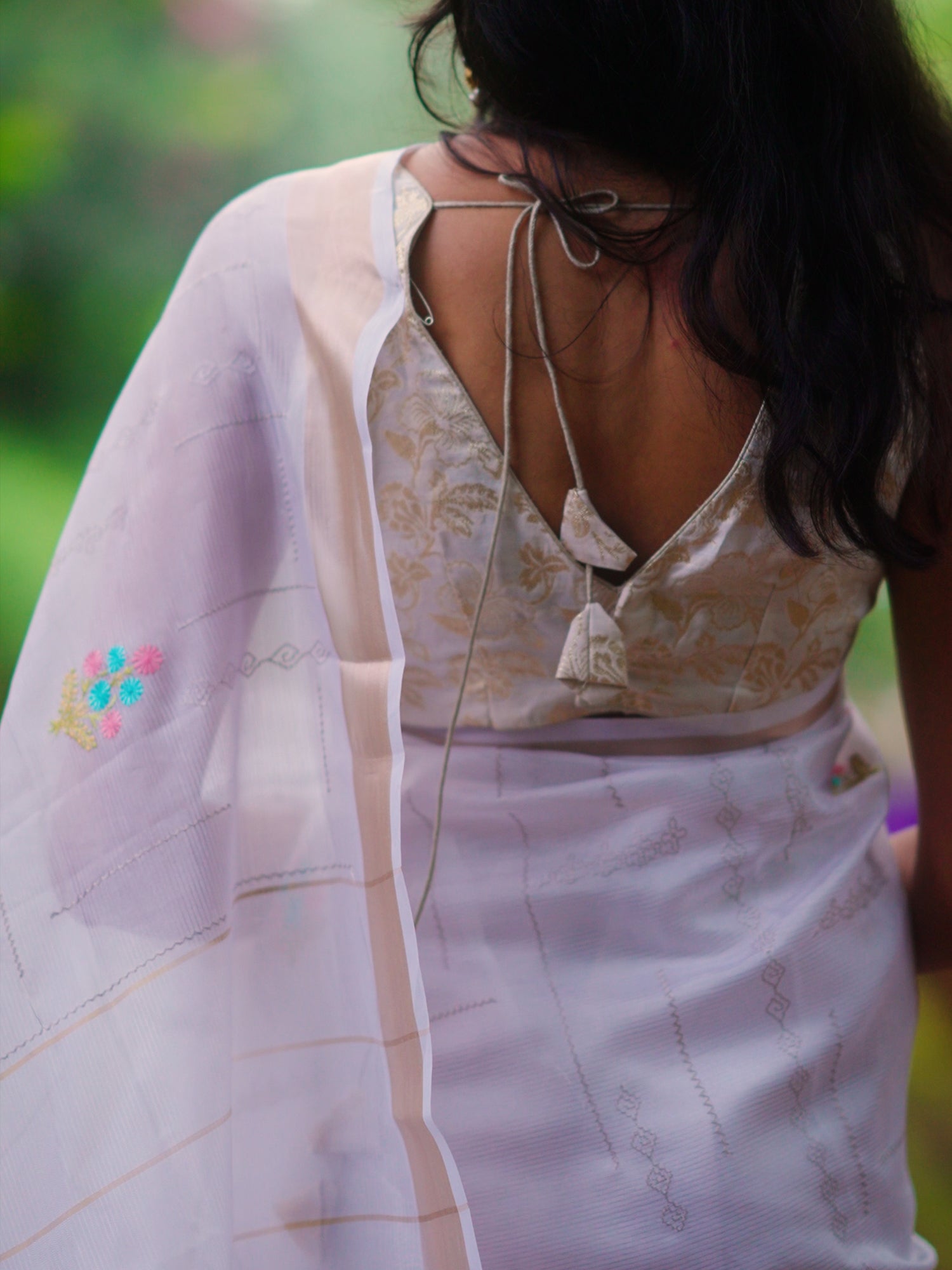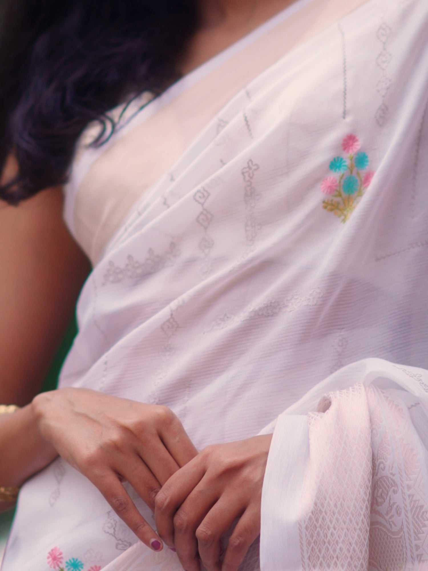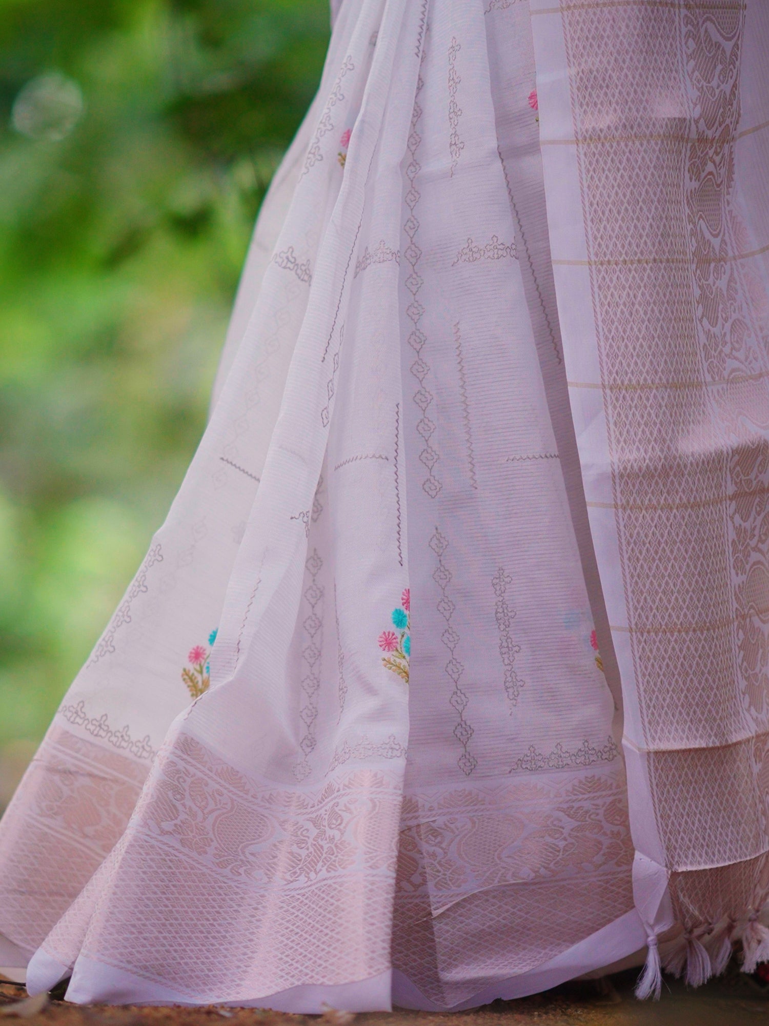 Mangalagiri Silk With Thread Embroidery Work and Silver Zari Border - White